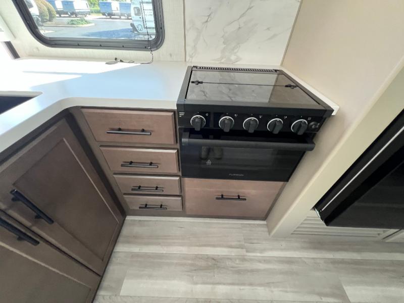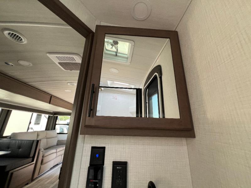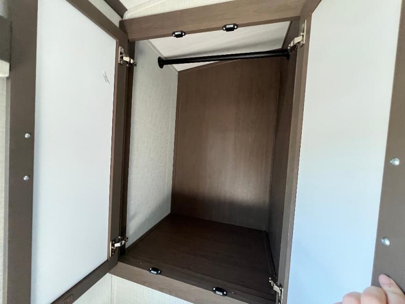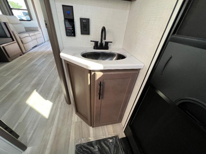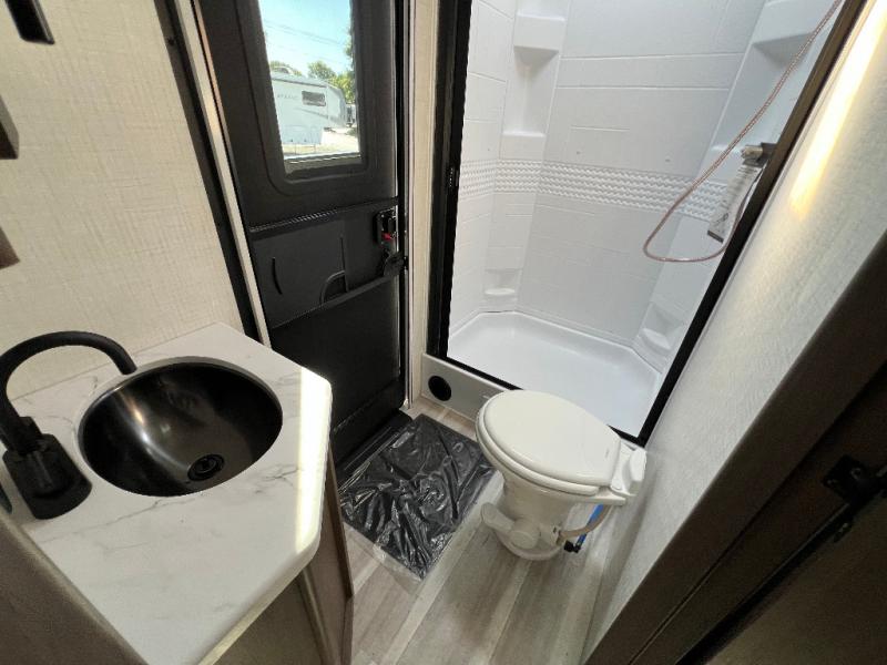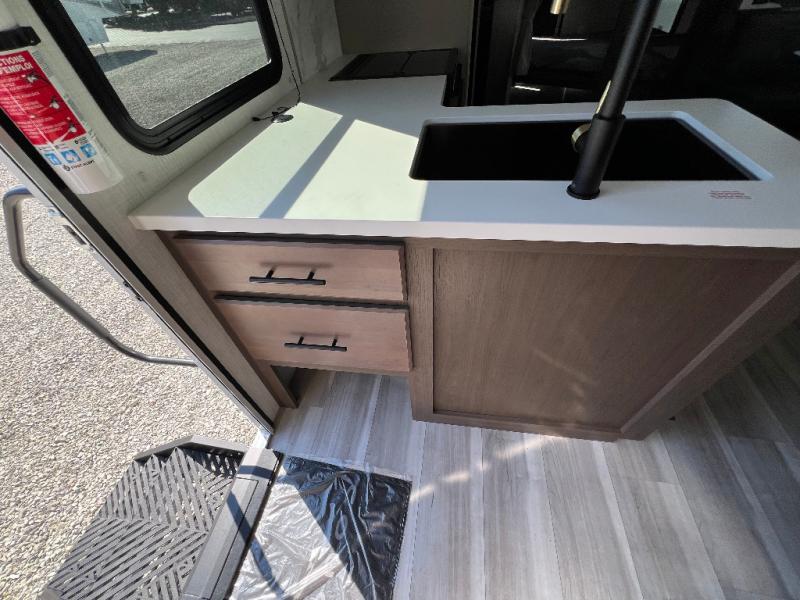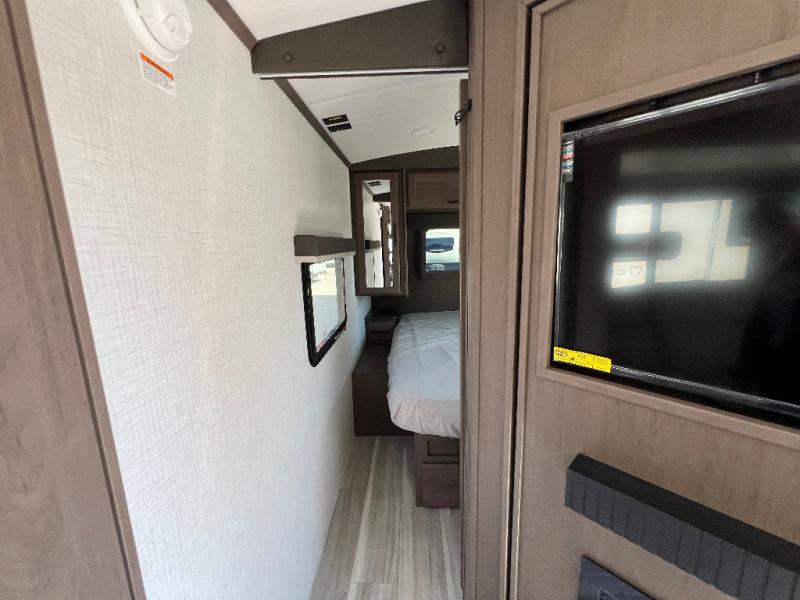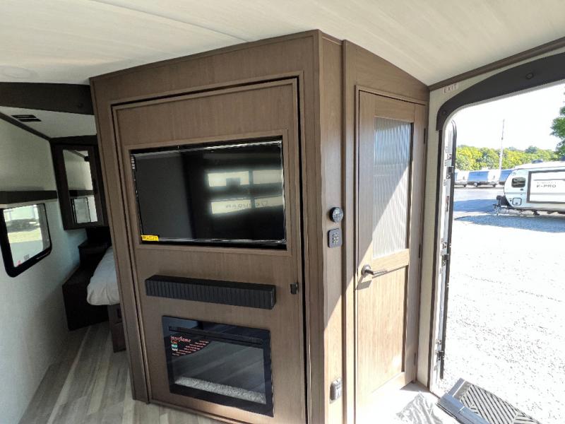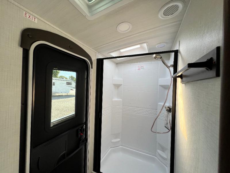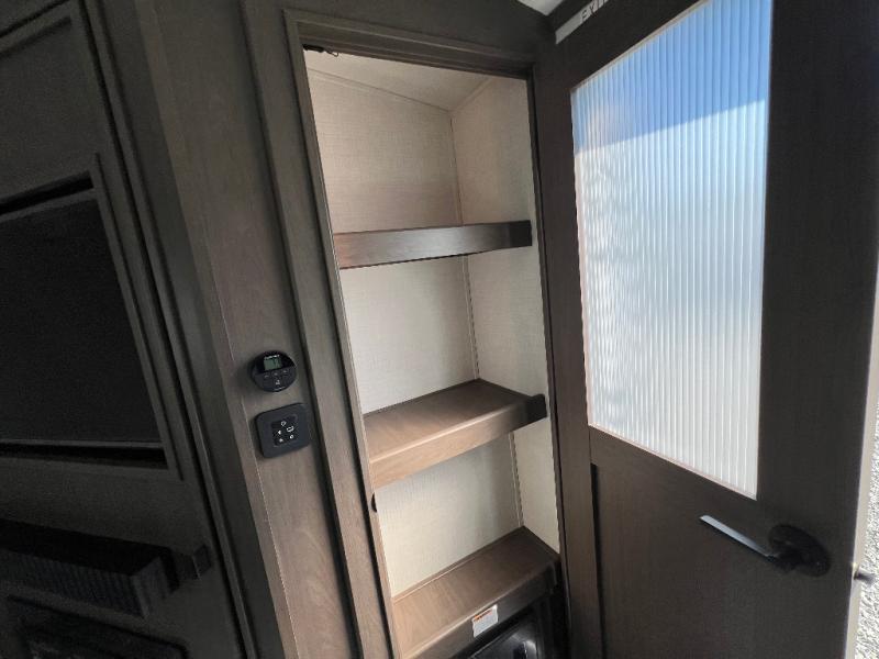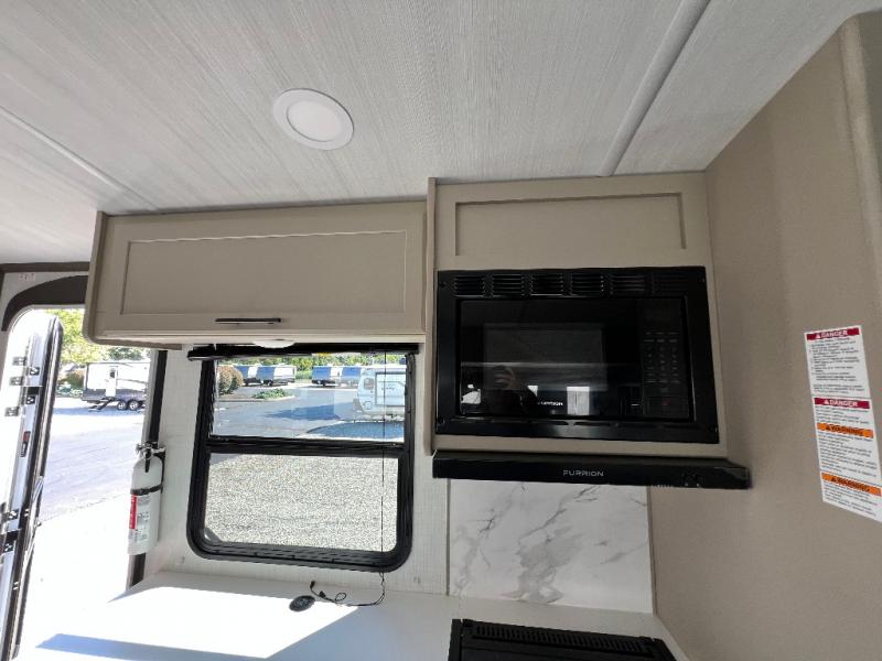 With dual entry doors in this travel trailer, you can enter in through the main living area or the full bath for convenience! Once inside, the sleeper sofa and booth dinette provide places to relax, eat, and play games, plus there is an entertainment center with hidden storage behind to keep movies organized. A full kitchen with a three burner cooktop and 12V refrigerator will allow you to cook and store food, or you can head outdoors to use the outdoor kitchen prep area. There is also drop-frame storage outside for fishing poles and hiking gear, and the 21' electric awning provides shade as you relax. When it's time to call it a night, the king bed in the front private bedroom is sure to bring comfort, while the little ones take the double-size bunks, and any other guests can sleep on the living room furniture!