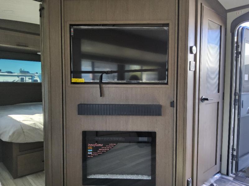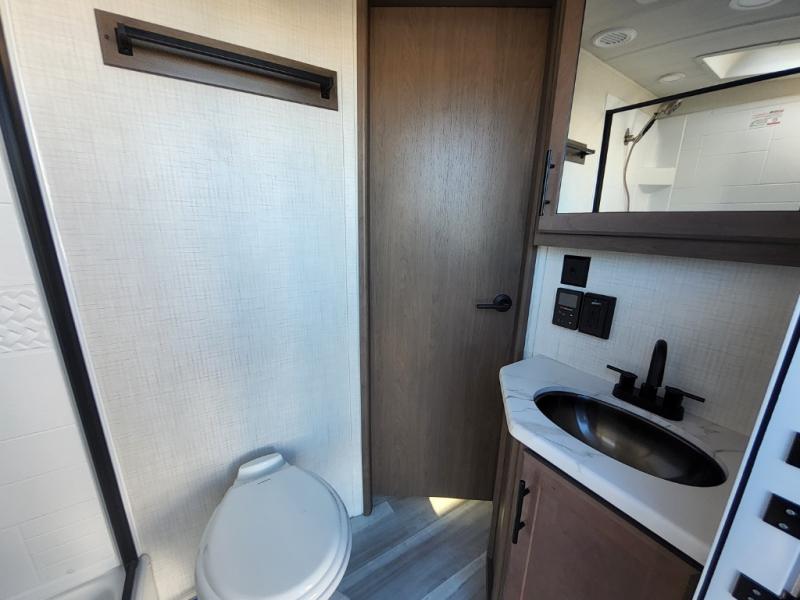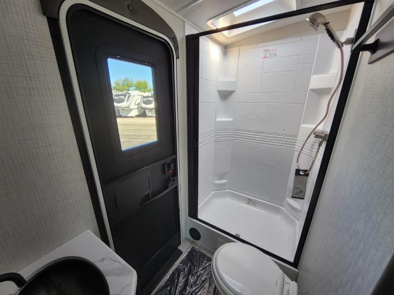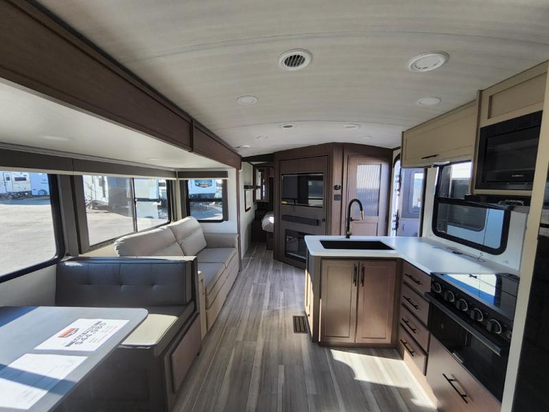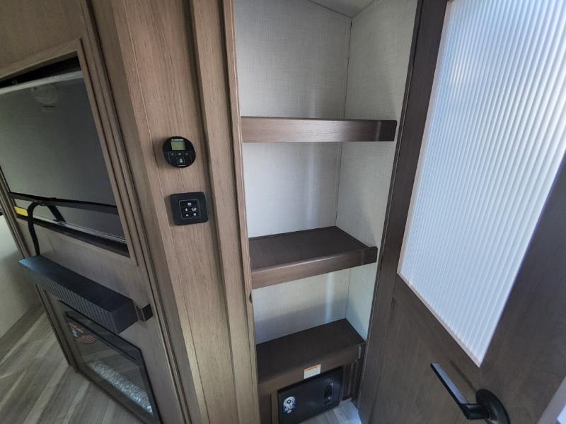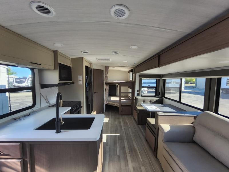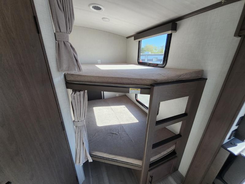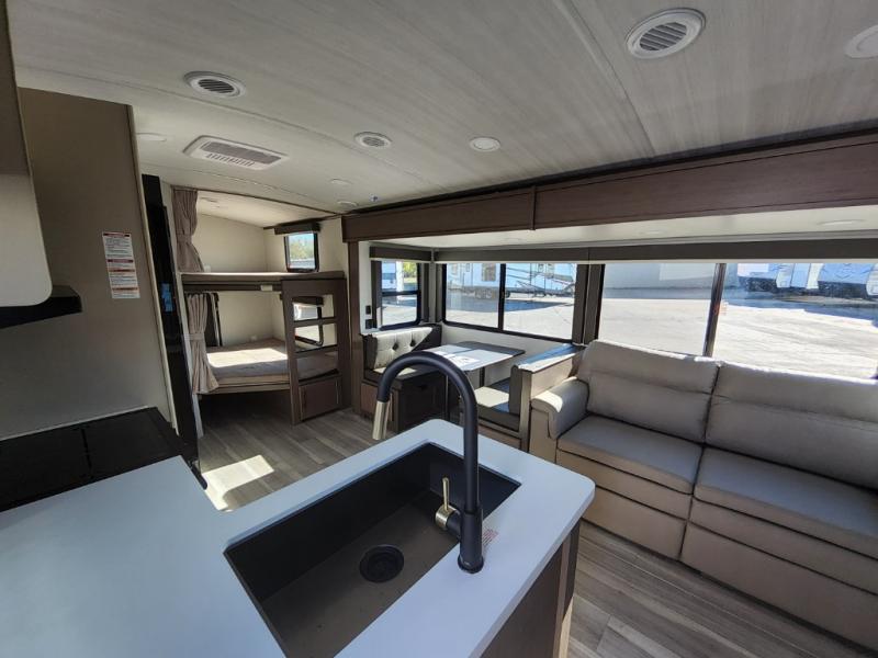 With dual entry doors in this travel trailer, you can enter in through the main living area or the full bath for convenience! Once inside, the sleeper sofa and booth dinette provide places to relax, eat, and play games, plus there is an entertainment center with hidden storage behind to keep movies organized. A full kitchen with a three burner cooktop and 12V refrigerator will allow you to cook and store food, or you can head outdoors to use the outdoor kitchen prep area. There is also drop-frame storage outside for fishing poles and hiking gear, and the 21' electric awning provides shade as you relax. When it's time to call it a night, the king bed in the front private bedroom is sure to bring comfort, while the little ones take the double-size bunks, and any other guests can sleep on the living room furniture!