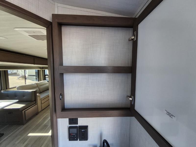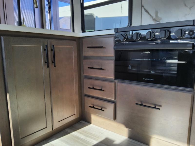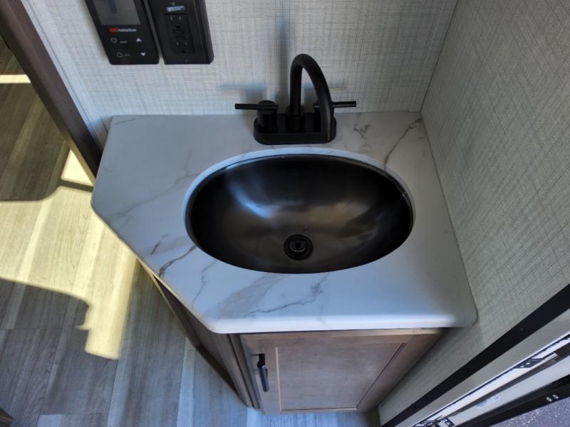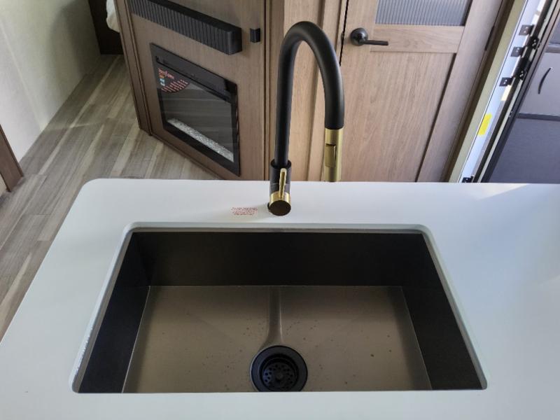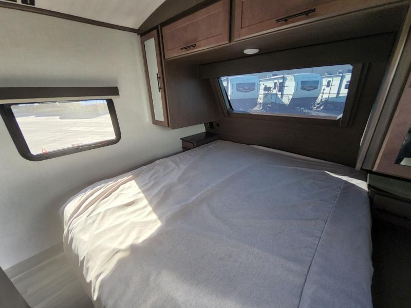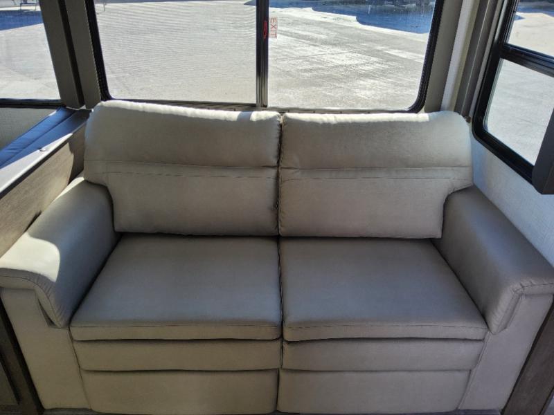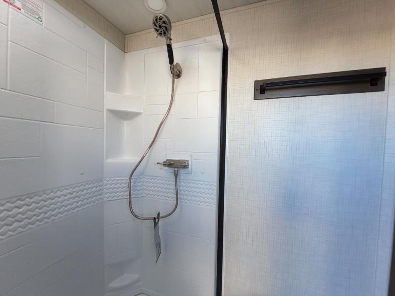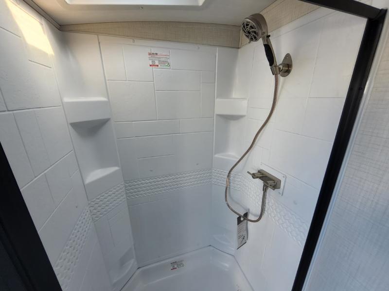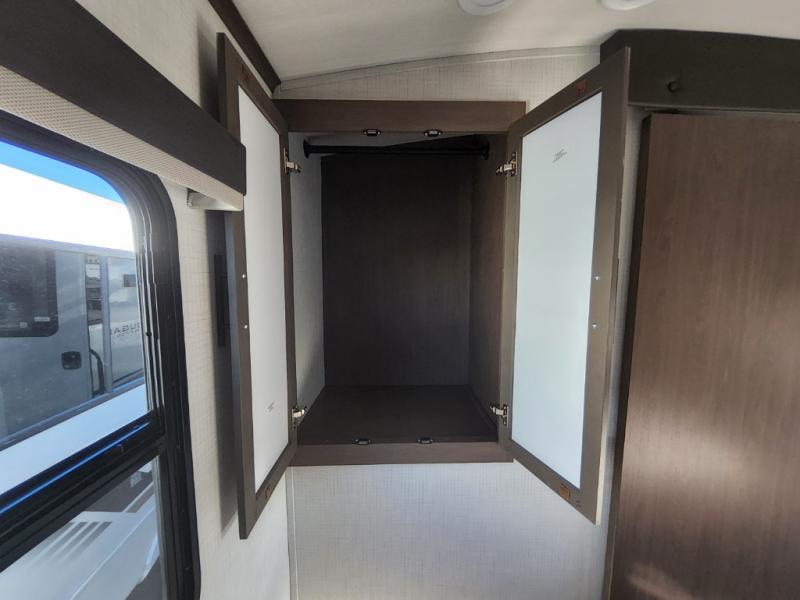 With dual entry doors in this travel trailer, you can enter in through the main living area or the full bath for convenience! Once inside, the sleeper sofa and booth dinette provide places to relax, eat, and play games, plus there is an entertainment center with hidden storage behind to keep movies organized. A full kitchen with a three burner cooktop and 12V refrigerator will allow you to cook and store food, or you can head outdoors to use the outdoor kitchen prep area. There is also drop-frame storage outside for fishing poles and hiking gear, and the 21' electric awning provides shade as you relax. When it's time to call it a night, the king bed in the front private bedroom is sure to bring comfort, while the little ones take the double-size bunks, and any other guests can sleep on the living room furniture!