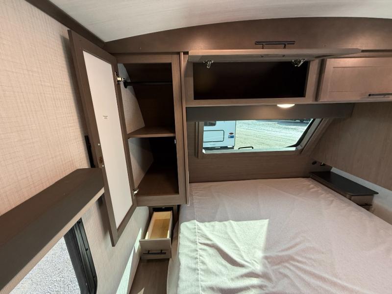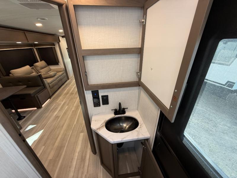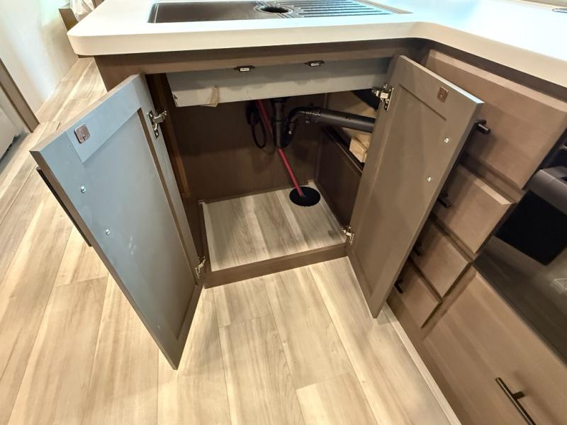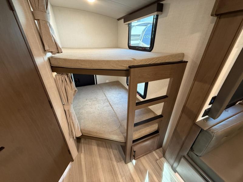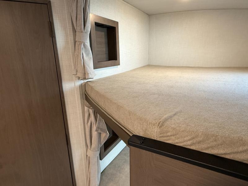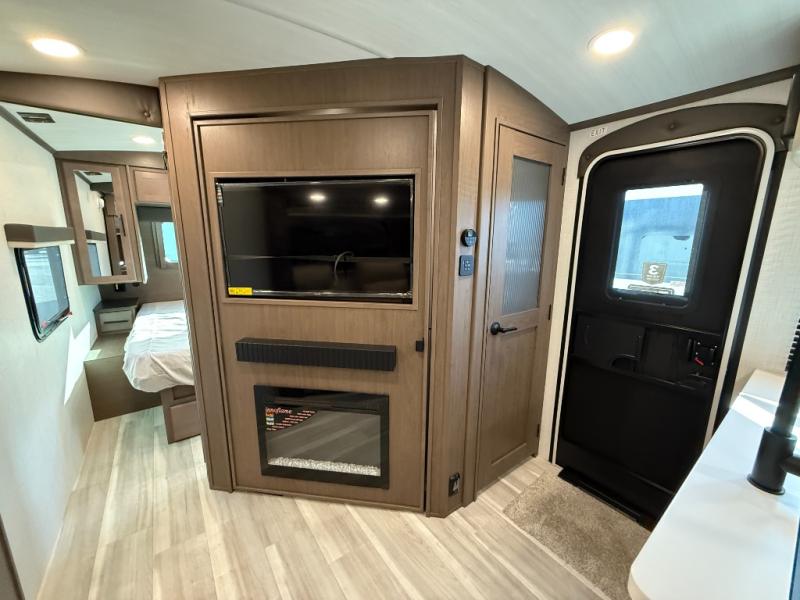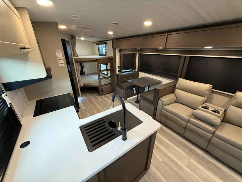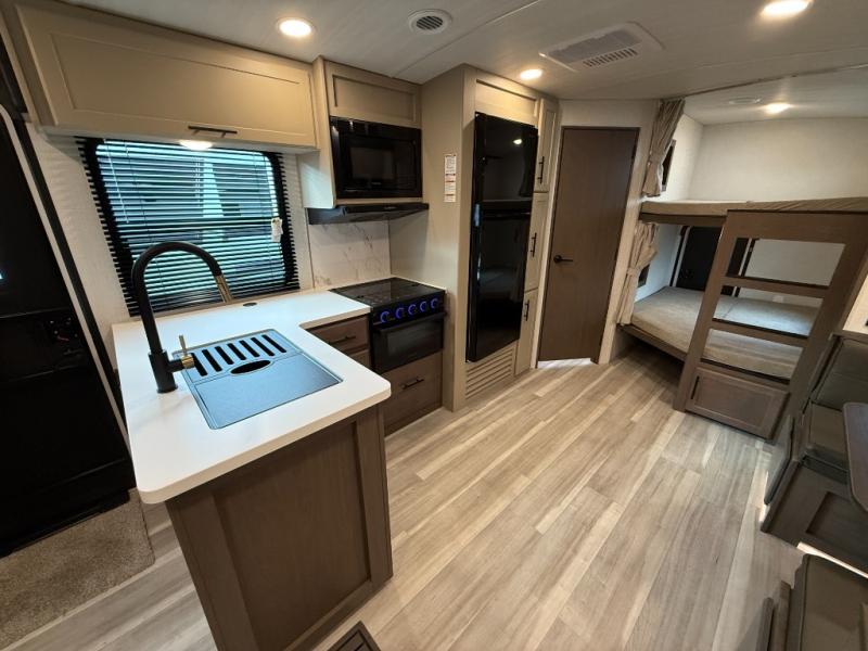 With dual entry doors in this travel trailer, you can enter in through the main living area or the full bath for convenience! Once inside, the sleeper sofa and booth dinette provide places to relax, eat, and play games, plus there is an entertainment center with hidden storage behind to keep movies organized. A full kitchen with a three burner cooktop and 12V refrigerator will allow you to cook and store food, or you can head outdoors to use the outdoor kitchen prep area. There is also drop-frame storage outside for fishing poles and hiking gear, and the 21' electric awning provides shade as you relax. When it's time to call it a night, the king bed in the front private bedroom is sure to bring comfort, while the little ones take the double-size bunks, and any other guests can sleep on the living room furniture!
