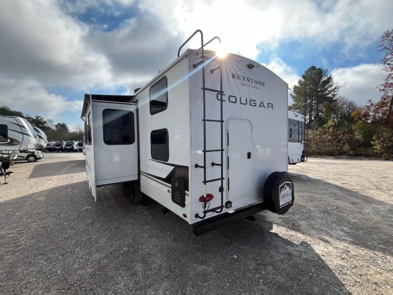 The Keystone Cougar Half-Ton fifth wheel and travel trailers are known as one of America's favorites for a reason! Some of those reasons are the exclusive features that come from Keystone, like the Winegard Air 360+ omni-directional rooftop antenna, the in-floor heating ducts, and the HyperCore composite wall construction with Vixen Fibrogloss high-gloss finish. The Cougar Half-Ton has a Climate Guard protection package with heat-deflecting white sidewalls, two roof attic vents, PEX plumbing and more to enjoy four season camping. Inside, you'll love the dimmable lighting, night roller shades throughout, shower skylight, and bedside USB outlets to keep your electronics charged.