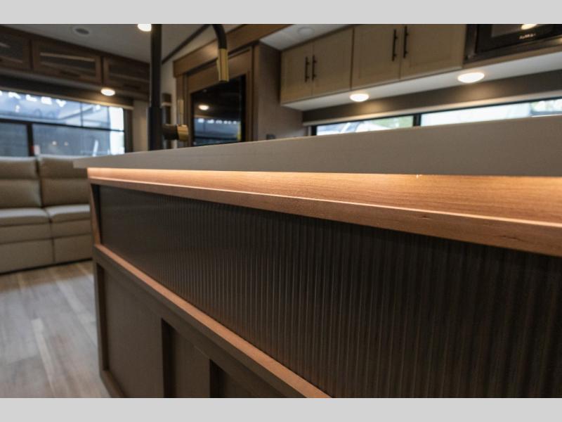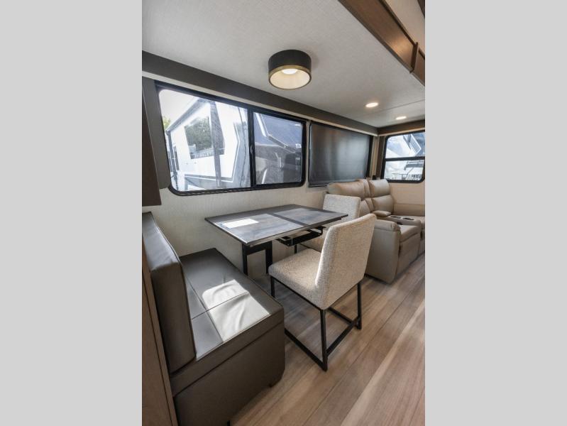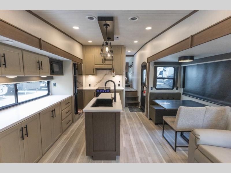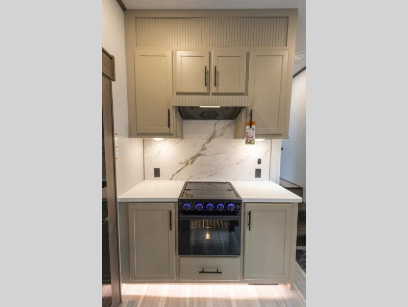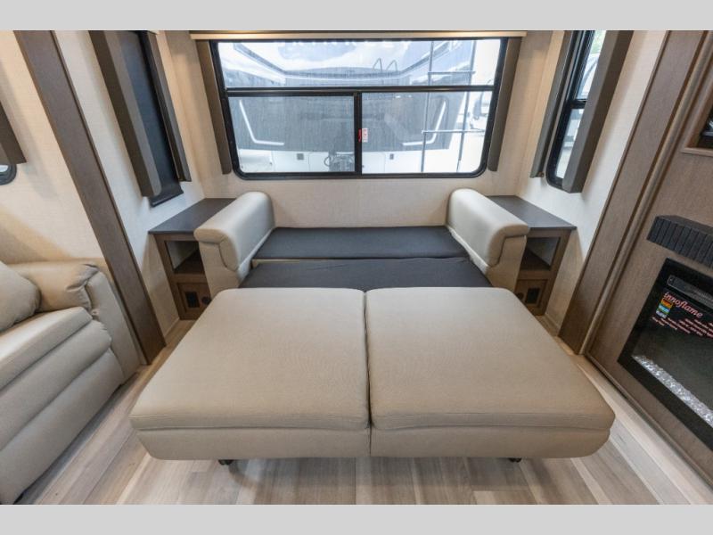 You will have the time of your life in this Cougar Half-Ton fifth wheel! There is so much comfort with the theater seating and tri-fold sleeper sofa with end tables in the living area. You also have lots of space in this area because of the opposing slides, so you can work freely around the kitchen island preparing dinner or washing dishes. The booth dinette is right next to the kitchen, so you won't have to go far to set the table. If you don't need the dinette to double as a bed, then you might be interested in switching it out for the optional free-standing table with chairs and an ottoman. You will also love the gourmet kitchen prep space with ample counter space to make your best meals!