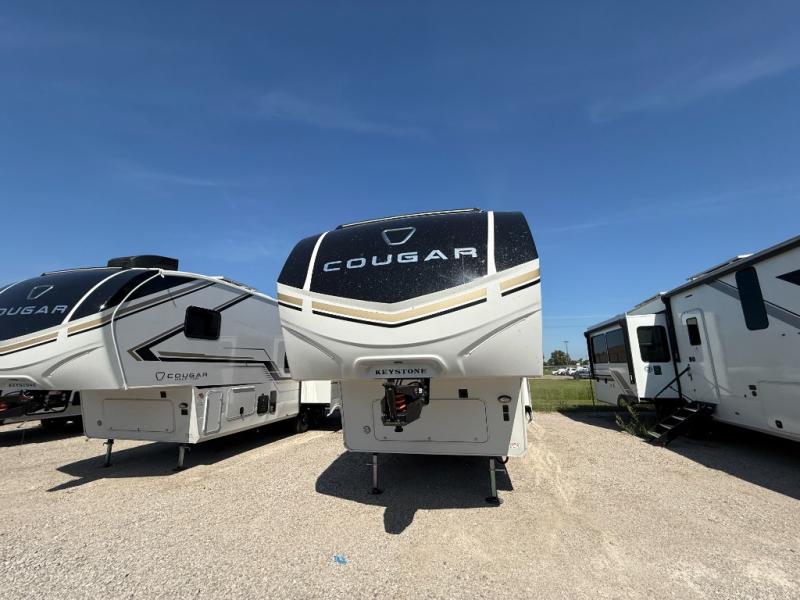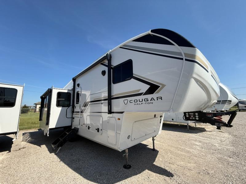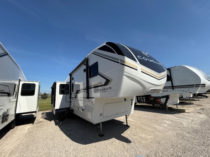 The Keystone Cougar Half-Ton fifth wheel and travel trailers are known as one of America's favorites for a reason! Some of those reasons are the exclusive features that come from Keystone, like the Winegard Air 360+ omni-directional rooftop antenna, the in-floor heating ducts, and the HyperCore composite wall construction with Vixen Fibrogloss high-gloss finish. The Cougar Half-Ton has a Climate Guard protection package with heat-deflecting white sidewalls, two roof attic vents, PEX plumbing and more to enjoy four season camping. Inside, you'll love the dimmable lighting, night roller shades throughout, shower skylight, and bedside USB outlets to keep your electronics charged.