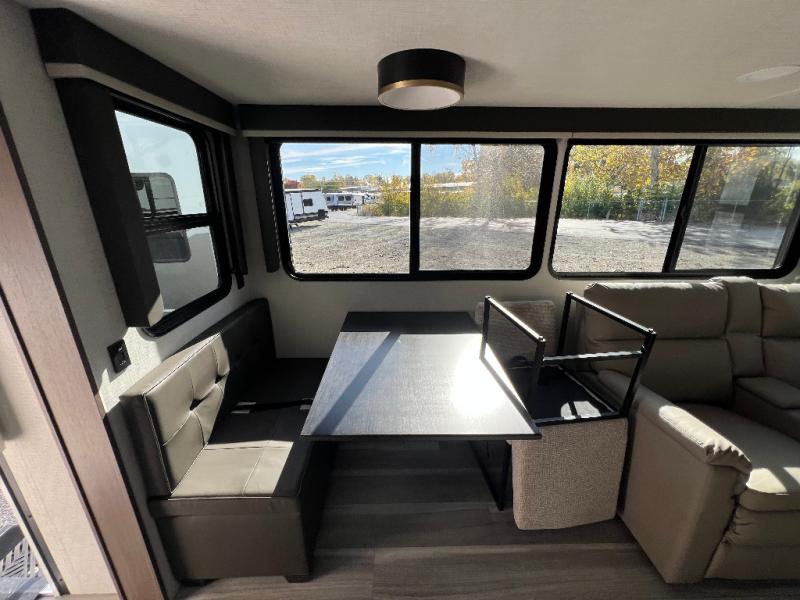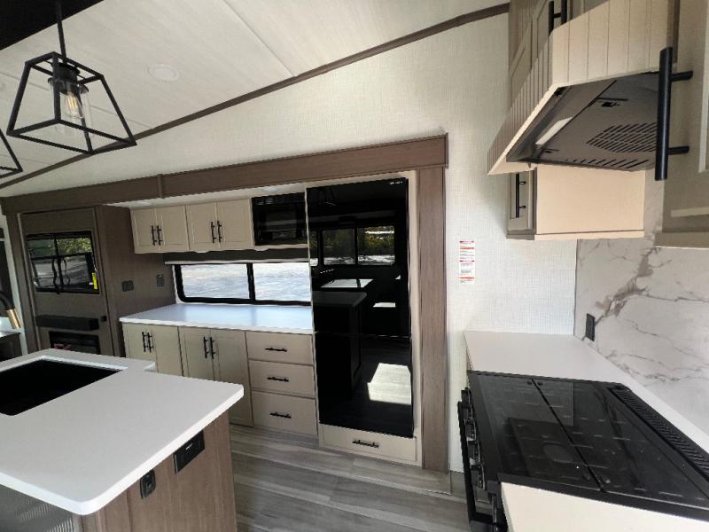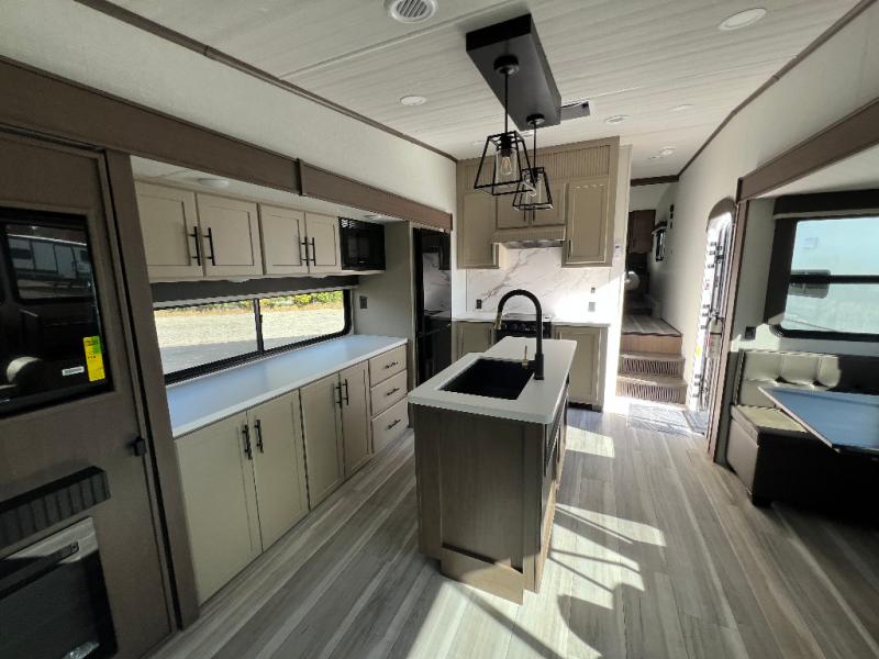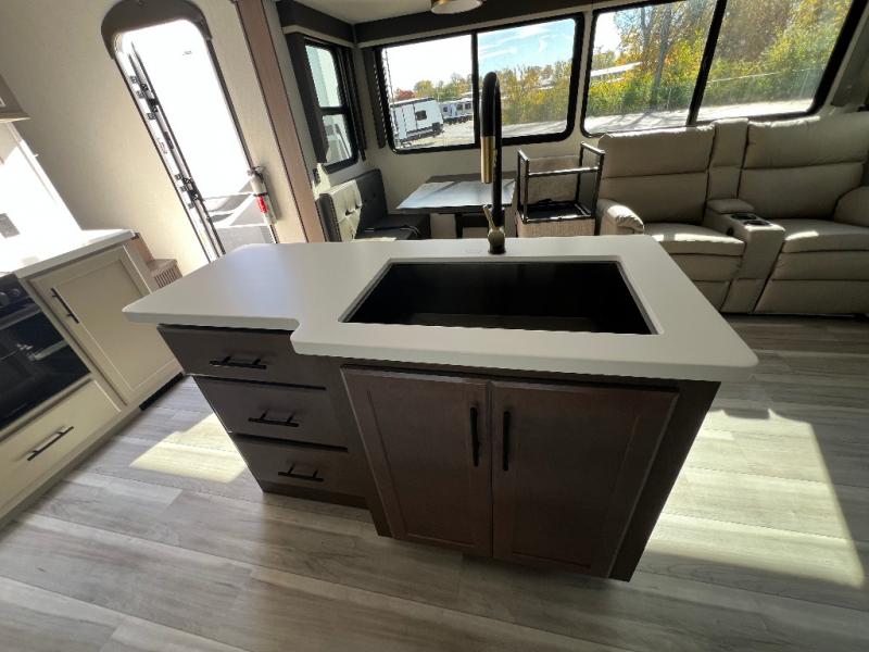 You will have the time of your life in this Cougar Half-Ton fifth wheel! There is so much comfort with the theater seating and tri-fold sleeper sofa with end tables in the living area. You also have lots of space in this area because of the opposing slides, so you can work freely around the kitchen island preparing dinner or washing dishes. The booth dinette is right next to the kitchen, so you won't have to go far to set the table. If you don't need the dinette to double as a bed, then you might be interested in switching it out for the optional free-standing table with chairs and an ottoman. You will also love the gourmet kitchen prep space with ample counter space to make your best meals!