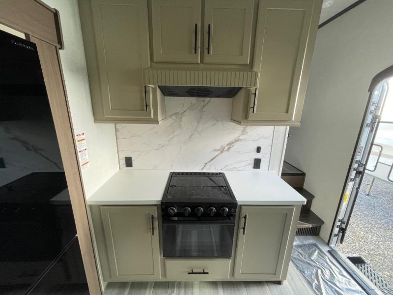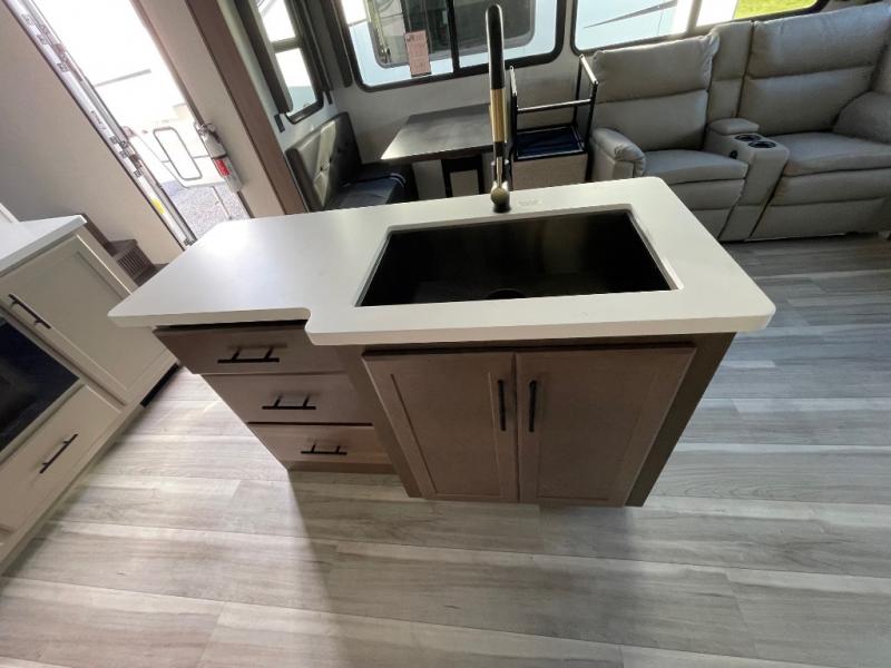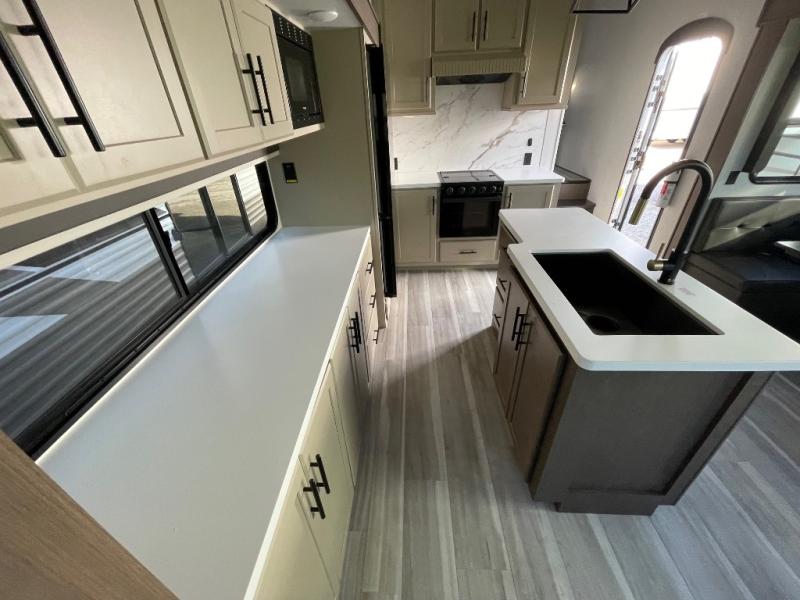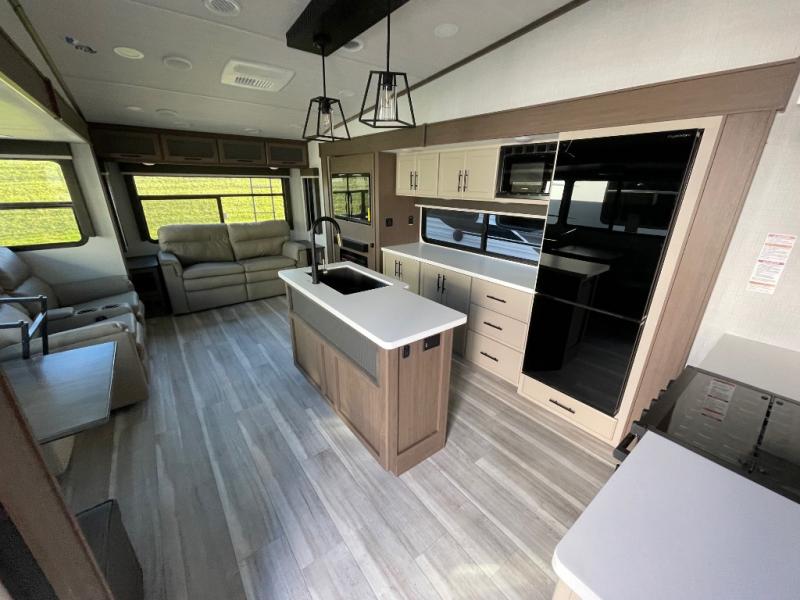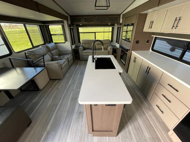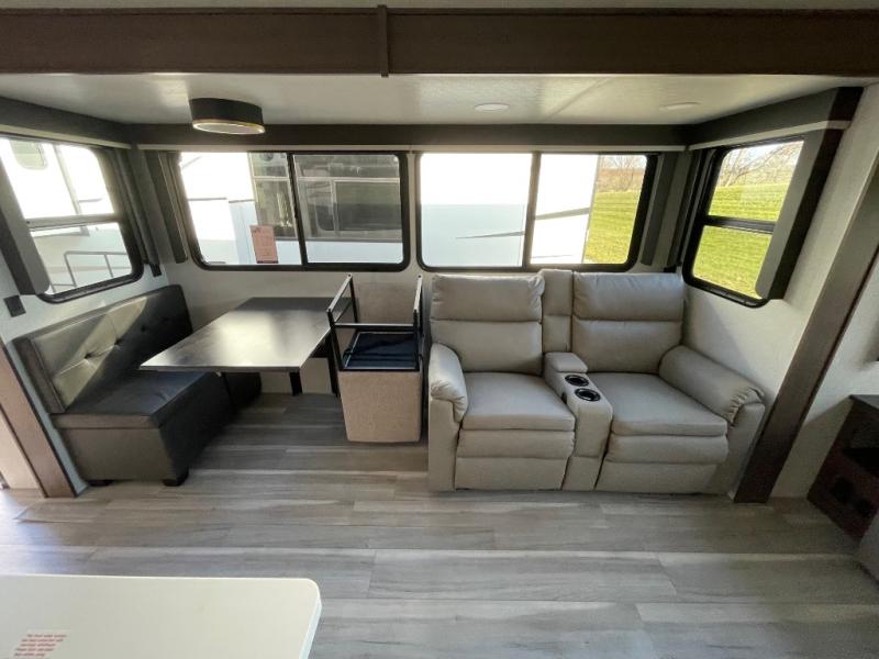 You will have the time of your life in this Cougar Half-Ton fifth wheel! There is so much comfort with the theater seating and tri-fold sleeper sofa with end tables in the living area. You also have lots of space in this area because of the opposing slides, so you can work freely around the kitchen island preparing dinner or washing dishes. The booth dinette is right next to the kitchen, so you won't have to go far to set the table. If you don't need the dinette to double as a bed, then you might be interested in switching it out for the optional free-standing table with chairs and an ottoman. You will also love the gourmet kitchen prep space with ample counter space to make your best meals!