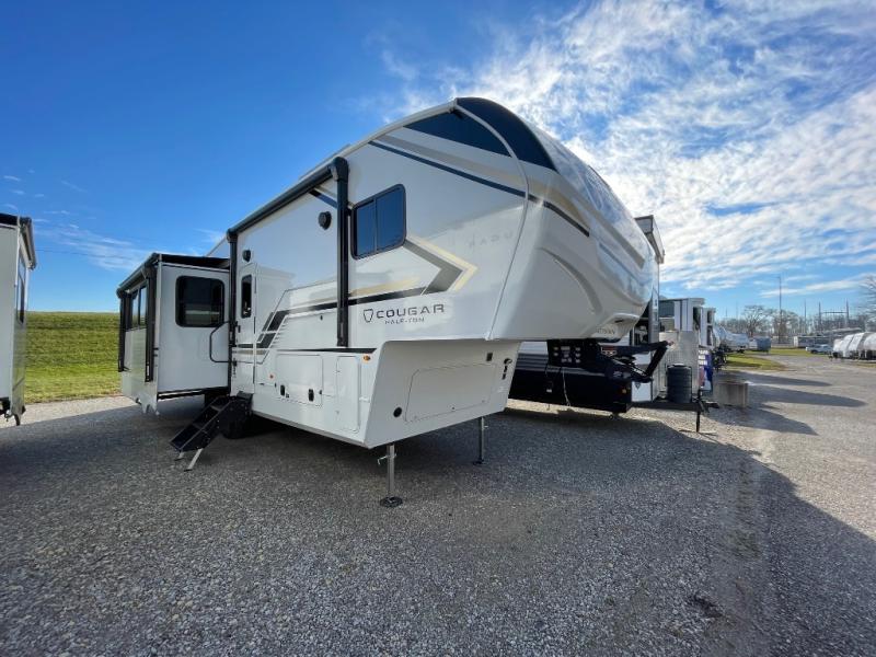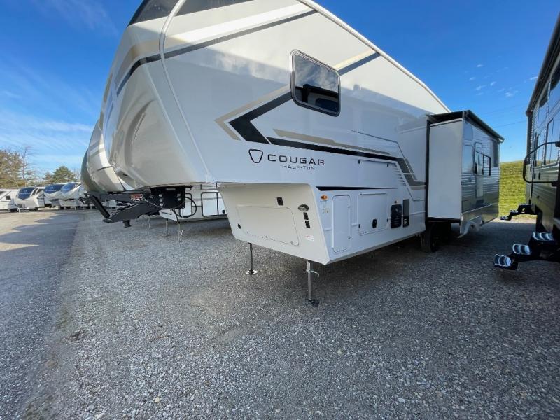 The Keystone Cougar Half-Ton fifth wheel and travel trailers are known as one of America's favorites for a reason! Some of those reasons are the exclusive features that come from Keystone, like the Winegard Air 360+ omni-directional rooftop antenna, the in-floor heating ducts, and the HyperCore composite wall construction with Vixen Fibrogloss high-gloss finish. The Cougar Half-Ton has a Climate Guard protection package with heat-deflecting white sidewalls, two roof attic vents, PEX plumbing and more to enjoy four season camping. Inside, you'll love the dimmable lighting, night roller shades throughout, shower skylight, and bedside USB outlets to keep your electronics charged.