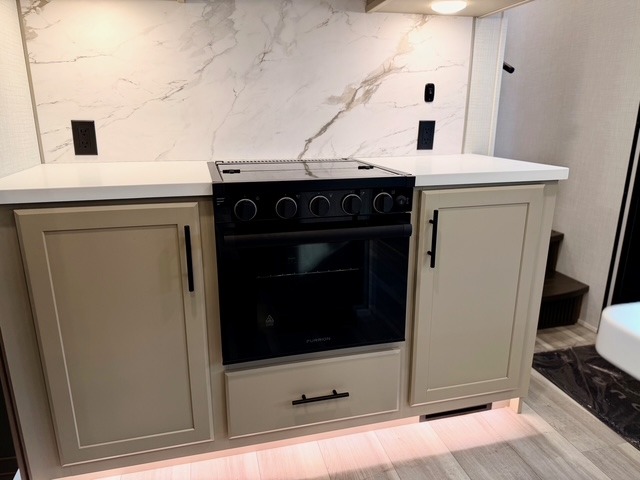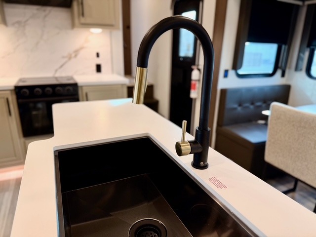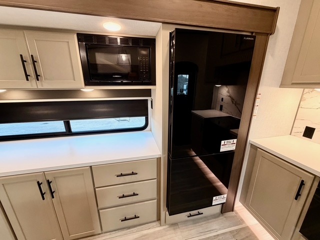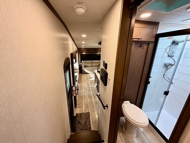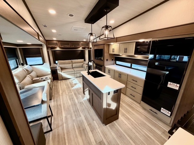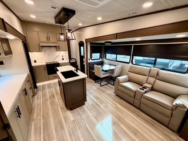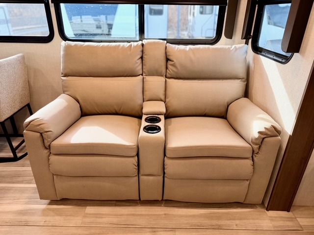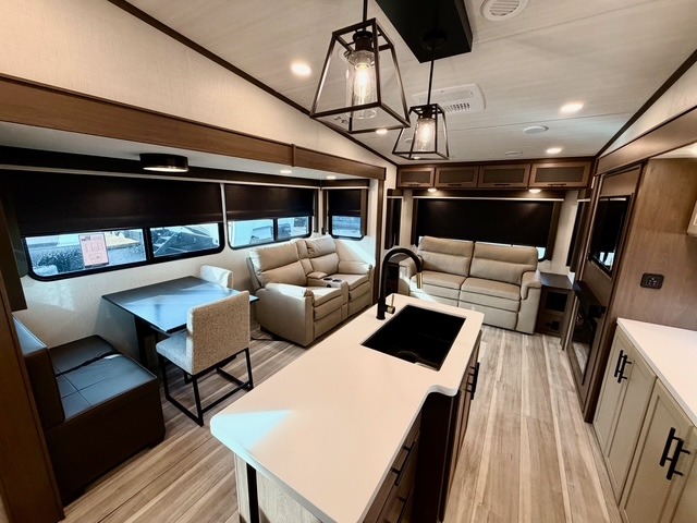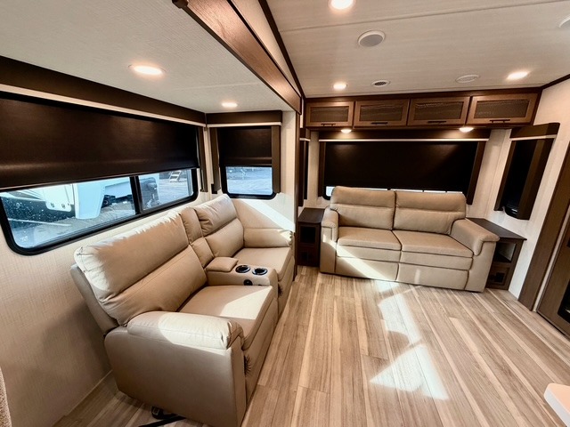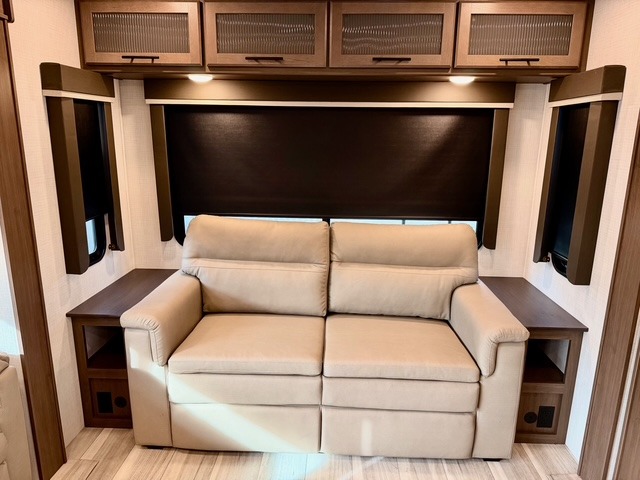 The private front bedroom offers a luxurious king bed, dual nightstands, and generous wardrobe space, ensuring a restful retreat after long days at the campsite. The theater seating, tri-fold sofa, and multiple sleeping areas make this fifth wheel perfect for both overnight guests and extended family trips. Two electric awnings expand your living space outdoors, creating shaded areas for dining, relaxing, or enjoying the fresh air.