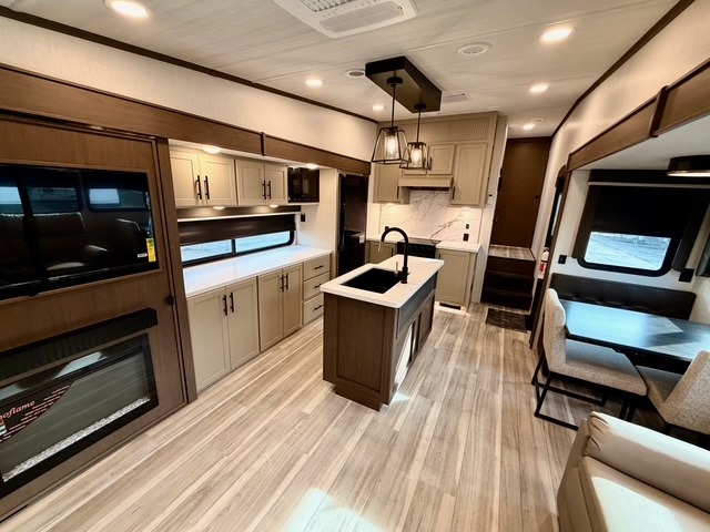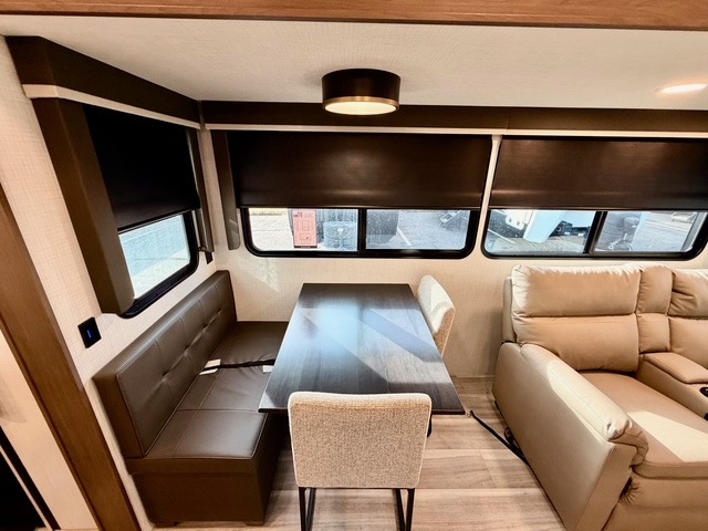 You will have the time of your life in this Cougar Half-Ton fifth wheel, designed with comfort, style, and convenience in mind. The living area features plush theater seating and a tri-fold sleeper sofa with end tables, providing plenty of seating for relaxing, watching movies, or entertaining family and friends. The opposing slides create an open and spacious layout, making it easy to move around the kitchen island while preparing meals, washing dishes, or organizing snacks. Adjacent to the kitchen is a booth dinette, ideal for family meals, game nights, or casual work. If you prefer, the booth can be swapped for an optional free-standing table with chairs and ottoman for even more comfort and versatility.
