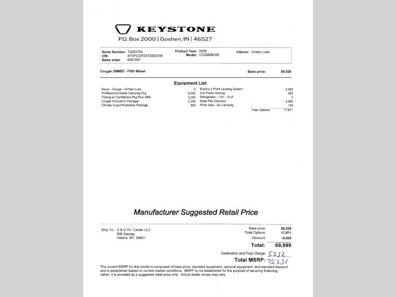 New 2026 Keystone RV Cougar Half-Ton 29MBD Fifth Wheel