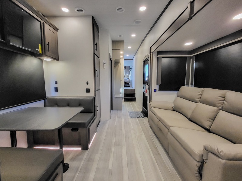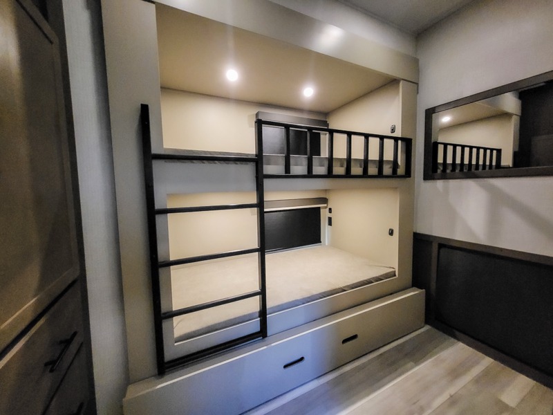 The whole crew will love camping trips in this spacious fifth wheel! From the front bedroom with a walk-around king bed to the rear kitchen with ample counter space, this is something for everyone. A middle bunkroom includes built-in bunk beds with a lower trundle bed and a flip-up table if some work needs done. Once your meals are made, you can dine at the booth dinette, relax on the sofa, or head outdoors to enjoy the power awnings. The full bath is towards the front near the bedroom for convenience. Here, you'll find a king bed, dual nightstands, plus a wardrobe with washer and dryer prep if you choose to add these appliances!
