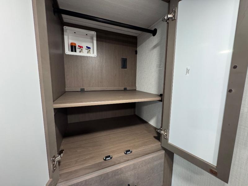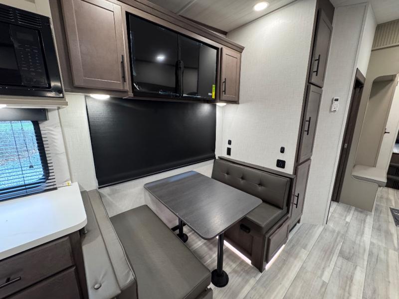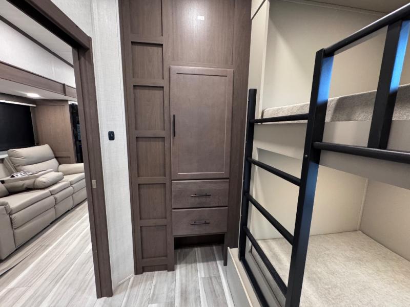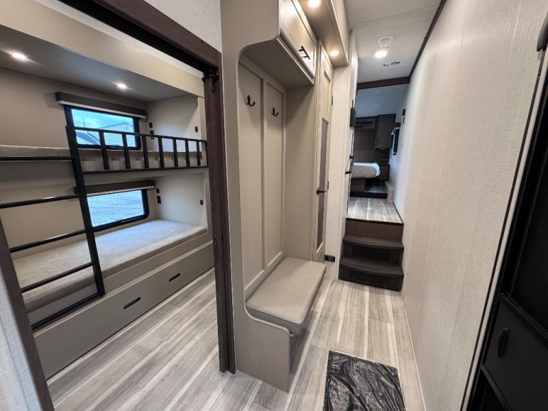 The whole crew will love camping trips in this spacious fifth wheel! From the front bedroom with a walk-around king bed to the rear kitchen with ample counter space, this is something for everyone. A middle bunkroom includes built-in bunk beds with a lower trundle bed and a flip-up table if some work needs done. Once your meals are made, you can dine at the booth dinette, relax on the sofa, or head outdoors to enjoy the power awnings. The full bath is towards the front near the bedroom for convenience. Here, you'll find a king bed, dual nightstands, plus a wardrobe with washer and dryer prep if you choose to add these appliances!