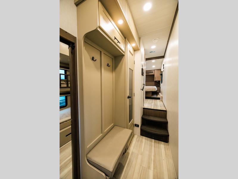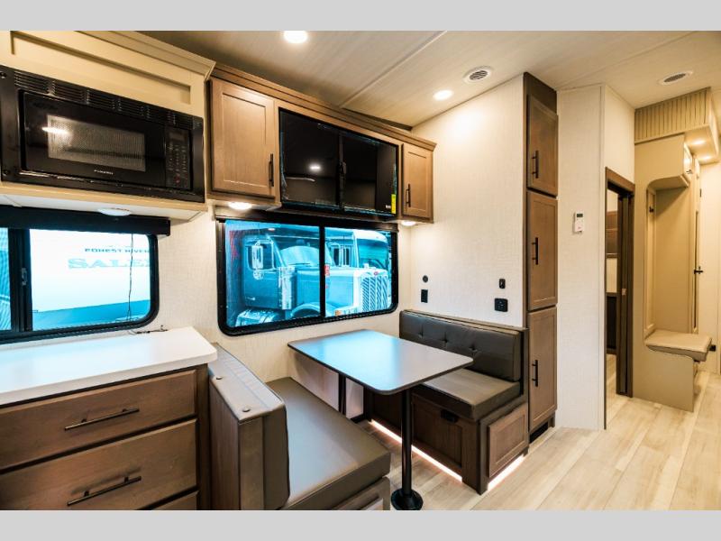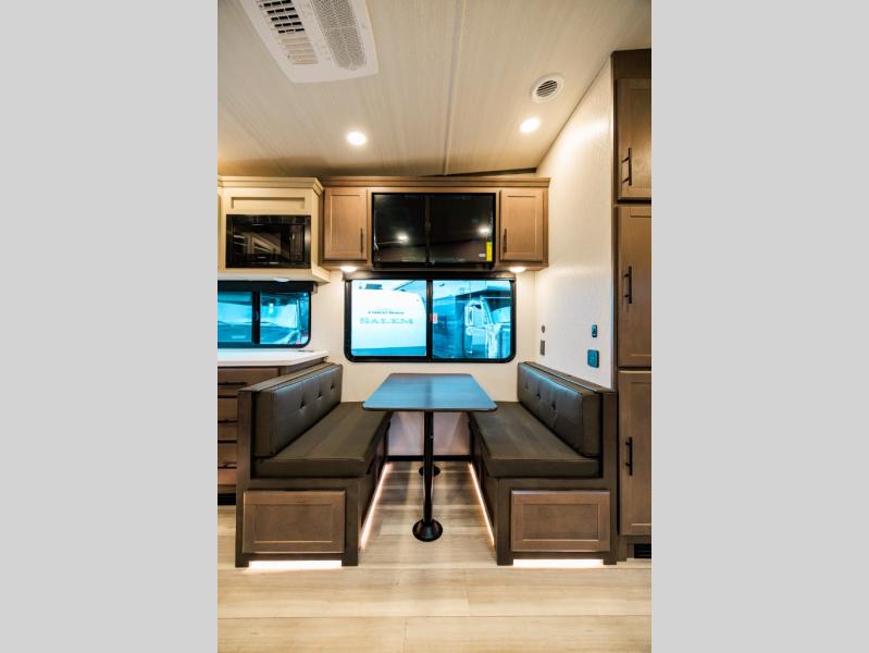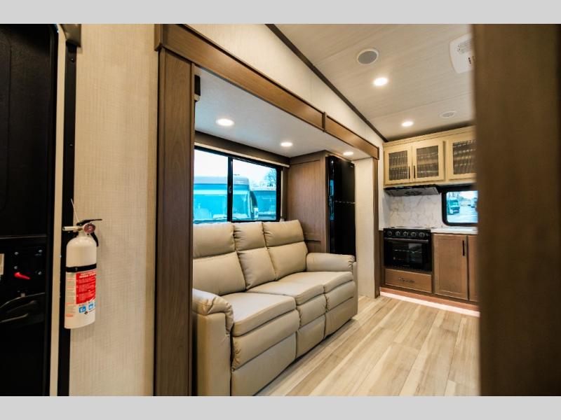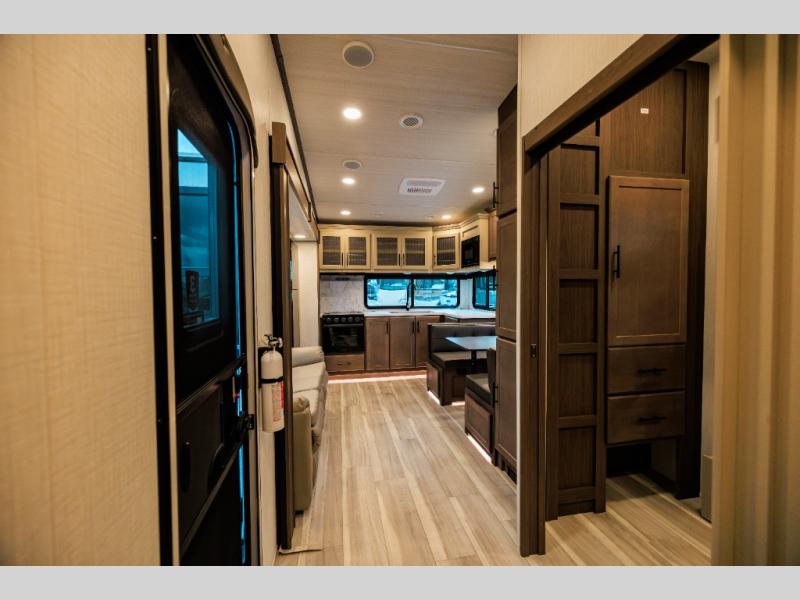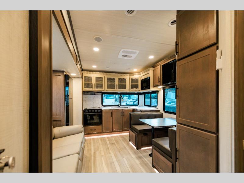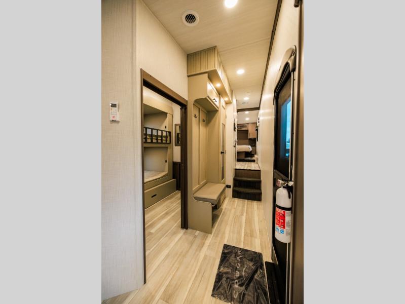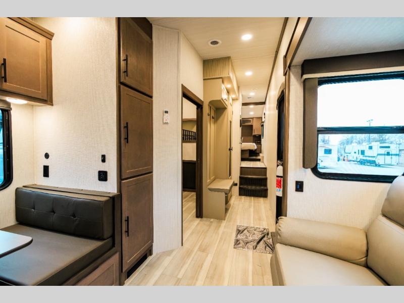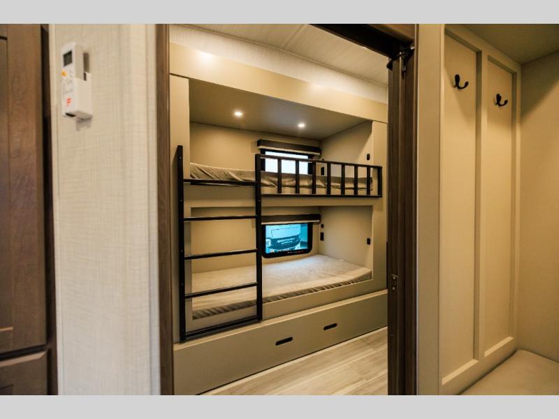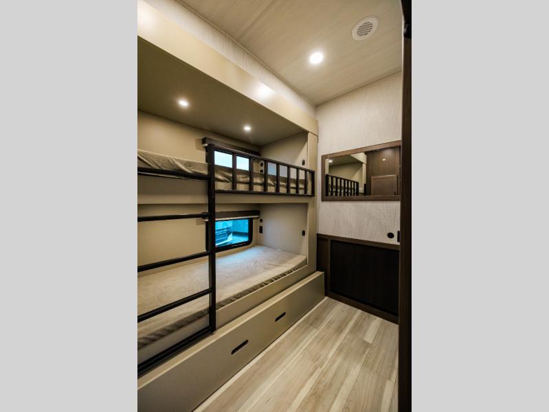 The whole crew will love camping trips in this spacious fifth wheel! From the front bedroom with a walk-around king bed to the rear kitchen with ample counter space, this is something for everyone. A middle bunkroom includes built-in bunk beds with a lower trundle bed and a flip-up table if some work needs done. Once your meals are made, you can dine at the booth dinette, relax on the sofa, or head outdoors to enjoy the power awnings. The full bath is towards the front near the bedroom for convenience. Here, you'll find a king bed, dual nightstands, plus a wardrobe with washer and dryer prep if you choose to add these appliances!
