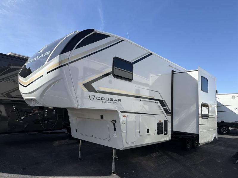 The Keystone Cougar Half-Ton fifth wheel and travel trailers are known as one of America's favorites for a reason! Some of those reasons are the exclusive features that come from Keystone, like the Winegard Air 360+ omni-directional rooftop antenna, the in-floor heating ducts, and the HyperCore composite wall construction with Vixen Fibrogloss high-gloss finish. The Cougar Half-Ton has a Climate Guard protection package with heat-deflecting white sidewalls, two roof attic vents, PEX plumbing and more to enjoy four season camping. Inside, you'll love the dimmable lighting, night roller shades throughout, shower skylight, and bedside USB outlets to keep your electronics charged.