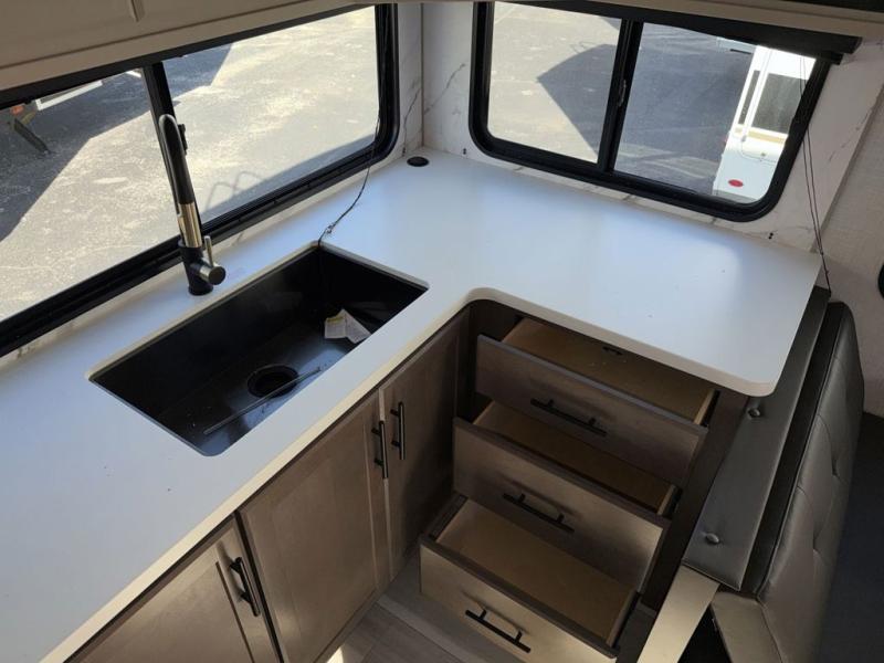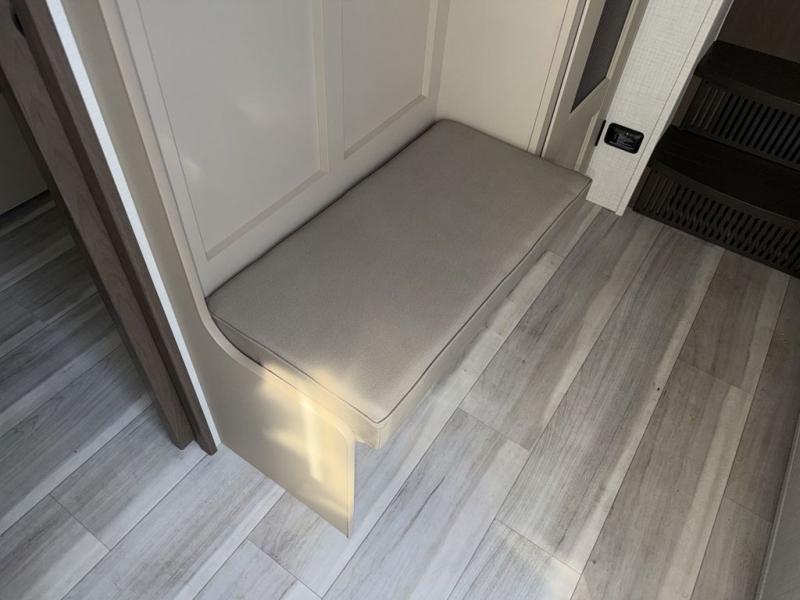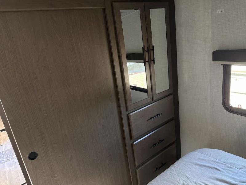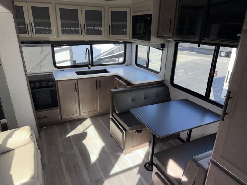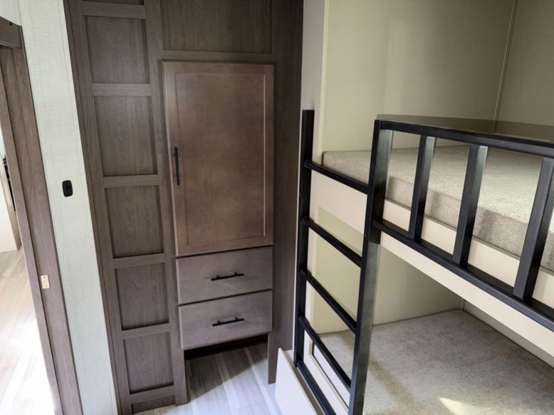 The whole crew will love camping trips in this spacious fifth wheel! From the front bedroom with a walk-around king bed to the rear kitchen with ample counter space, this is something for everyone. A middle bunkroom includes built-in bunk beds with a lower trundle bed and a flip-up table if some work needs done. Once your meals are made, you can dine at the booth dinette, relax on the sofa, or head outdoors to enjoy the power awnings. The full bath is towards the front near the bedroom for convenience. Here, you'll find a king bed, dual nightstands, plus a wardrobe with washer and dryer prep if you choose to add these appliances!