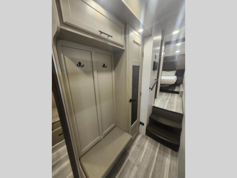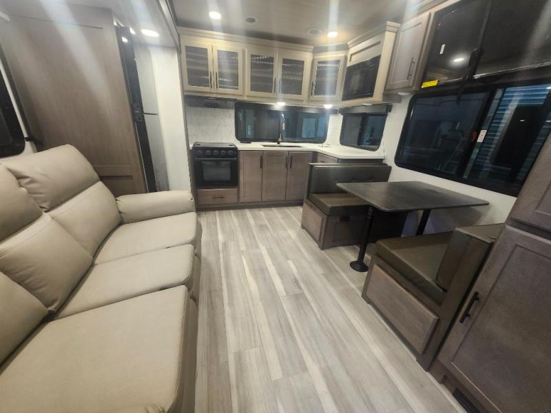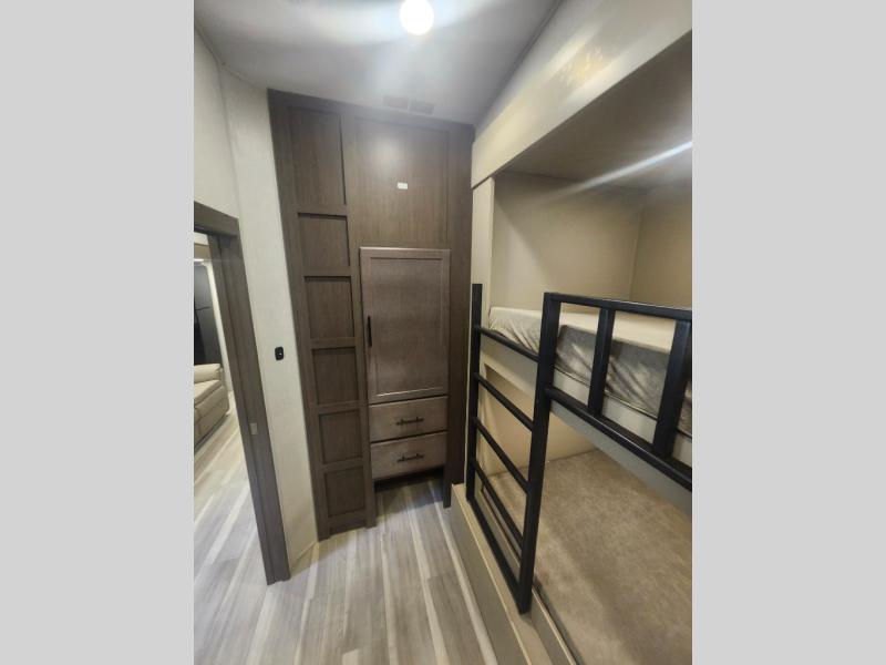 The whole crew will love camping trips in this spacious fifth wheel! From the front bedroom with a walk-around king bed to the rear kitchen with ample counter space, this is something for everyone. A middle bunkroom includes built-in bunk beds with a lower trundle bed and a flip-up table if some work needs done. Once your meals are made, you can dine at the booth dinette, relax on the sofa, or head outdoors to enjoy the power awnings. The full bath is towards the front near the bedroom for convenience. Here, you'll find a king bed, dual nightstands, plus a wardrobe with washer and dryer prep if you choose to add these appliances!