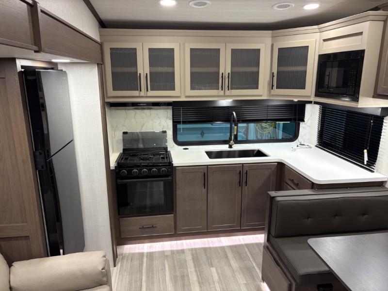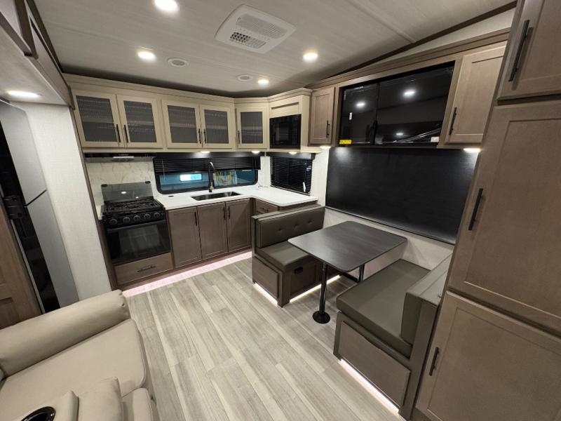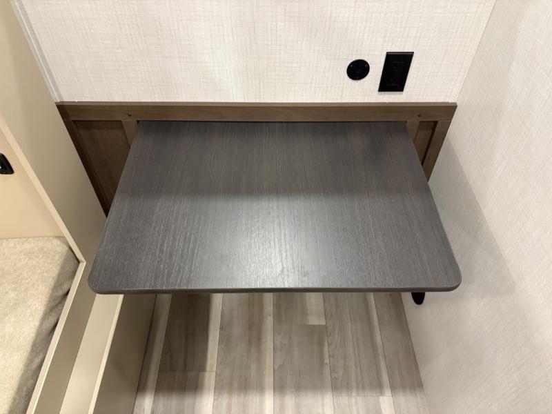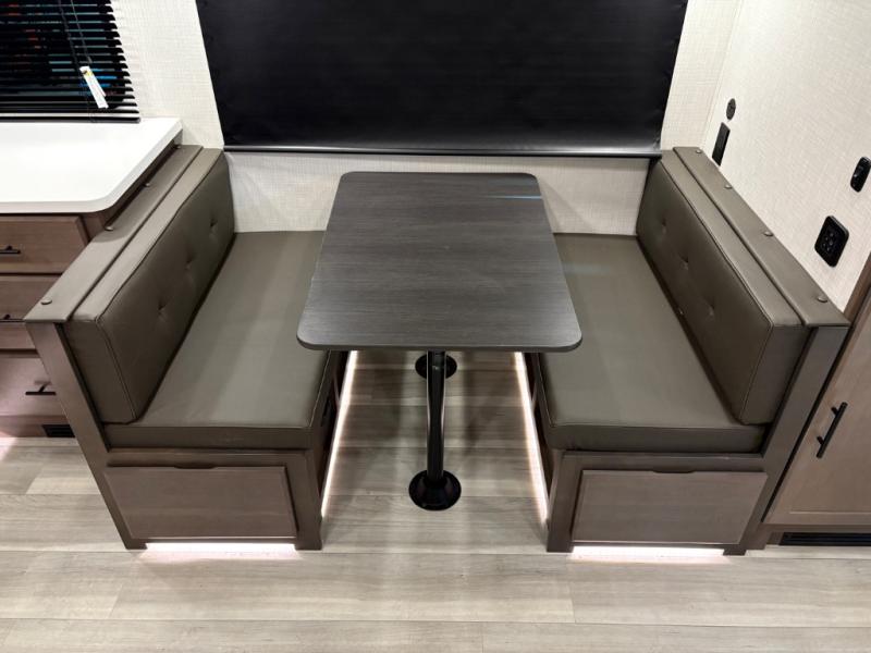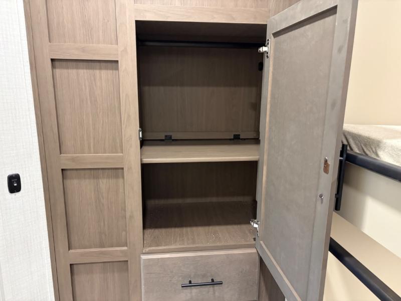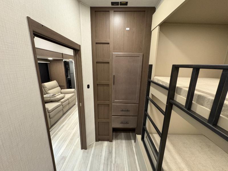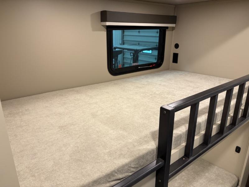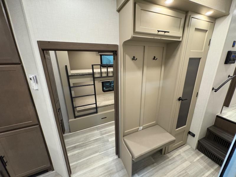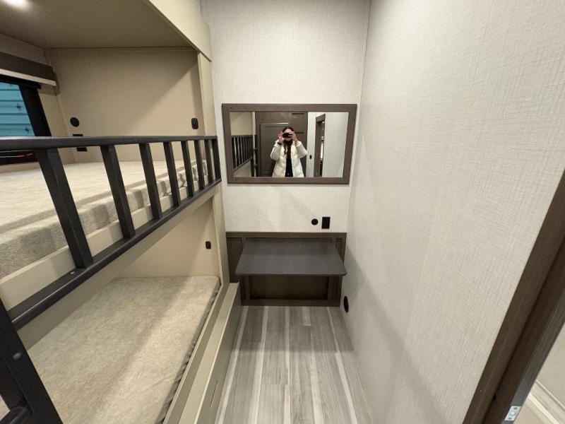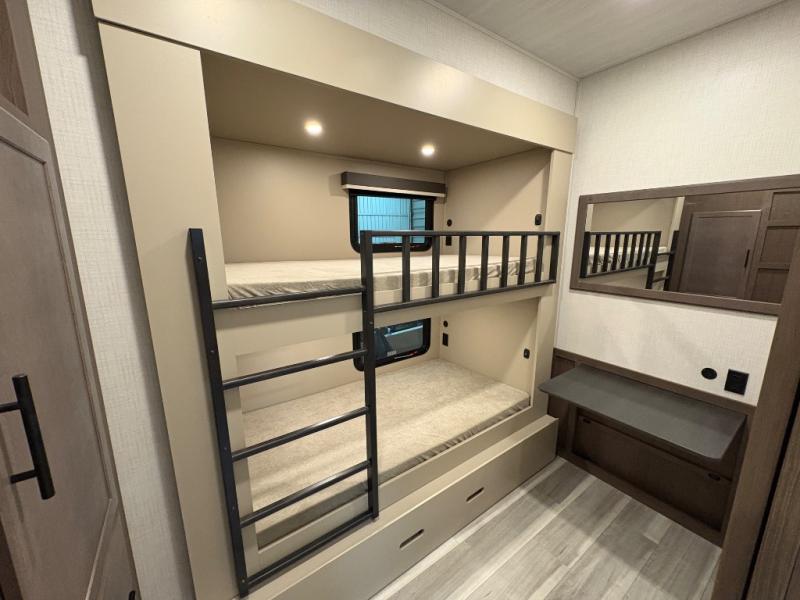 The whole crew will love camping trips in this spacious fifth wheel! From the front bedroom with a walk-around king bed to the rear kitchen with ample counter space, this is something for everyone. A middle bunkroom includes built-in bunk beds with a lower trundle bed and a flip-up table if some work needs done. Once your meals are made, you can dine at the booth dinette, relax on the sofa, or head outdoors to enjoy the power awnings. The full bath is towards the front near the bedroom for convenience. Here, you'll find a king bed, dual nightstands, plus a wardrobe with washer and dryer prep if you choose to add these appliances!