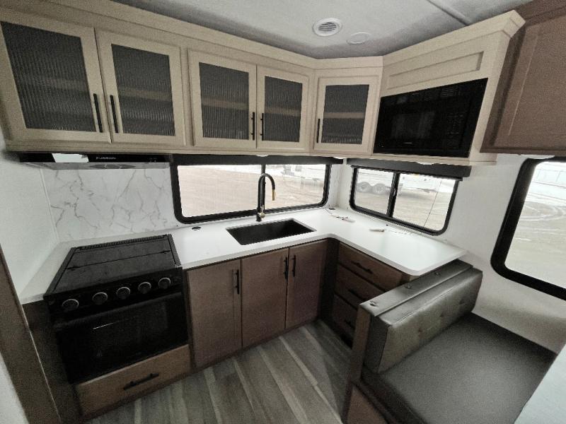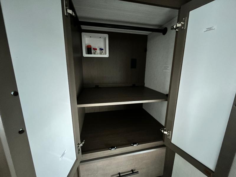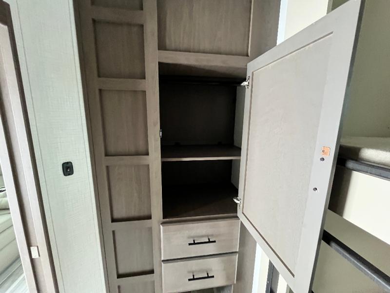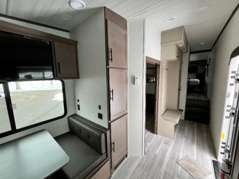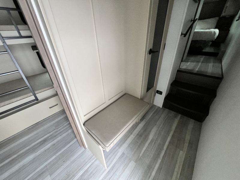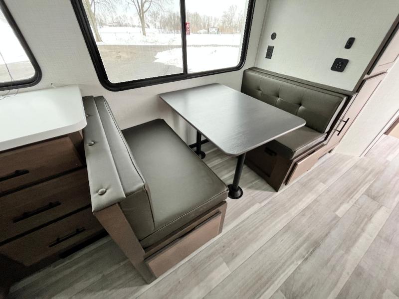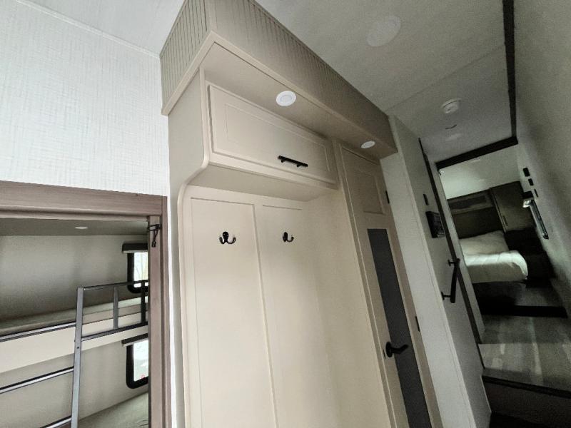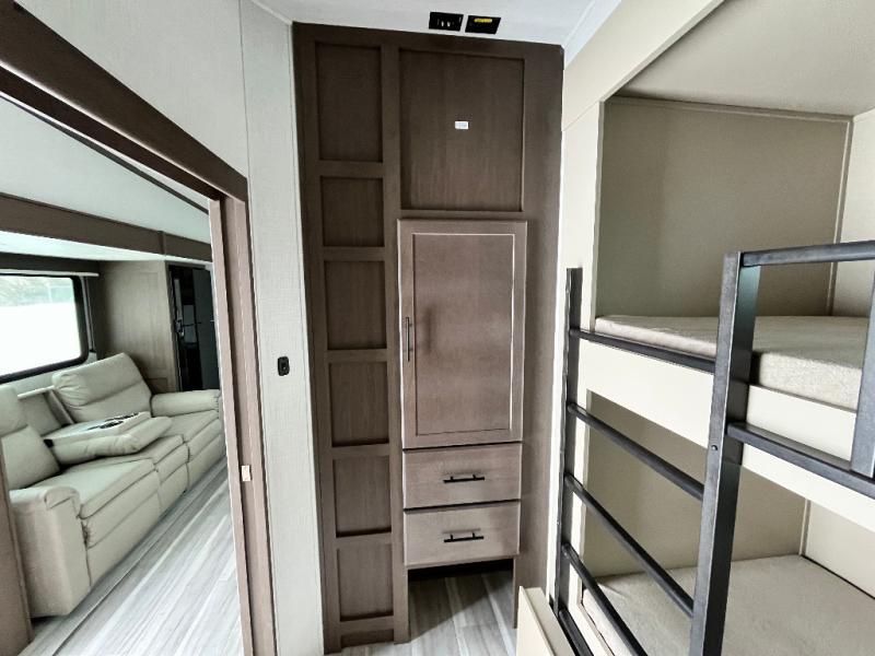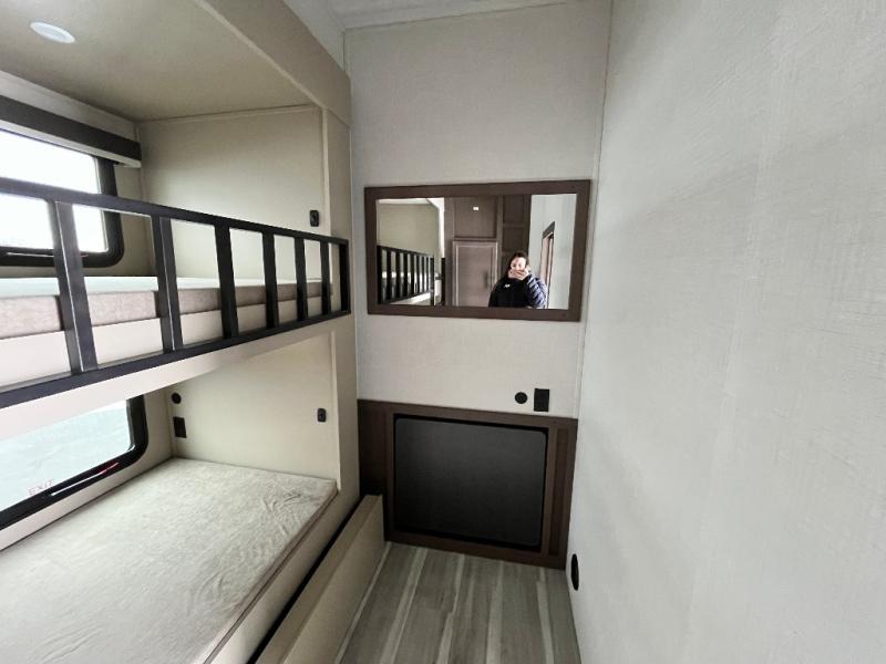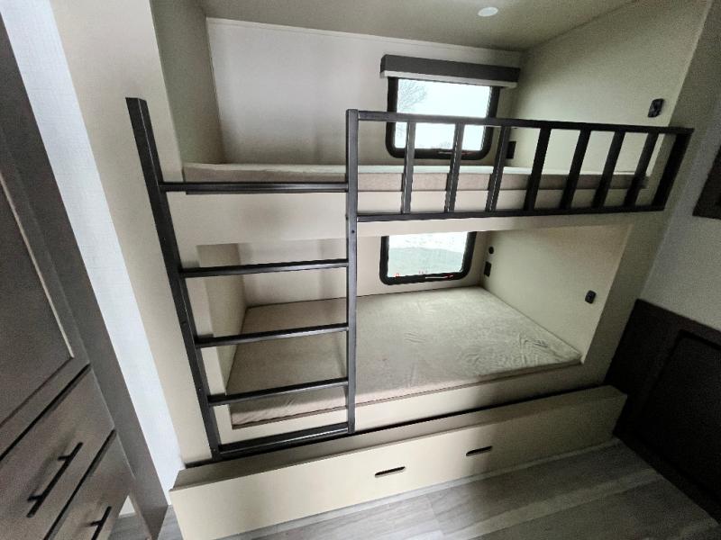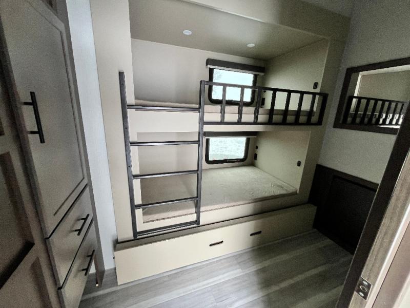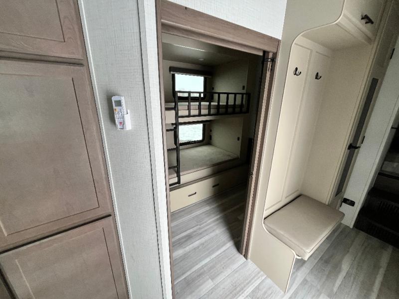 The whole crew will love camping trips in this spacious fifth wheel! From the front bedroom with a walk-around king bed to the rear kitchen with ample counter space, this is something for everyone. A middle bunkroom includes built-in bunk beds with a lower trundle bed and a flip-up table if some work needs done. Once your meals are made, you can dine at the booth dinette, relax on the sofa, or head outdoors to enjoy the power awnings. The full bath is towards the front near the bedroom for convenience. Here, you'll find a king bed, dual nightstands, plus a wardrobe with washer and dryer prep if you choose to add these appliances!