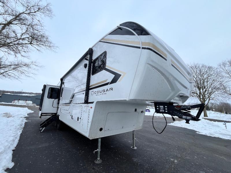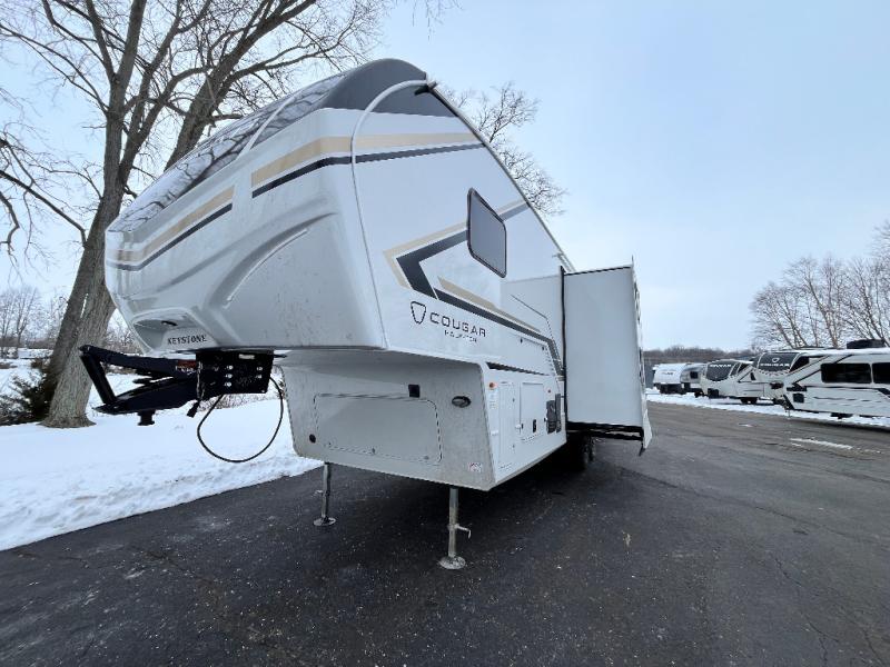 The Keystone Cougar Half-Ton fifth wheel and travel trailers are known as one of America's favorites for a reason! Some of those reasons are the exclusive features that come from Keystone, like the Winegard Air 360+ omni-directional rooftop antenna, the in-floor heating ducts, and the HyperCore composite wall construction with Vixen Fibrogloss high-gloss finish. The Cougar Half-Ton has a Climate Guard protection package with heat-deflecting white sidewalls, two roof attic vents, PEX plumbing and more to enjoy four season camping. Inside, you'll love the dimmable lighting, night roller shades throughout, shower skylight, and bedside USB outlets to keep your electronics charged.