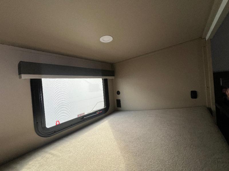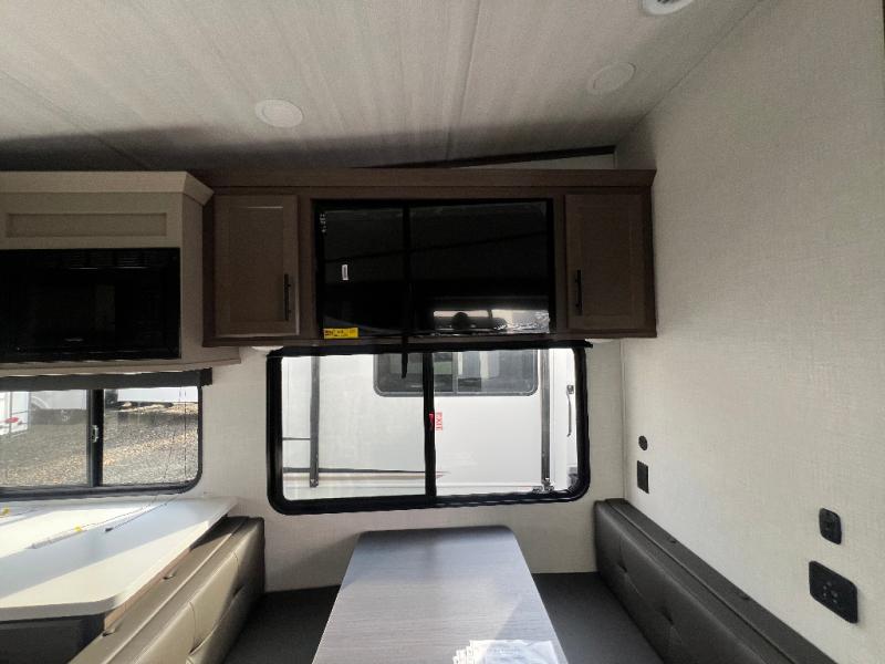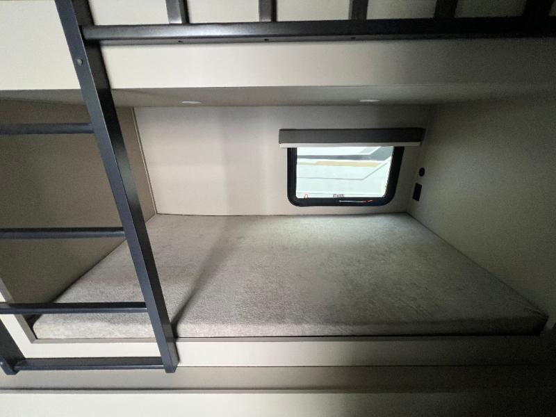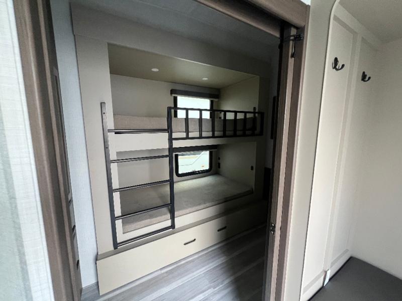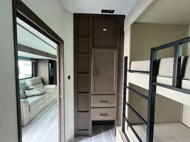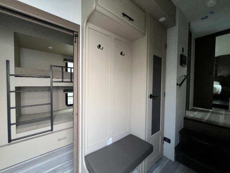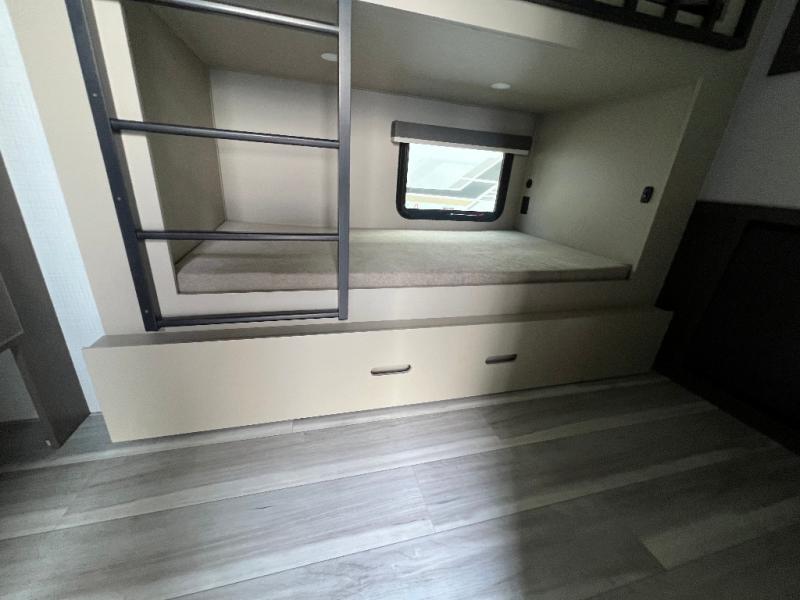 The whole crew will love camping trips in this spacious fifth wheel! From the front bedroom with a walk-around king bed to the rear kitchen with ample counter space, this is something for everyone. A middle bunkroom includes built-in bunk beds with a lower trundle bed and a flip-up table if some work needs done. Once your meals are made, you can dine at the booth dinette, relax on the sofa, or head outdoors to enjoy the power awnings. The full bath is towards the front near the bedroom for convenience. Here, you'll find a king bed, dual nightstands, plus a wardrobe with washer and dryer prep if you choose to add these appliances!