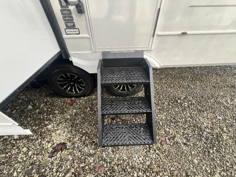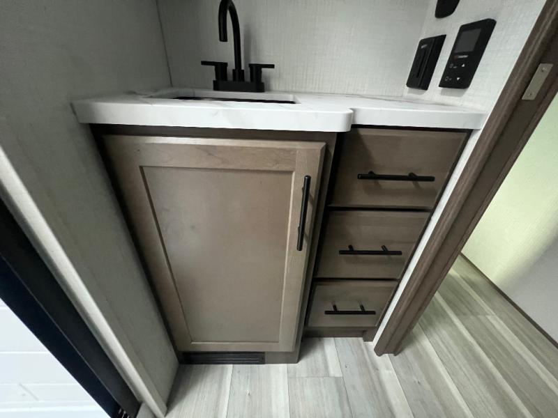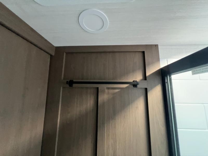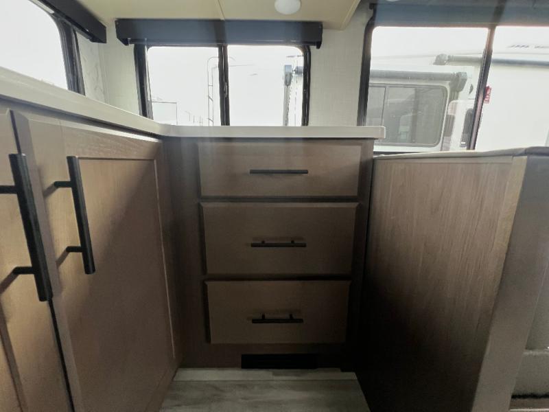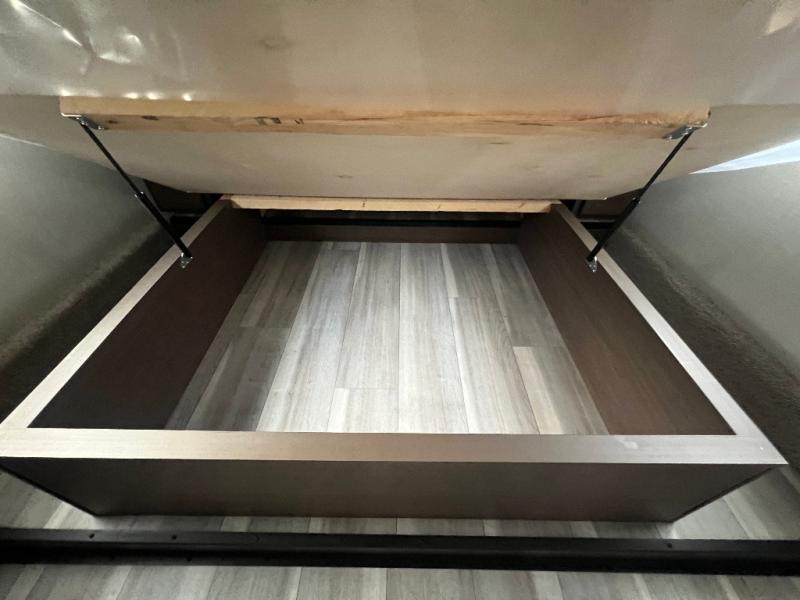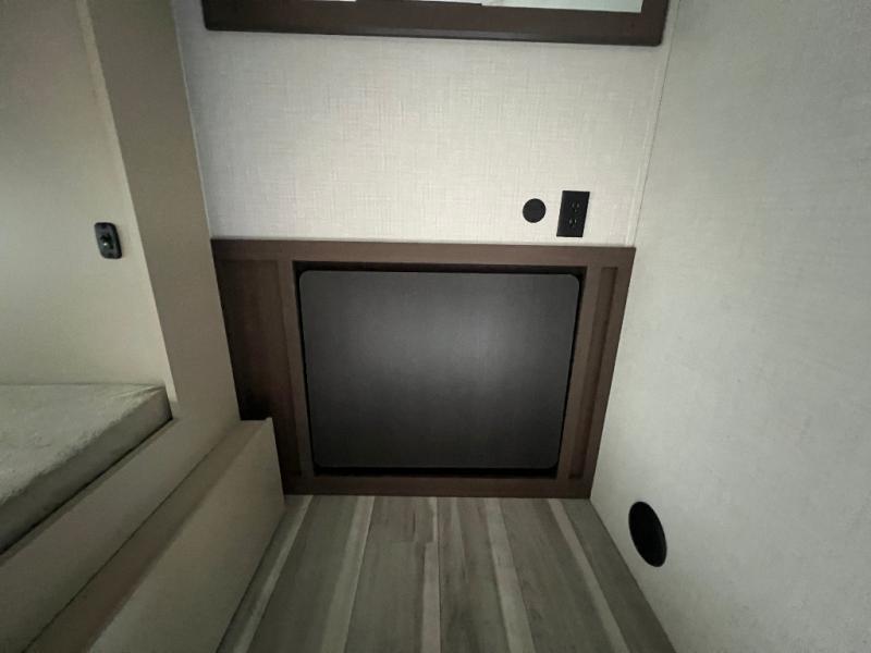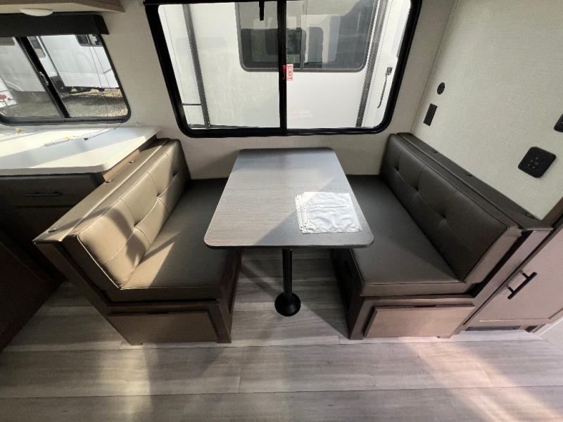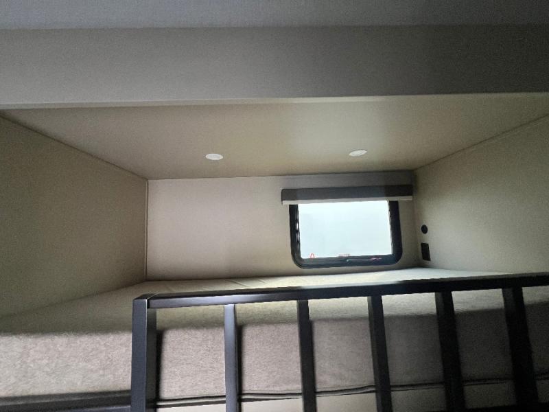 The whole crew will love camping trips in this spacious fifth wheel! From the front bedroom with a walk-around king bed to the rear kitchen with ample counter space, this is something for everyone. A middle bunkroom includes built-in bunk beds with a lower trundle bed and a flip-up table if some work needs done. Once your meals are made, you can dine at the booth dinette, relax on the sofa, or head outdoors to enjoy the power awnings. The full bath is towards the front near the bedroom for convenience. Here, you'll find a king bed, dual nightstands, plus a wardrobe with washer and dryer prep if you choose to add these appliances!