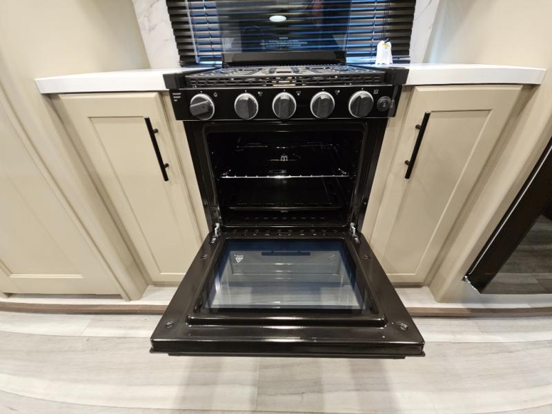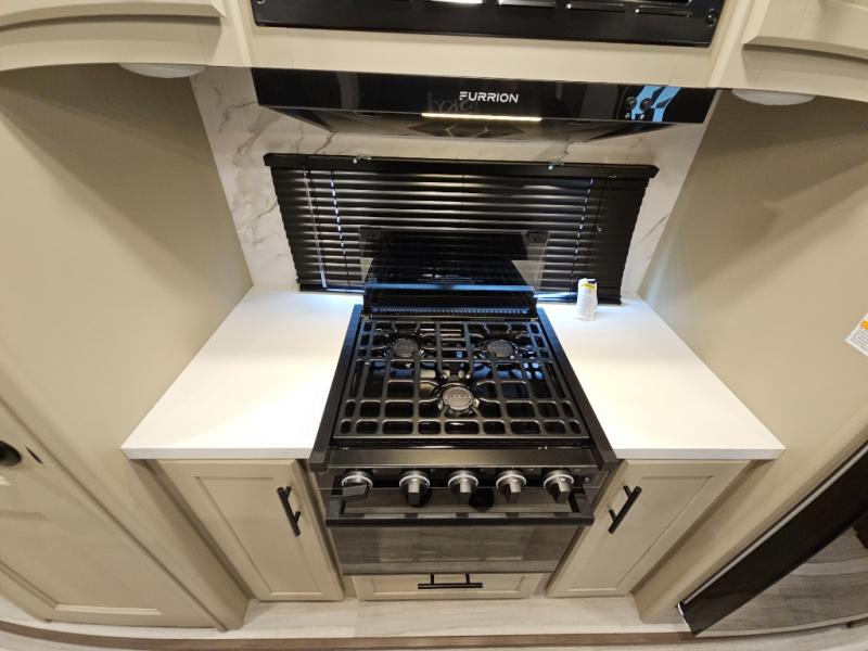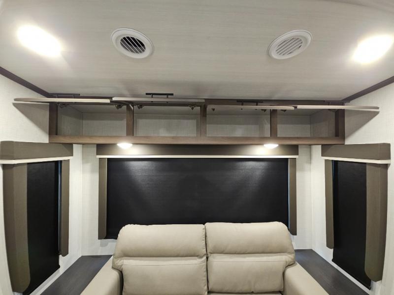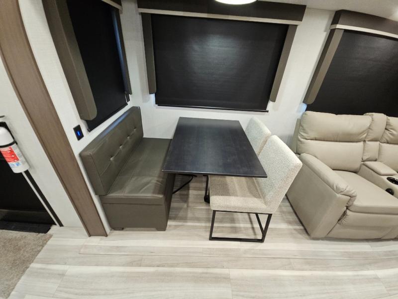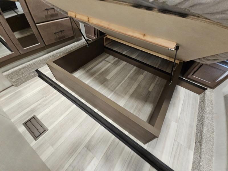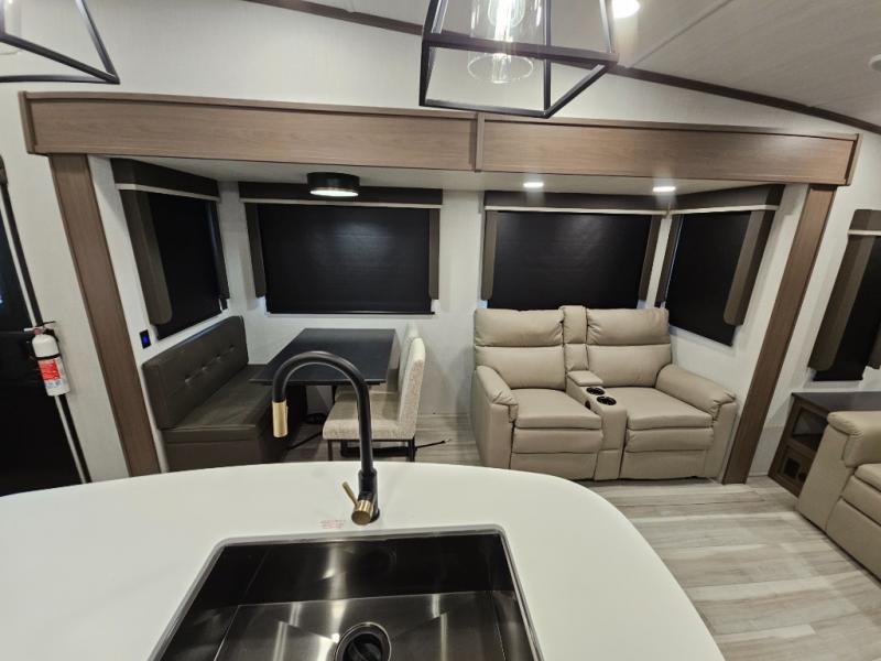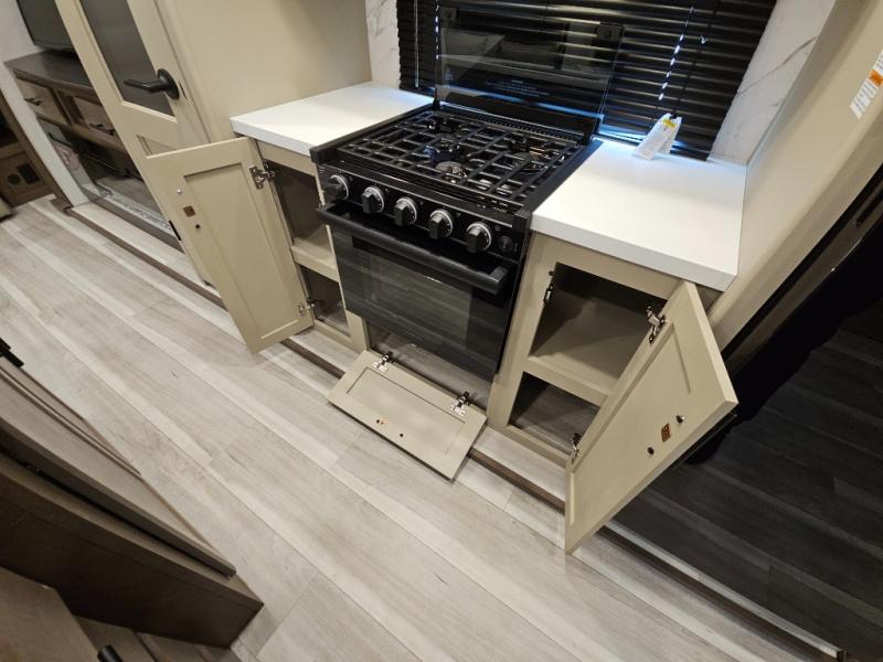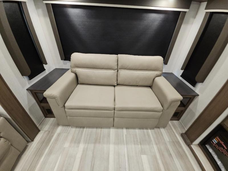 You will have the time of your life in this Cougar Half-Ton fifth wheel! There is so much comfort with the theater seating and tri-fold sleeper sofa with end tables in the living area. You also have lots of space in this area because of the opposing slides, so you can work freely around the kitchen island preparing dinner or washing dishes. The booth dinette is right next to the kitchen, so you won't have to go far to set the table. If you don't need the dinette to serve as a bed, then you might be interested in switching it out for the optional free-standing table with chairs and an ottoman. The pantry is big enough to keep your favorite foods stored away, and the 12V refrigerator can hold the items that need to be kept chilled.