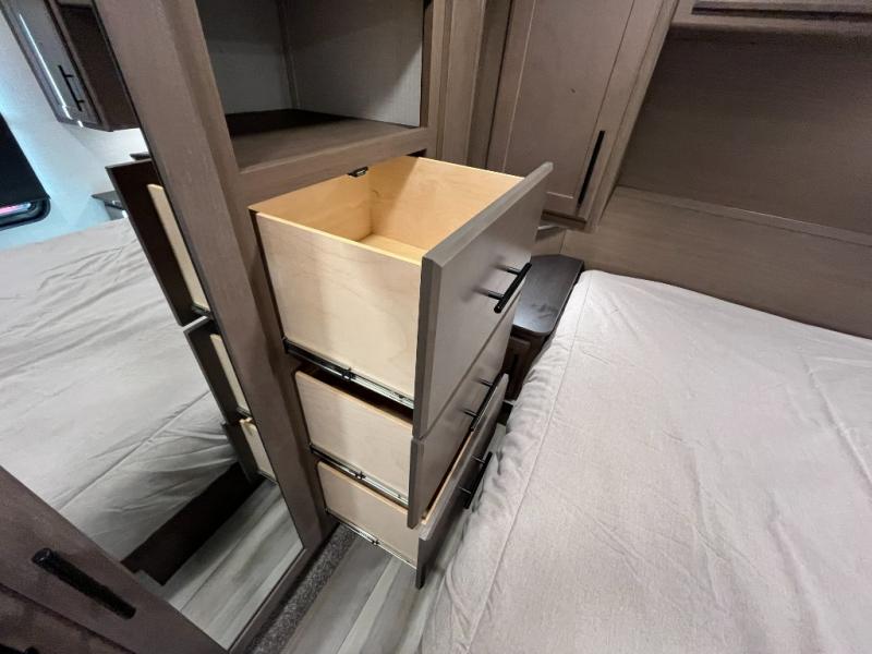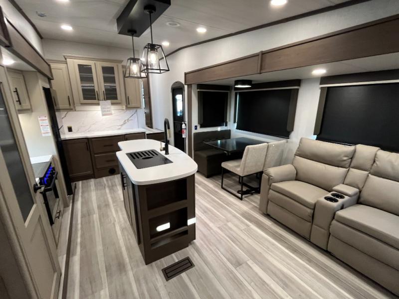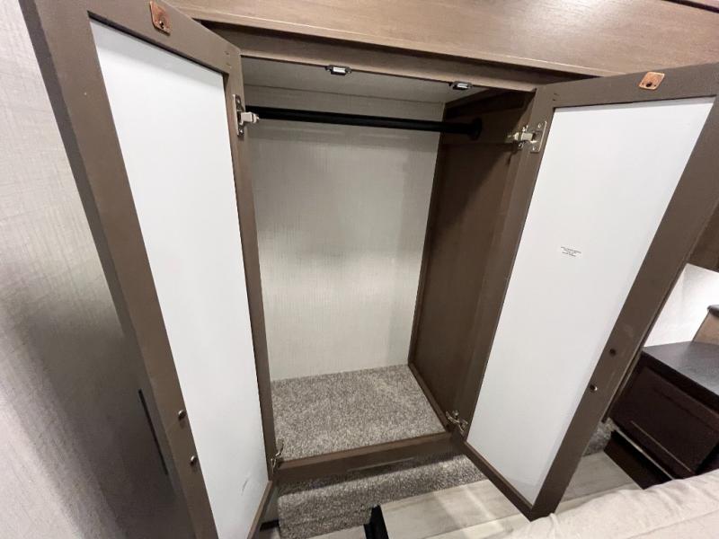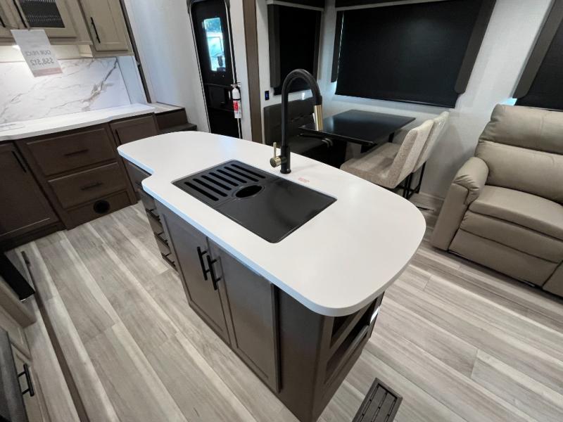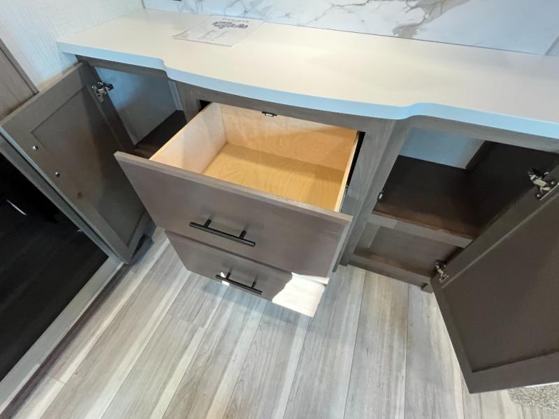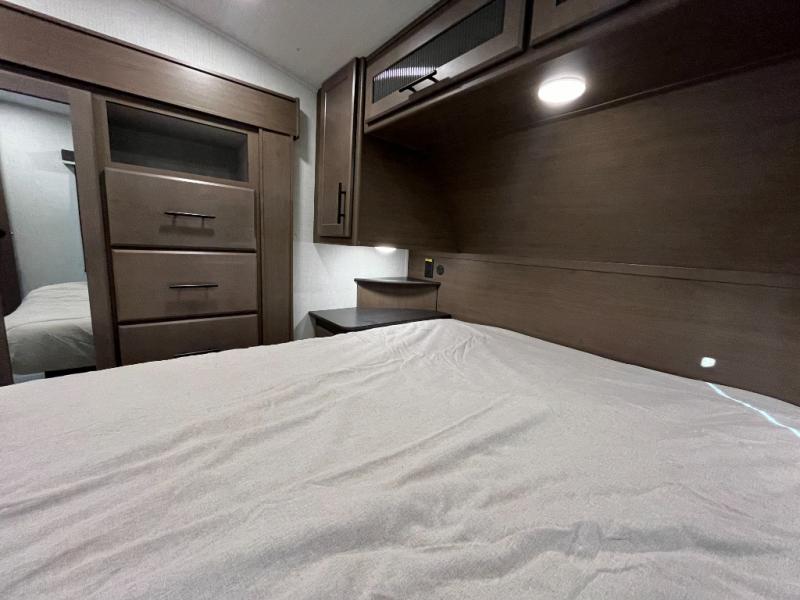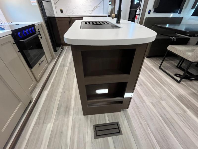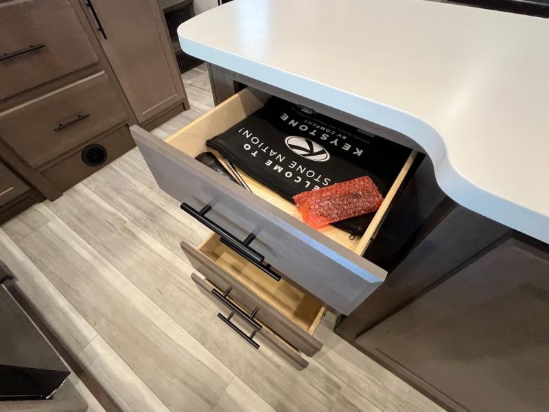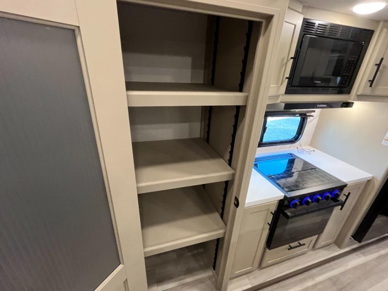 You will have the time of your life in this Cougar Half-Ton fifth wheel! There is so much comfort with the theater seating and tri-fold sleeper sofa with end tables in the living area. You also have lots of space in this area because of the opposing slides, so you can work freely around the kitchen island preparing dinner or washing dishes. The booth dinette is right next to the kitchen, so you won't have to go far to set the table. If you don't need the dinette to serve as a bed, then you might be interested in switching it out for the optional free-standing table with chairs and an ottoman. The pantry is big enough to keep your favorite foods stored away, and the 12V refrigerator can hold the items that need to be kept chilled.