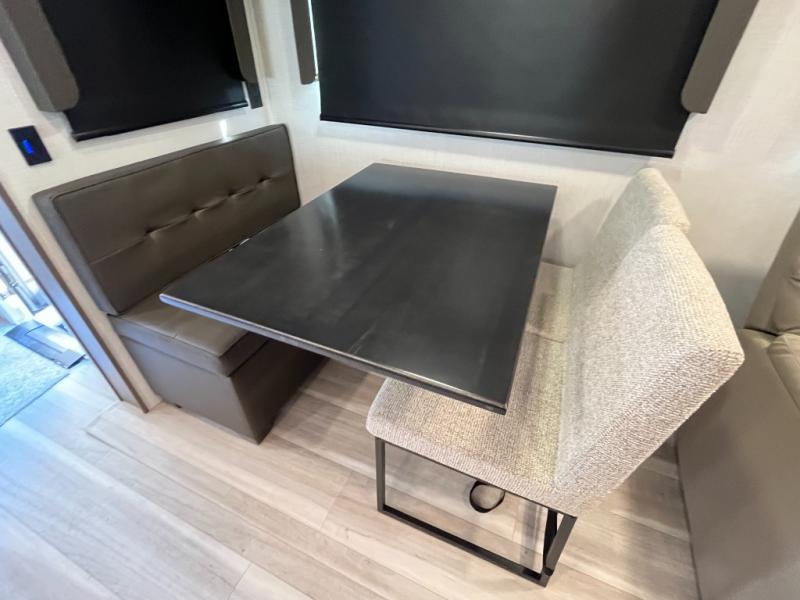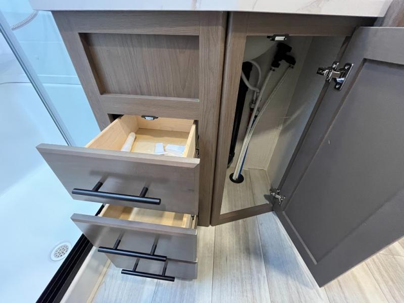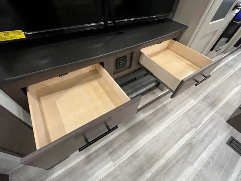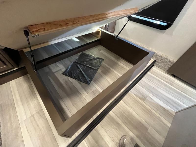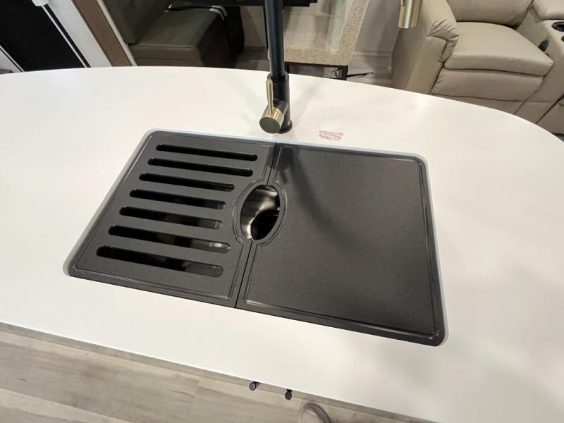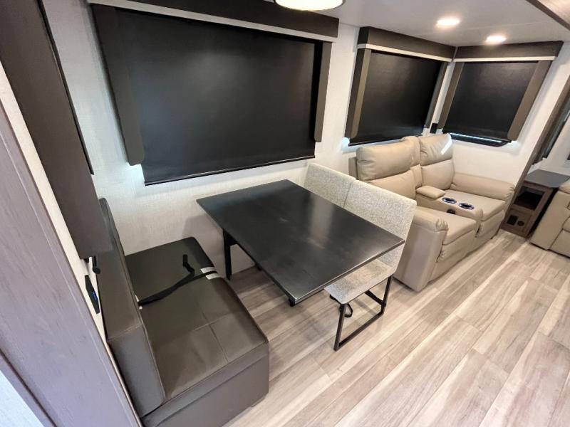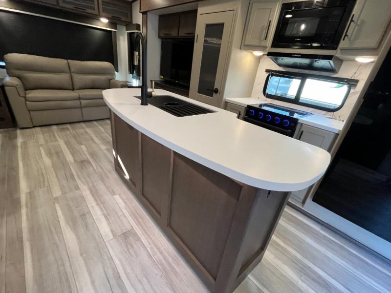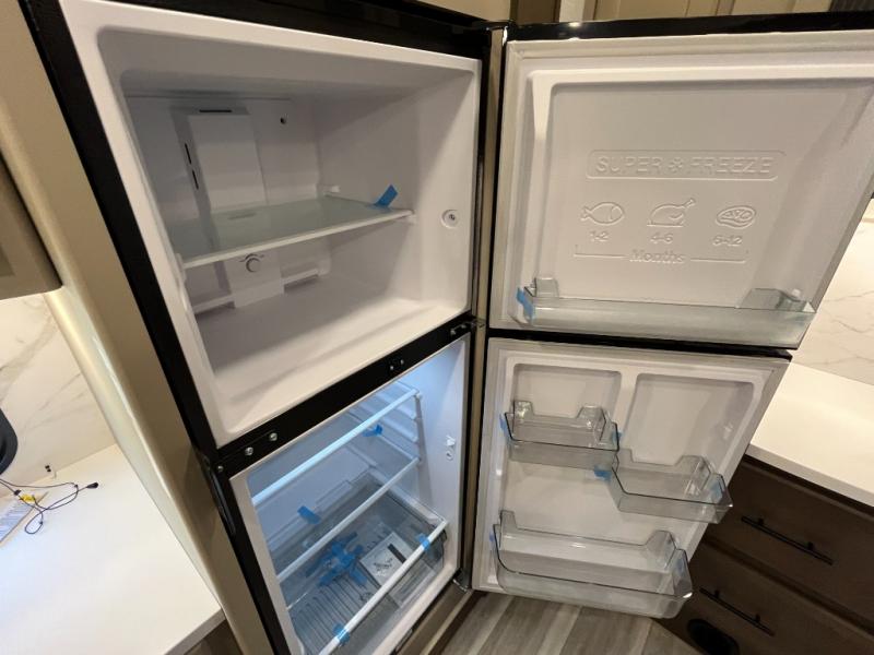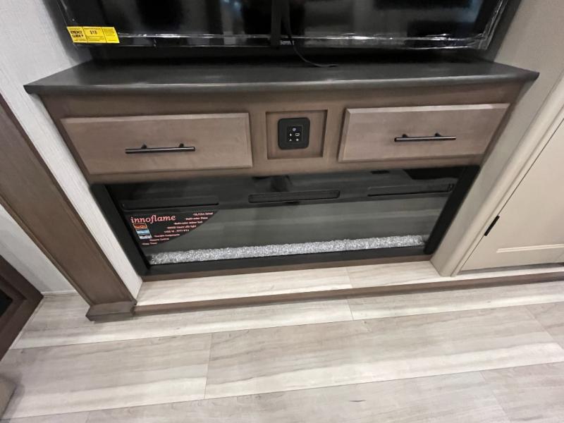 You will have the time of your life in this Cougar Half-Ton fifth wheel! There is so much comfort with the theater seating and tri-fold sleeper sofa with end tables in the living area. You also have lots of space in this area because of the opposing slides, so you can work freely around the kitchen island preparing dinner or washing dishes. The booth dinette is right next to the kitchen, so you won't have to go far to set the table. If you don't need the dinette to serve as a bed, then you might be interested in switching it out for the optional free-standing table with chairs and an ottoman. The pantry is big enough to keep your favorite foods stored away, and the 12V refrigerator can hold the items that need to be kept chilled.