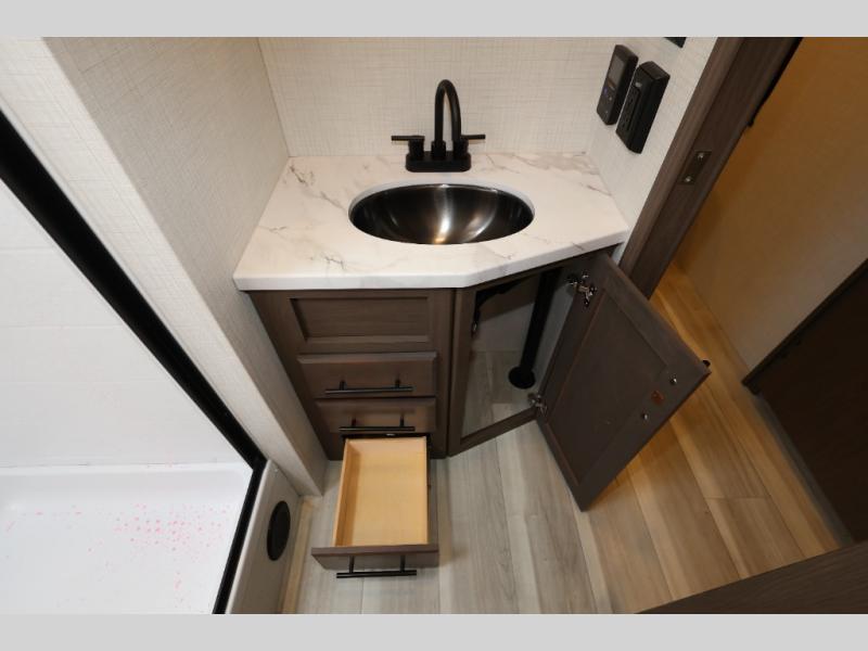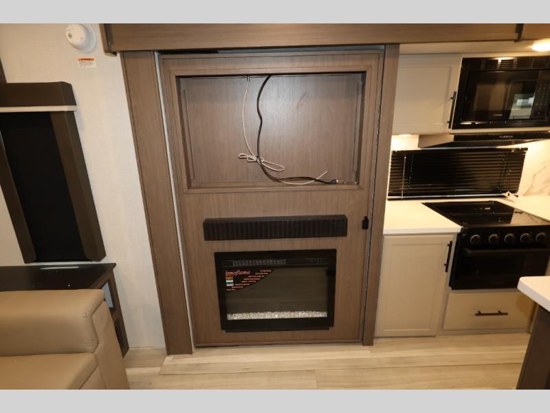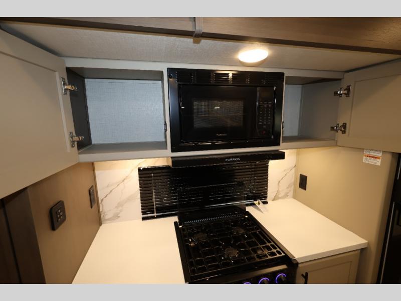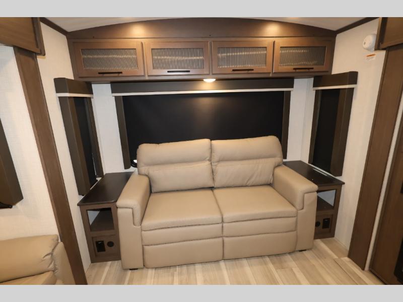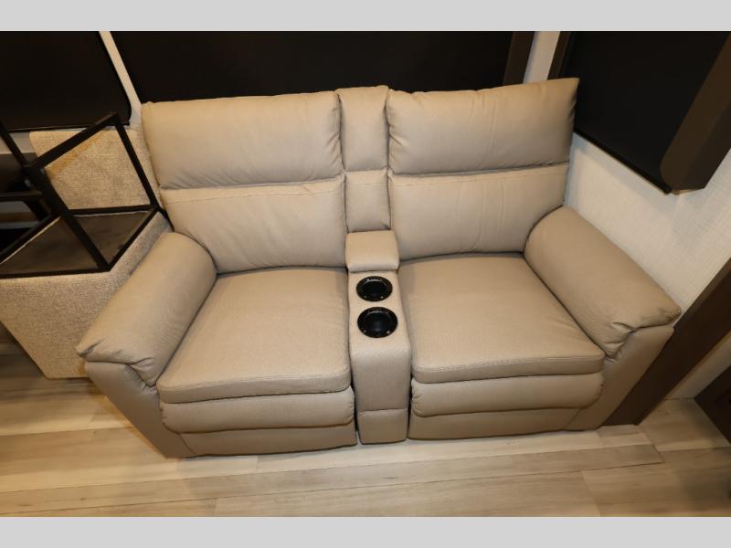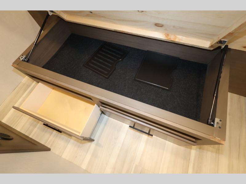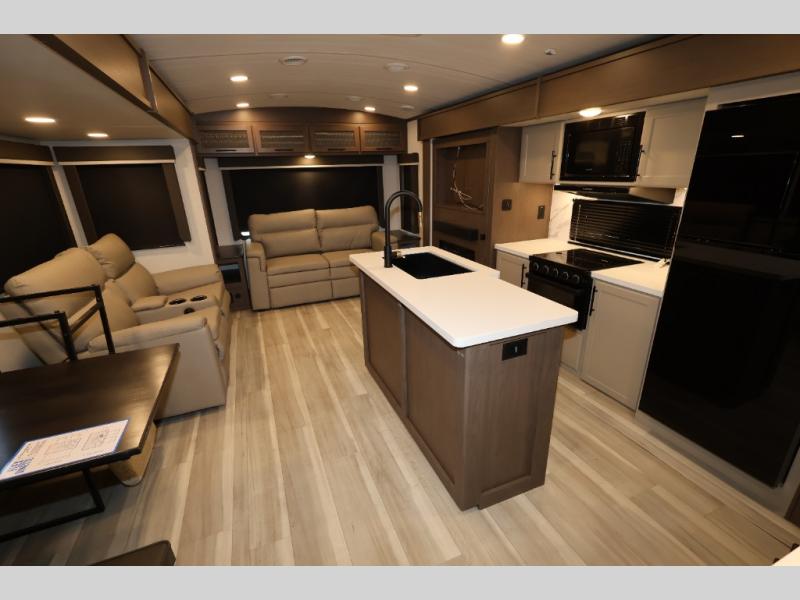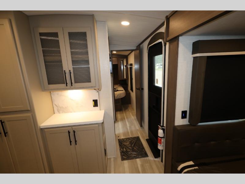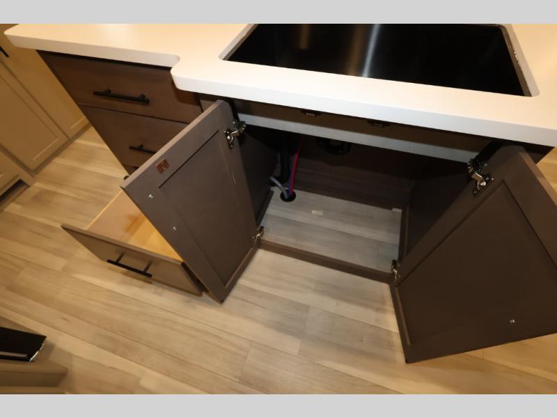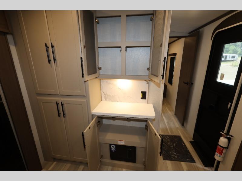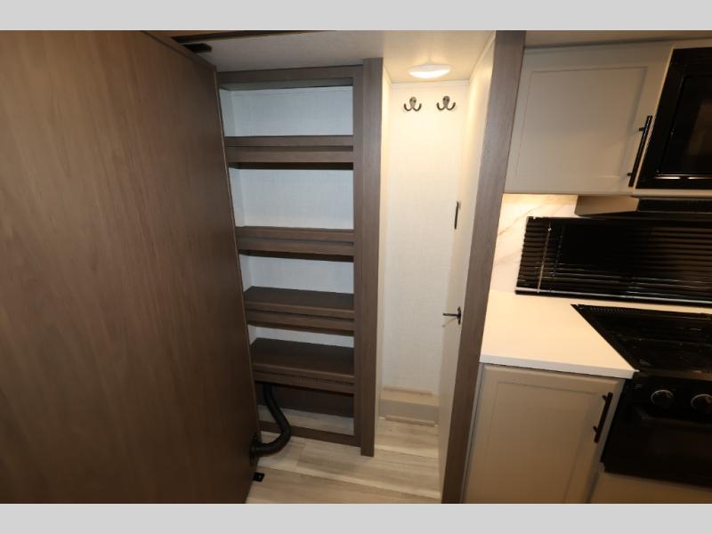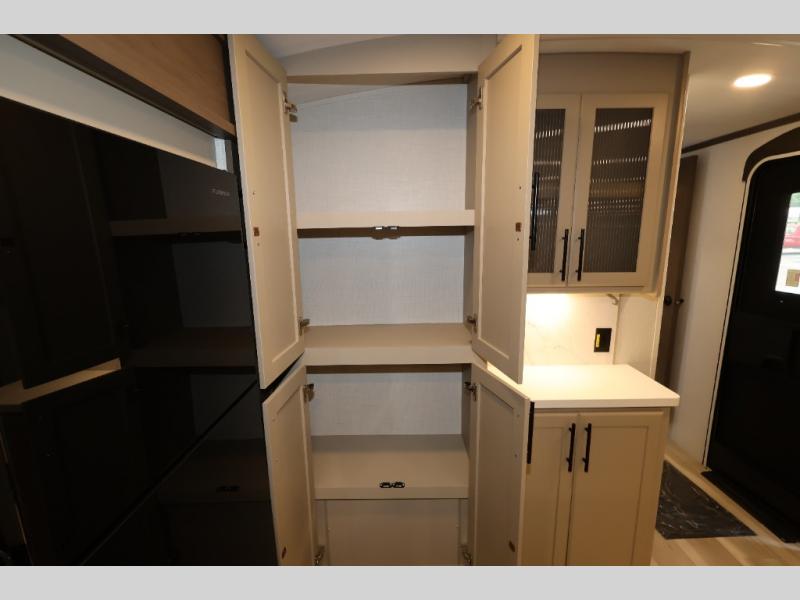 Trips spent in this travel trailer are sure to bring memories! The dual opposing slides in the combined kitchen and living area provide your crew with plenty of space to relax on the theater seating, dine at the dinette table, and prep meals with the kitchen island. There is also a tri-fold sleeper sofa here for guests and a pivoting entertainment center with a hidden pantry to keep snacks stocked. And a second pantry and hutch provides even more storage! You'll love having your own private bedroom up front, complete with a king bed, dual bedside drawers and nightstands and additional storage drawers to keep your space tidy. Outside, you'll find two power awnings, a 2" accessory hitch, and a drop frame pass-thru storage for fishing poles, hiking gear, and more!