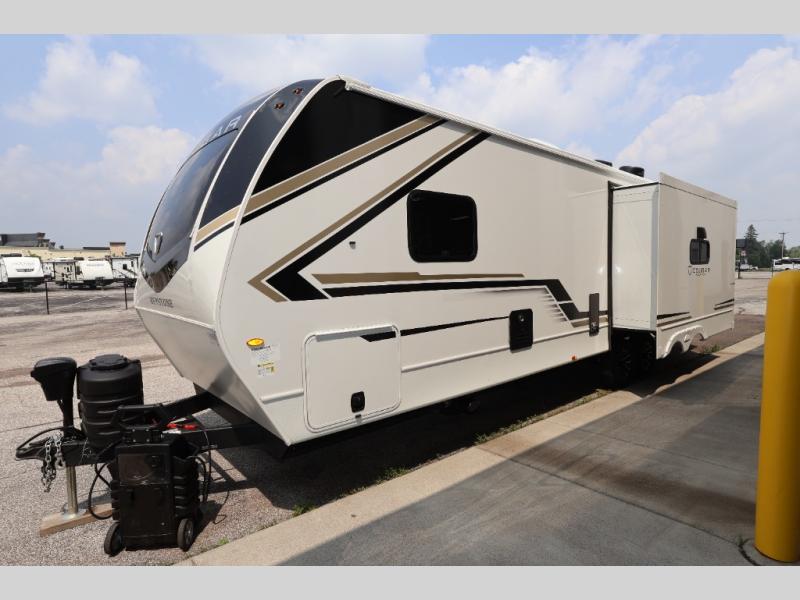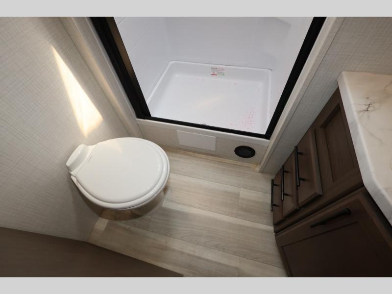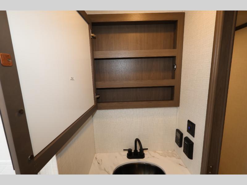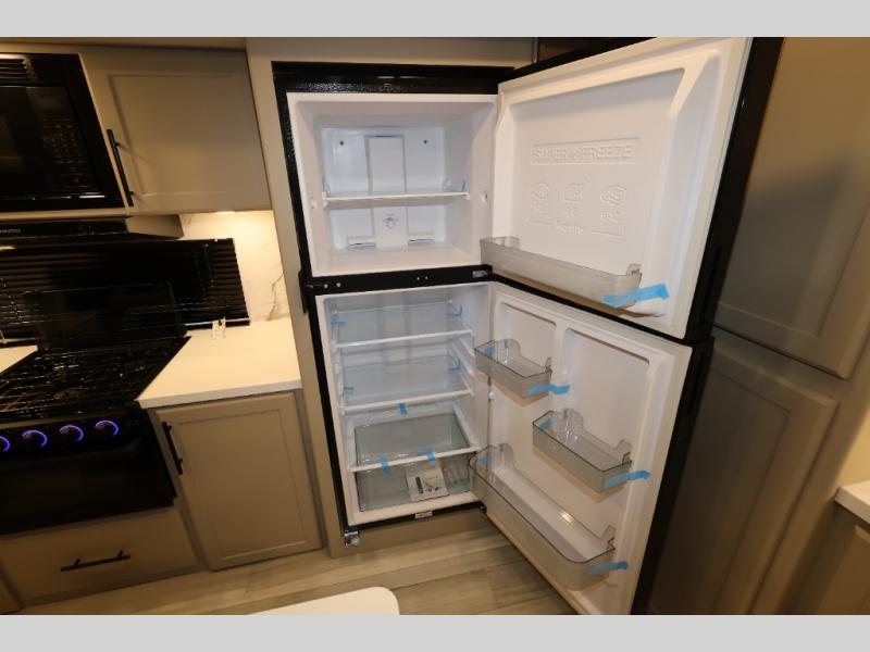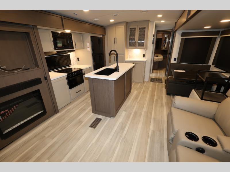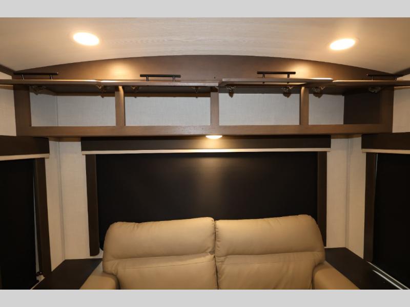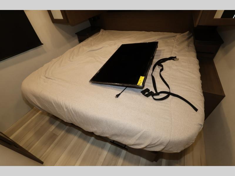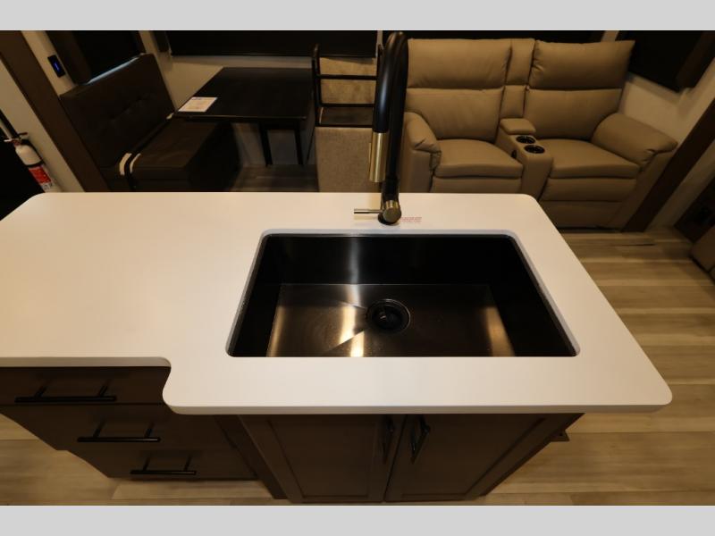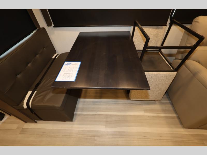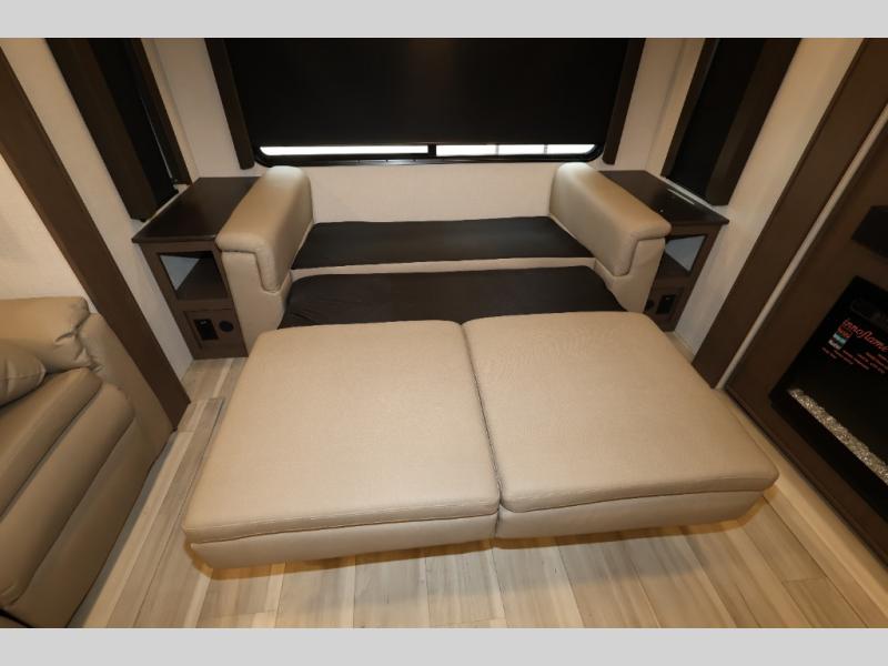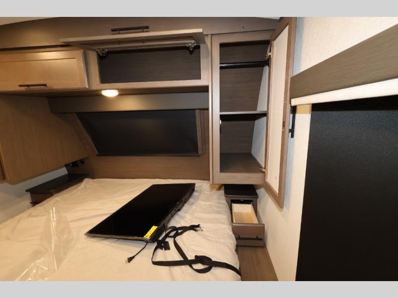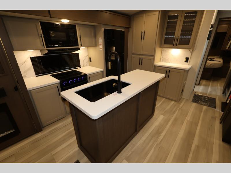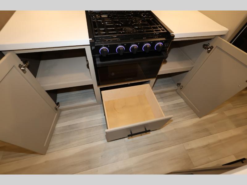Trips spent in this travel trailer are sure to bring memories! The dual opposing slides in the combined kitchen and living area provide your crew with plenty of space to relax on the theater seating, dine at the dinette table, and prep meals with the kitchen island. There is also a tri-fold sleeper sofa here for guests and a pivoting entertainment center with a hidden pantry to keep snacks stocked. And a second pantry and hutch provides even more storage! You'll love having your own private bedroom up front, complete with a king bed, dual bedside drawers and nightstands and additional storage drawers to keep your space tidy. Outside, you'll find two power awnings, a 2" accessory hitch, and a drop frame pass-thru storage for fishing poles, hiking gear, and more!