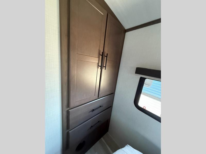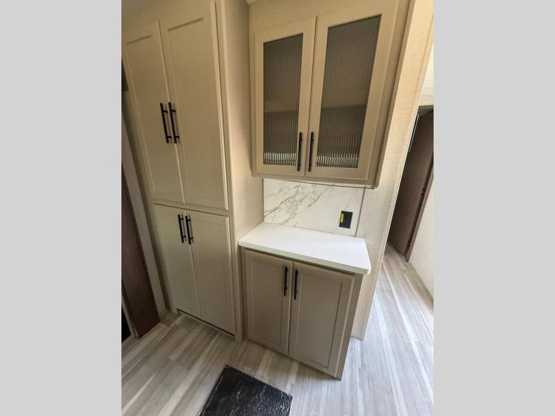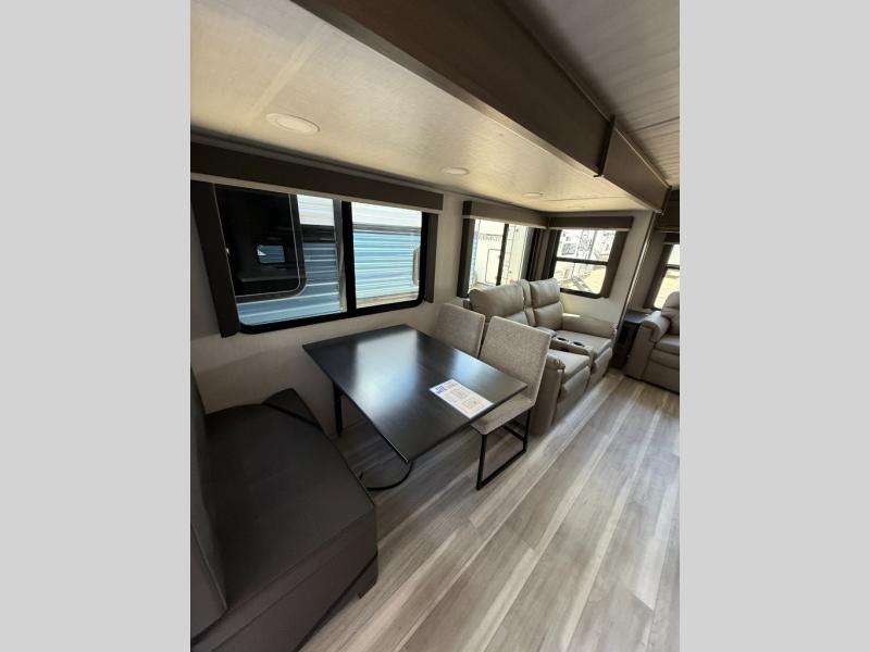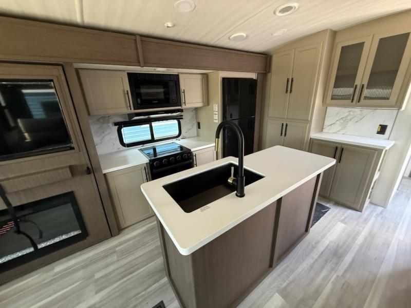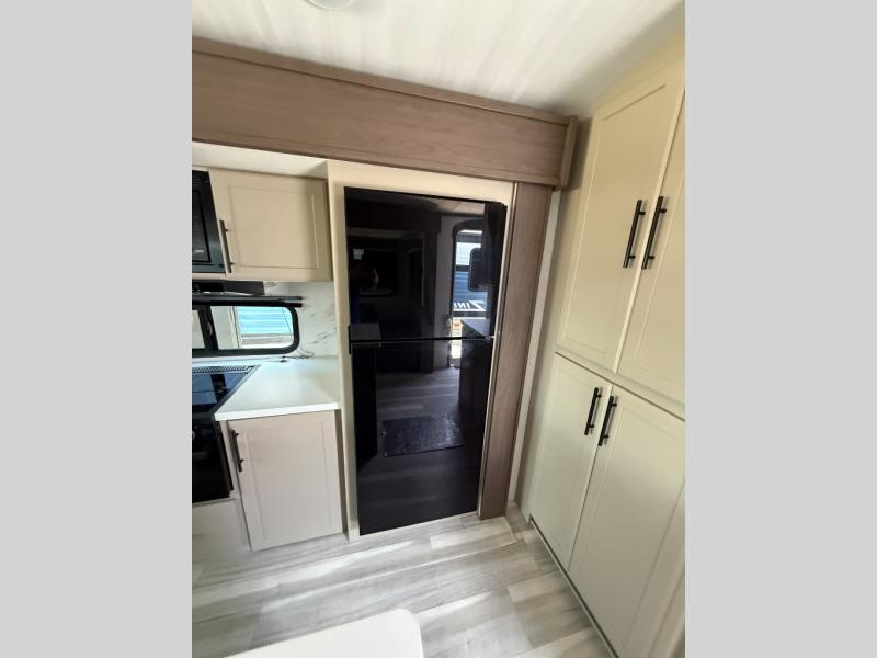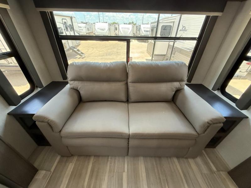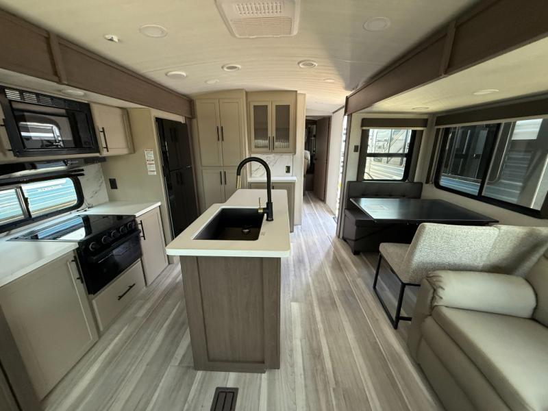 Trips spent in this travel trailer are sure to bring memories! The dual opposing slides in the combined kitchen and living area provide your crew with plenty of space to relax on the theater seating, dine at the dinette table, and prep meals with the kitchen island. There is also a tri-fold sleeper sofa here for guests and a pivoting entertainment center with a hidden pantry to keep snacks stocked. And a second pantry and hutch provides even more storage! You'll love having your own private bedroom up front, complete with a king bed, dual bedside drawers and nightstands and additional storage drawers to keep your space tidy. Outside, you'll find two power awnings, a 2" accessory hitch, and a drop frame pass-thru storage for fishing poles, hiking gear, and more!