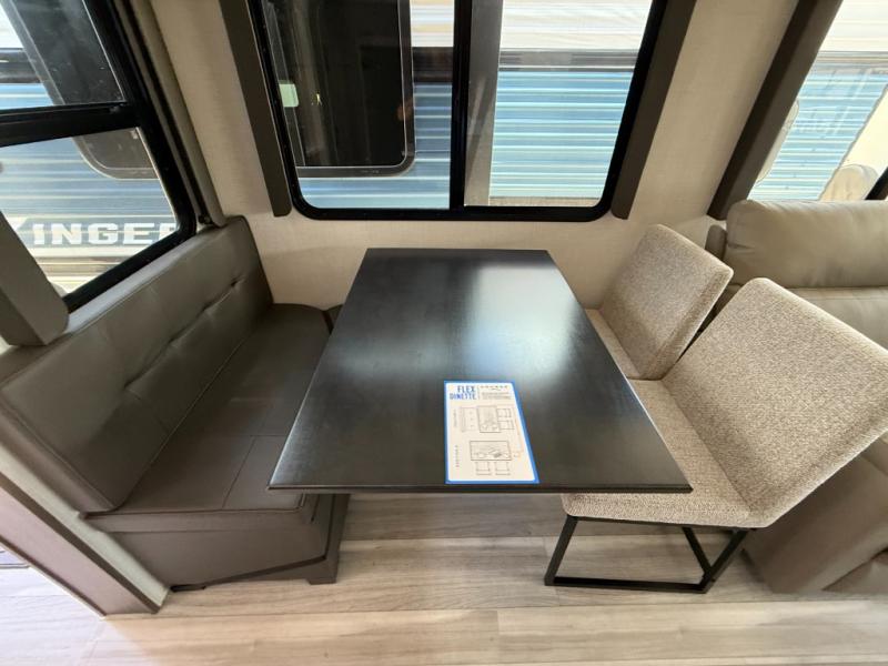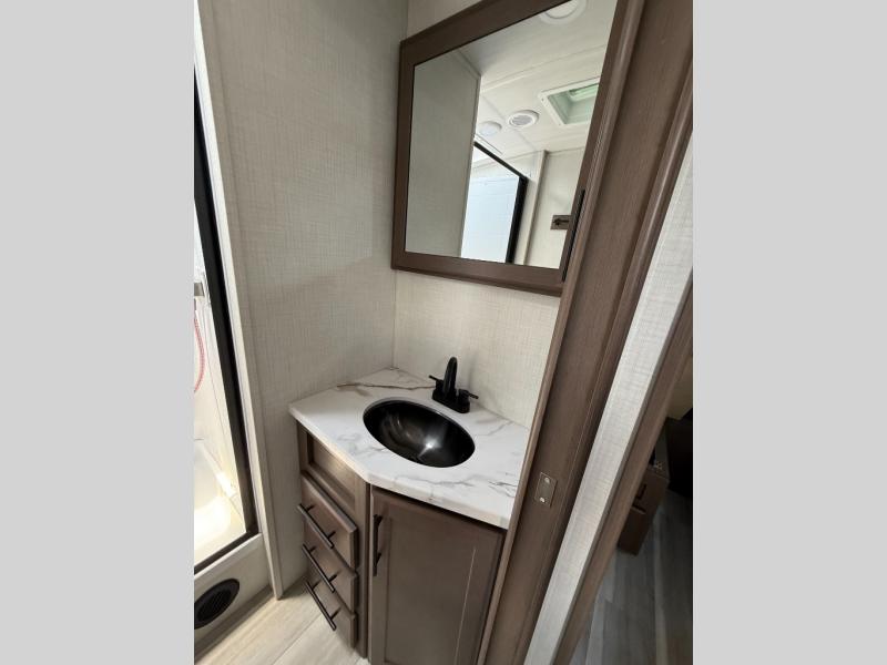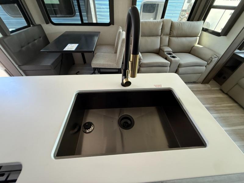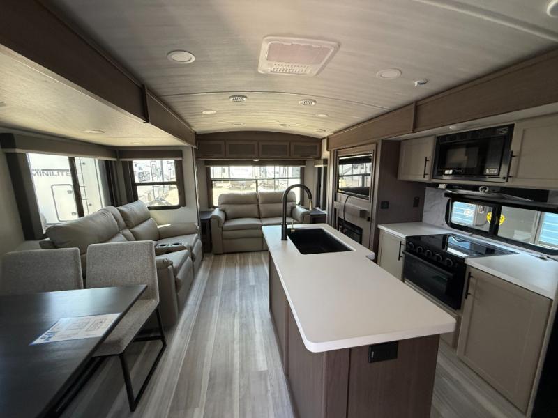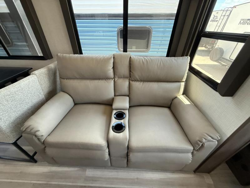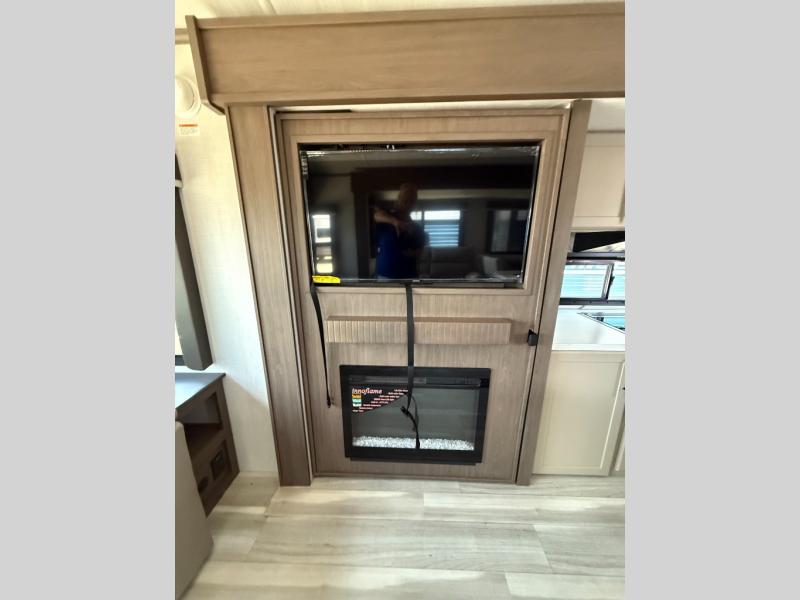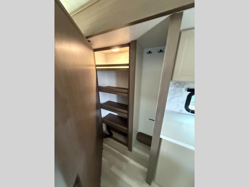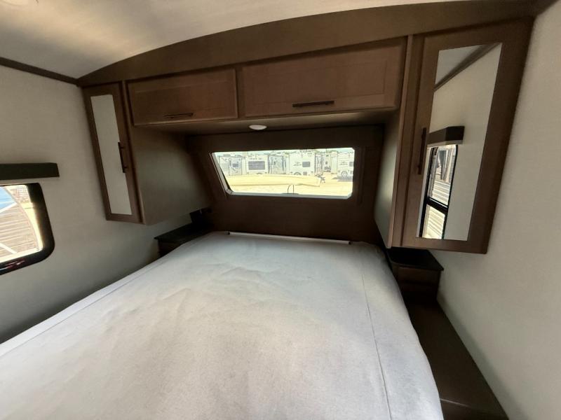 Trips spent in this travel trailer are sure to bring memories! The dual opposing slides in the combined kitchen and living area provide your crew with plenty of space to relax on the theater seating, dine at the dinette table, and prep meals with the kitchen island. There is also a tri-fold sleeper sofa here for guests and a pivoting entertainment center with a hidden pantry to keep snacks stocked. And a second pantry and hutch provides even more storage! You'll love having your own private bedroom up front, complete with a king bed, dual bedside drawers and nightstands and additional storage drawers to keep your space tidy. Outside, you'll find two power awnings, a 2" accessory hitch, and a drop frame pass-thru storage for fishing poles, hiking gear, and more!