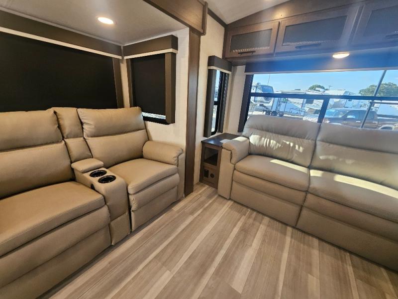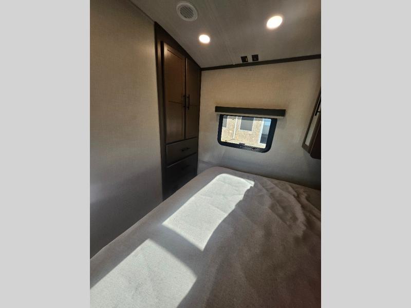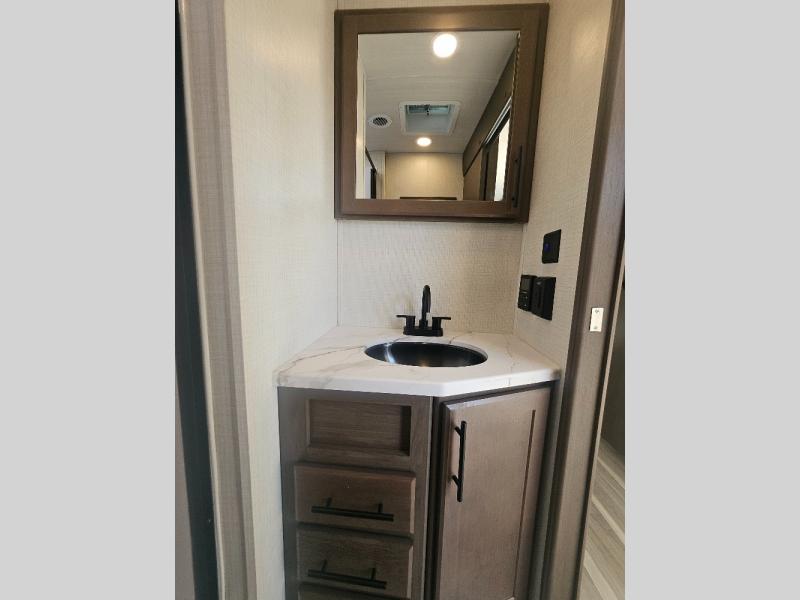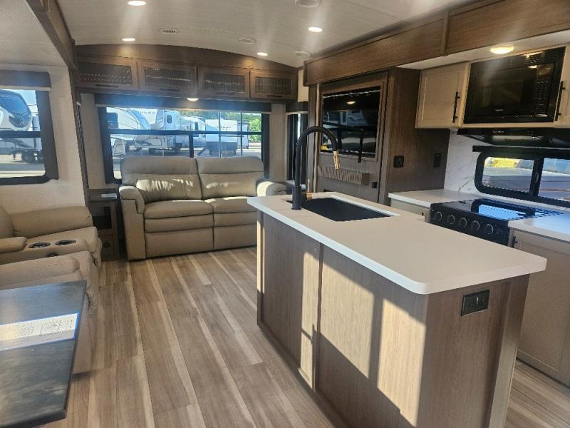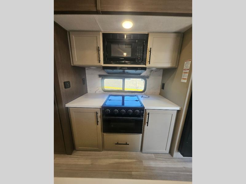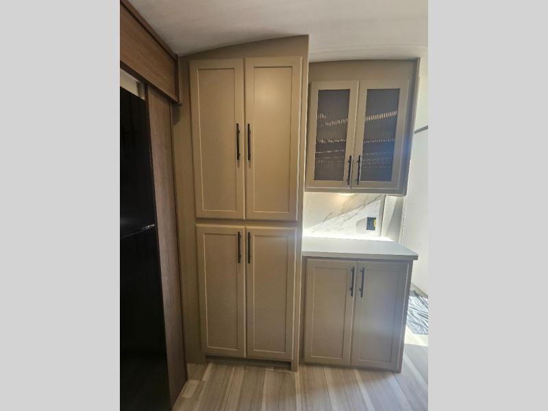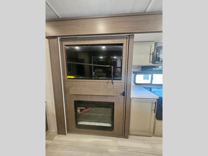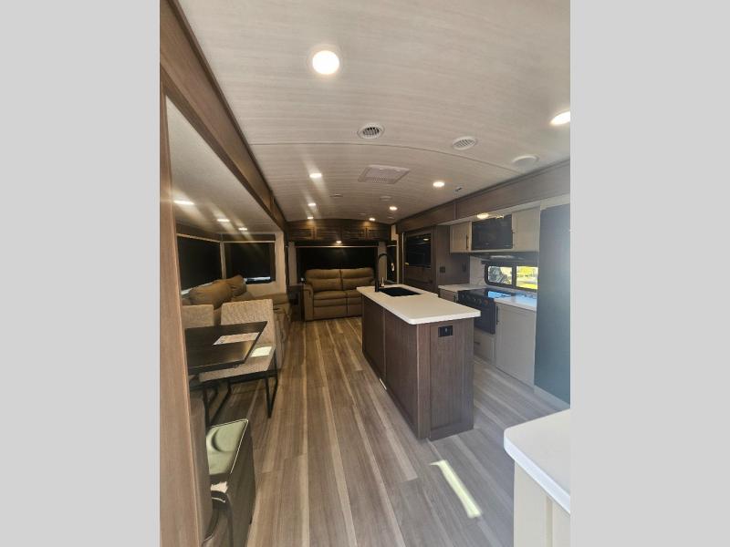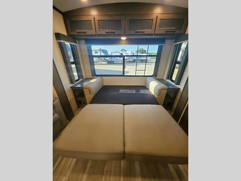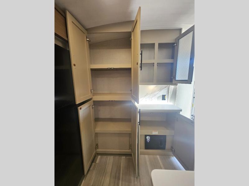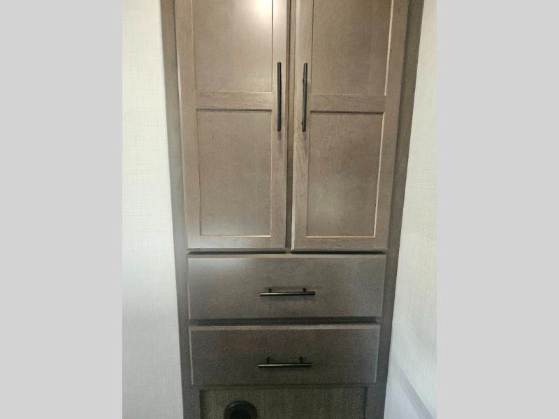 Trips spent in this travel trailer are sure to bring memories! The dual opposing slides in the combined kitchen and living area provide your crew with plenty of space to relax on the theater seating, dine at the dinette table, and prep meals with the kitchen island. There is also a tri-fold sleeper sofa here for guests and a pivoting entertainment center with a hidden pantry to keep snacks stocked. And a second pantry and hutch provides even more storage! You'll love having your own private bedroom up front, complete with a king bed, dual bedside drawers and nightstands and additional storage drawers to keep your space tidy. Outside, you'll find two power awnings, a 2" accessory hitch, and a drop frame pass-thru storage for fishing poles, hiking gear, and more!
