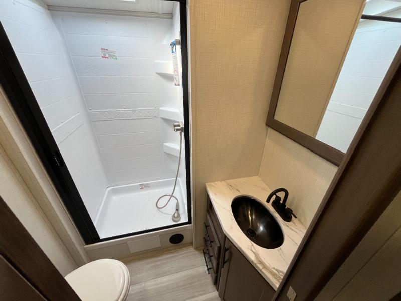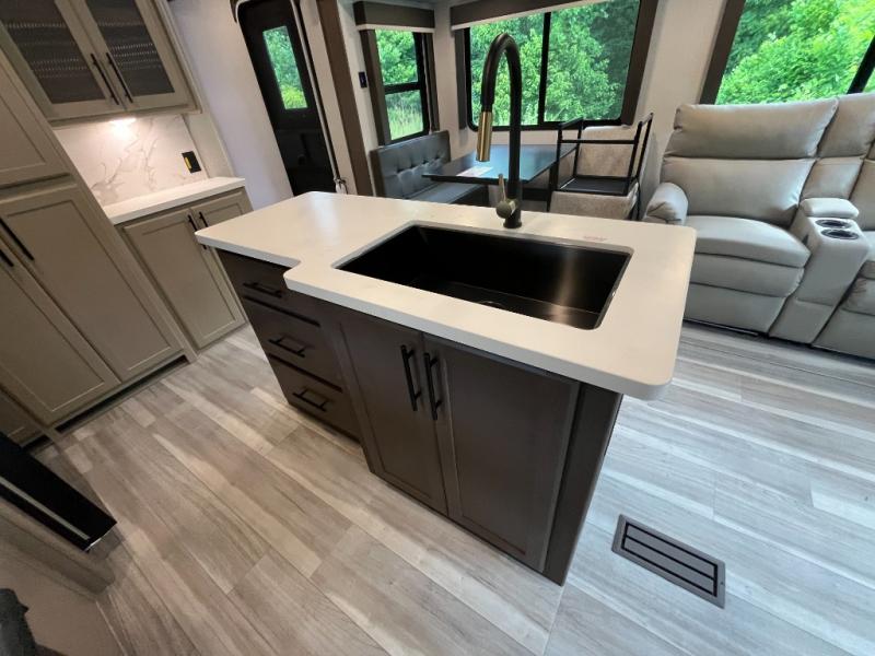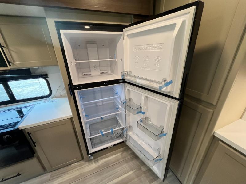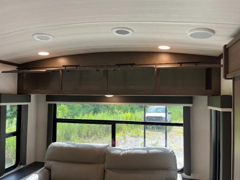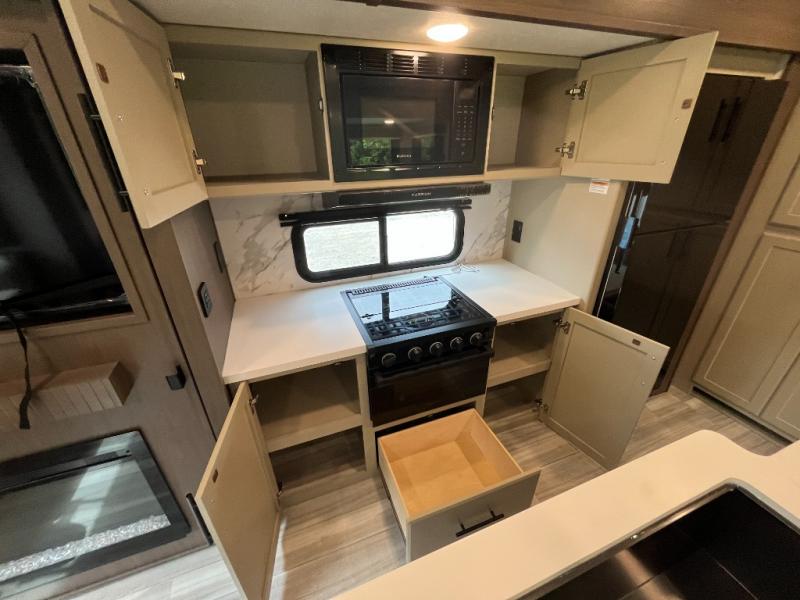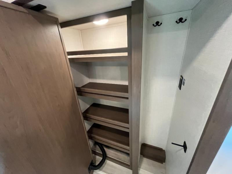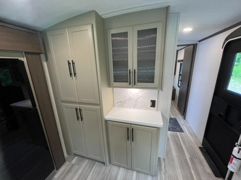 Trips spent in this travel trailer are sure to bring memories! The dual opposing slides in the combined kitchen and living area provide your crew with plenty of space to relax on the theater seating, dine at the dinette table, and prep meals with the kitchen island. There is also a tri-fold sleeper sofa here for guests and a pivoting entertainment center with a hidden pantry to keep snacks stocked. And a second pantry and hutch provides even more storage! You'll love having your own private bedroom up front, complete with a king bed, dual bedside drawers and nightstands and additional storage drawers to keep your space tidy. Outside, you'll find two power awnings, a 2" accessory hitch, and a drop frame pass-thru storage for fishing poles, hiking gear, and more!