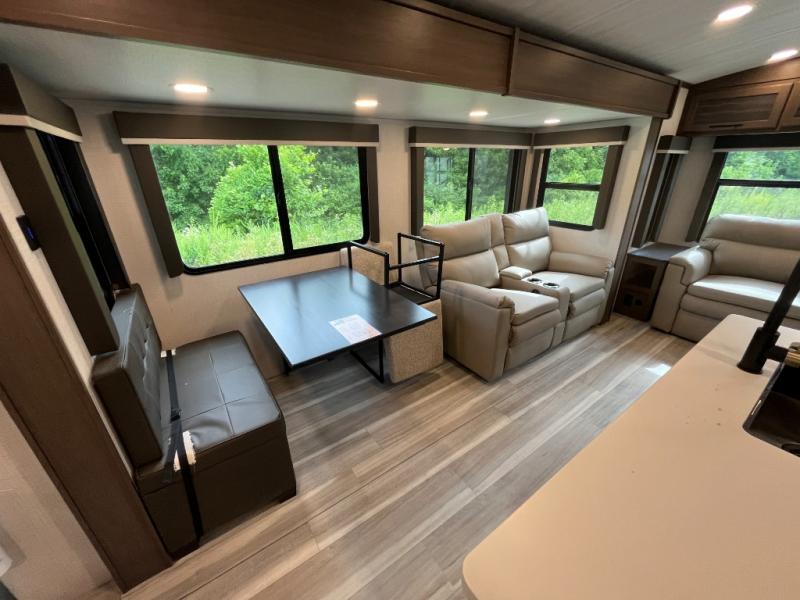 Spacious Rear Living Floorplan – Enjoy a roomy, open-concept living area with panoramic windows, a tri-fold sleeper sofa, and theater seating—perfect for relaxing or entertaining.