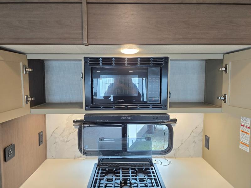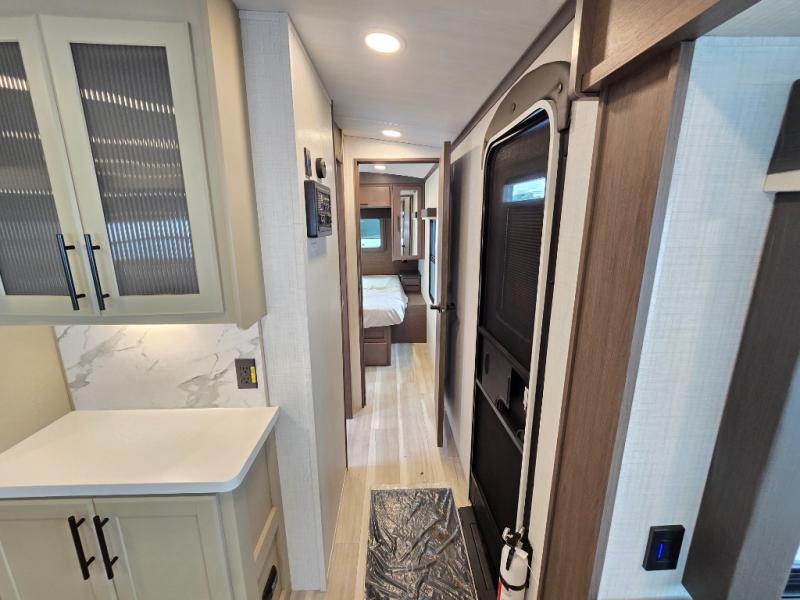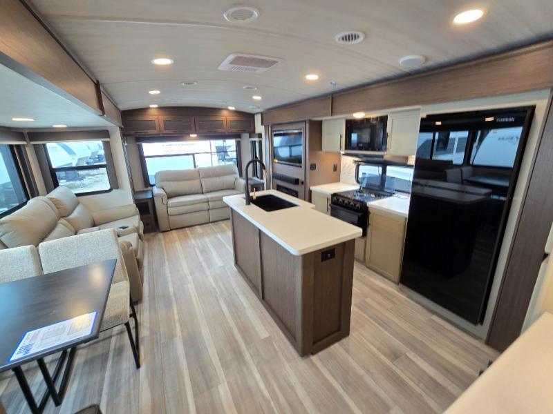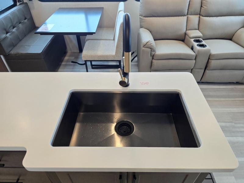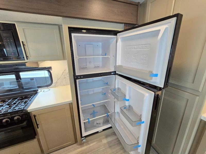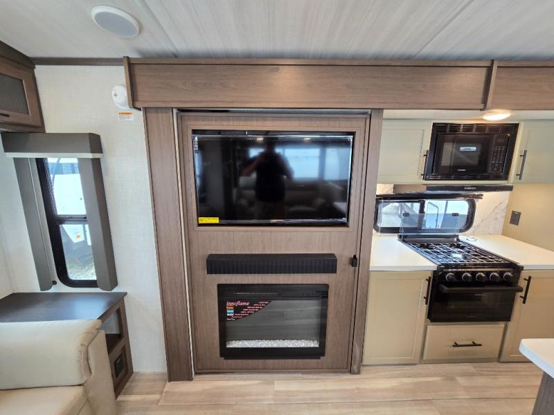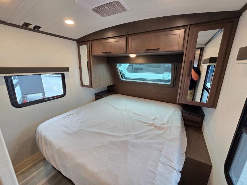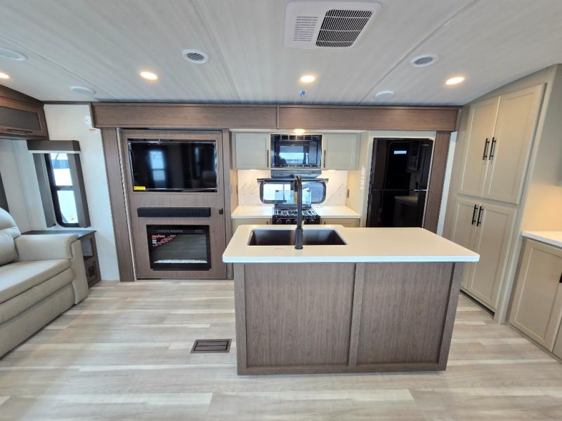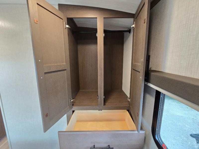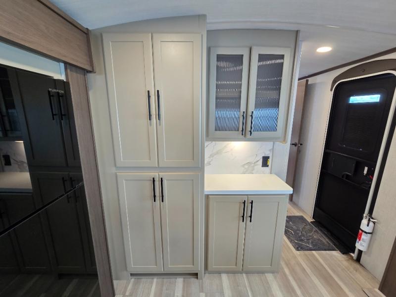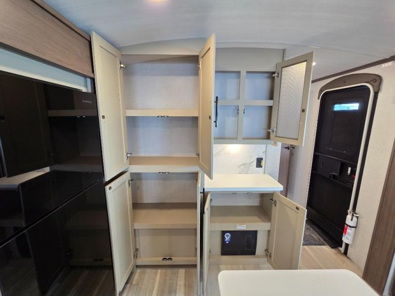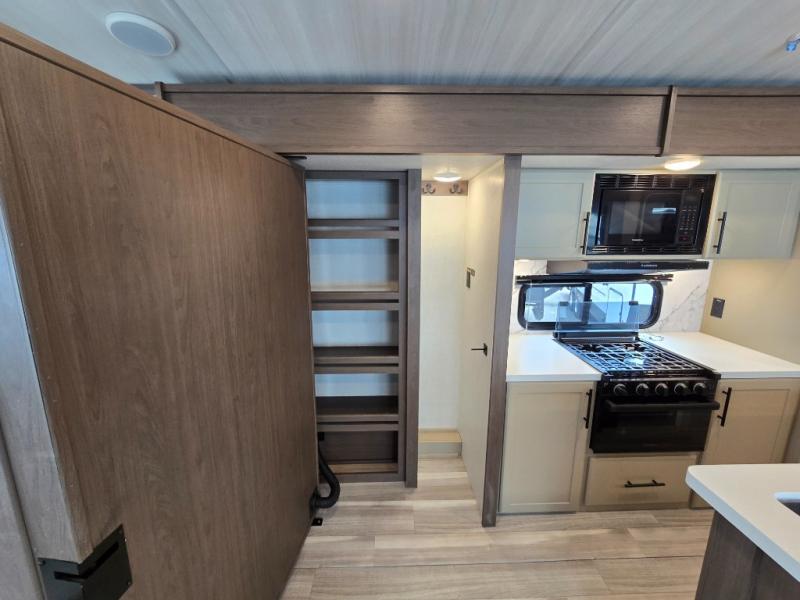 Trips spent in this travel trailer are sure to bring memories! The dual opposing slides in the combined kitchen and living area provide your crew with plenty of space to relax on the theater seating, dine at the dinette table, and prep meals with the kitchen island. There is also a tri-fold sleeper sofa here for guests and a pivoting entertainment center with a hidden pantry to keep snacks stocked. And a second pantry and hutch provides even more storage! You'll love having your own private bedroom up front, complete with a king bed, dual bedside drawers and nightstands and additional storage drawers to keep your space tidy. Outside, you'll find two power awnings, a 2" accessory hitch, and a drop frame pass-thru storage for fishing poles, hiking gear, and more!