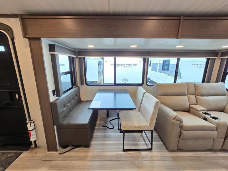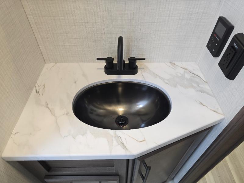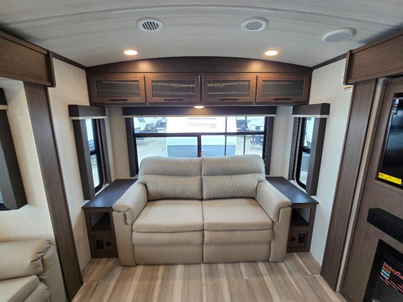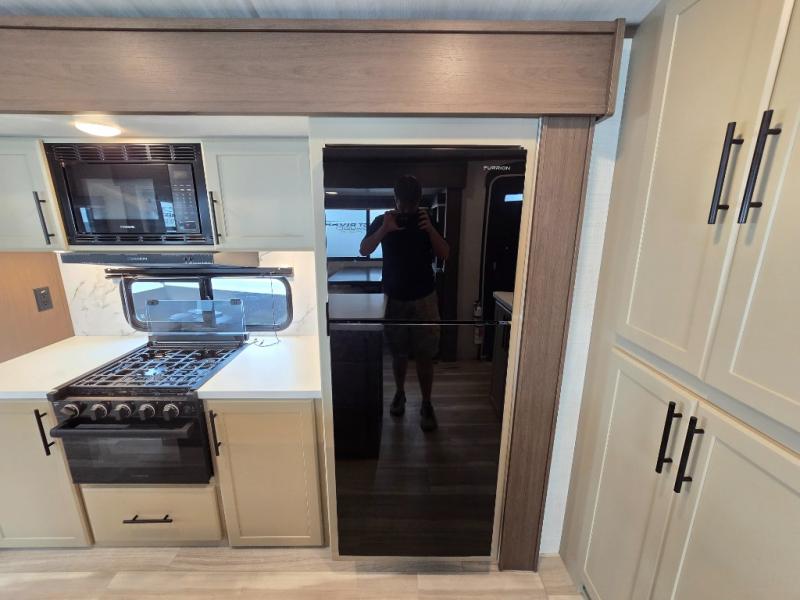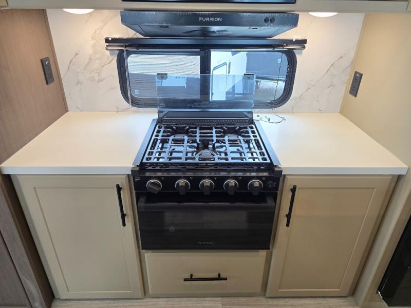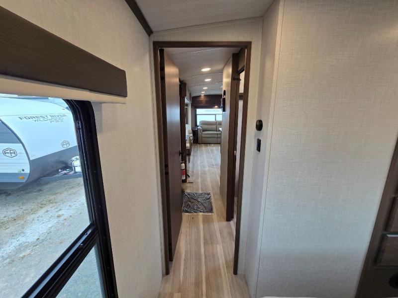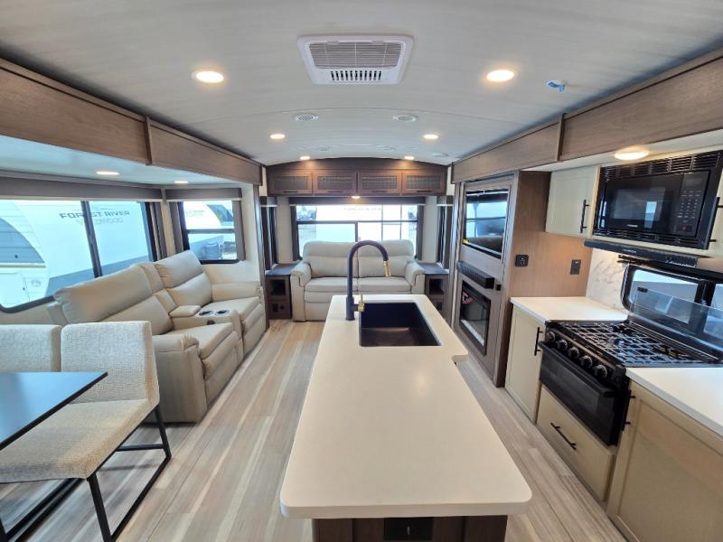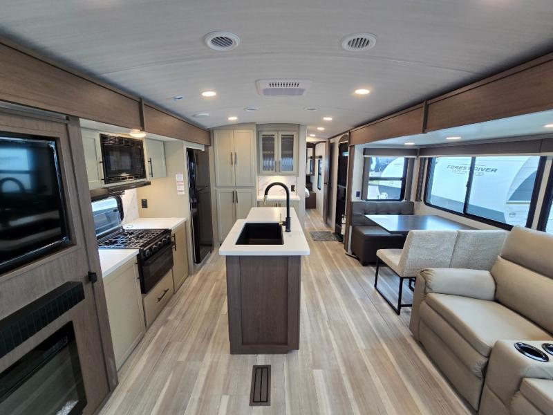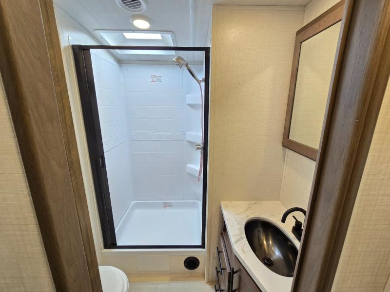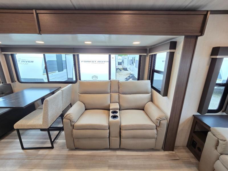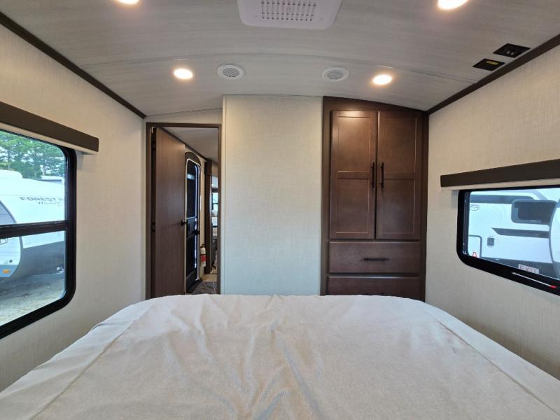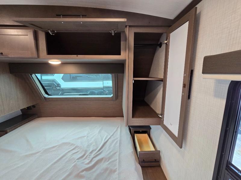 Trips spent in this travel trailer are sure to bring memories! The dual opposing slides in the combined kitchen and living area provide your crew with plenty of space to relax on the theater seating, dine at the dinette table, and prep meals with the kitchen island. There is also a tri-fold sleeper sofa here for guests and a pivoting entertainment center with a hidden pantry to keep snacks stocked. And a second pantry and hutch provides even more storage! You'll love having your own private bedroom up front, complete with a king bed, dual bedside drawers and nightstands and additional storage drawers to keep your space tidy. Outside, you'll find two power awnings, a 2" accessory hitch, and a drop frame pass-thru storage for fishing poles, hiking gear, and more!
