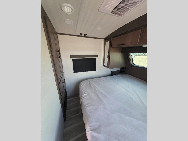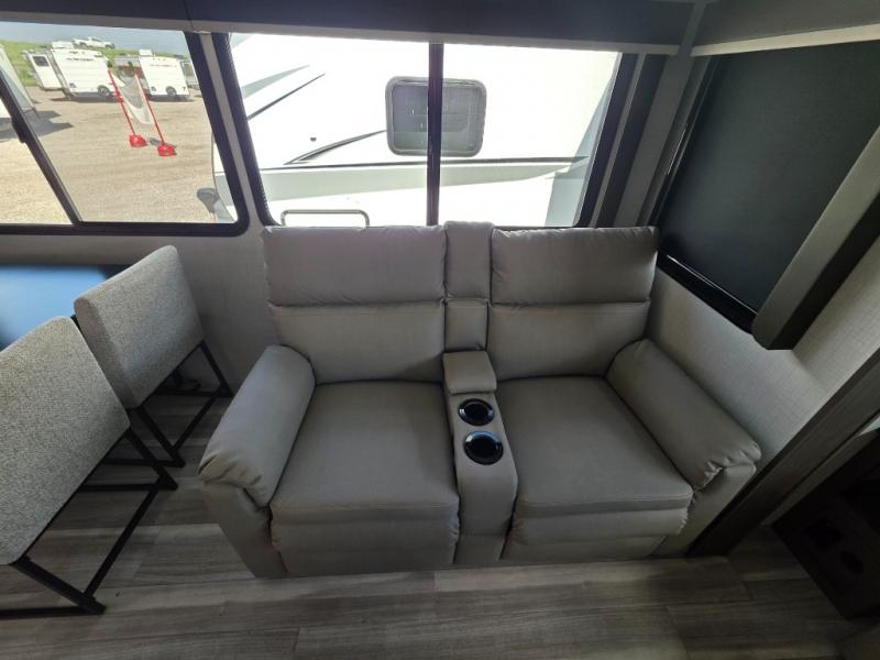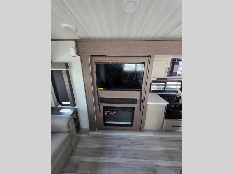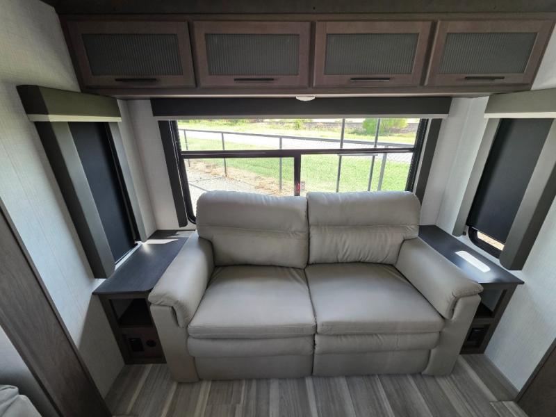 Trips spent in this travel trailer are sure to bring memories! The dual opposing slides in the combined kitchen and living area provide your crew with plenty of space to relax on the theater seating, dine at the dinette table, and prep meals with the kitchen island. There is also a tri-fold sleeper sofa here for guests and a pivoting entertainment center with a hidden pantry to keep snacks stocked. And a second pantry and hutch provides even more storage! You'll love having your own private bedroom up front, complete with a king bed, dual bedside drawers and nightstands and additional storage drawers to keep your space tidy. Outside, you'll find two power awnings, a 2" accessory hitch, and a drop frame pass-thru storage for fishing poles, hiking gear, and more!