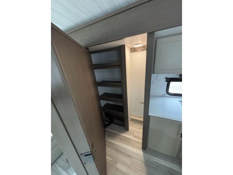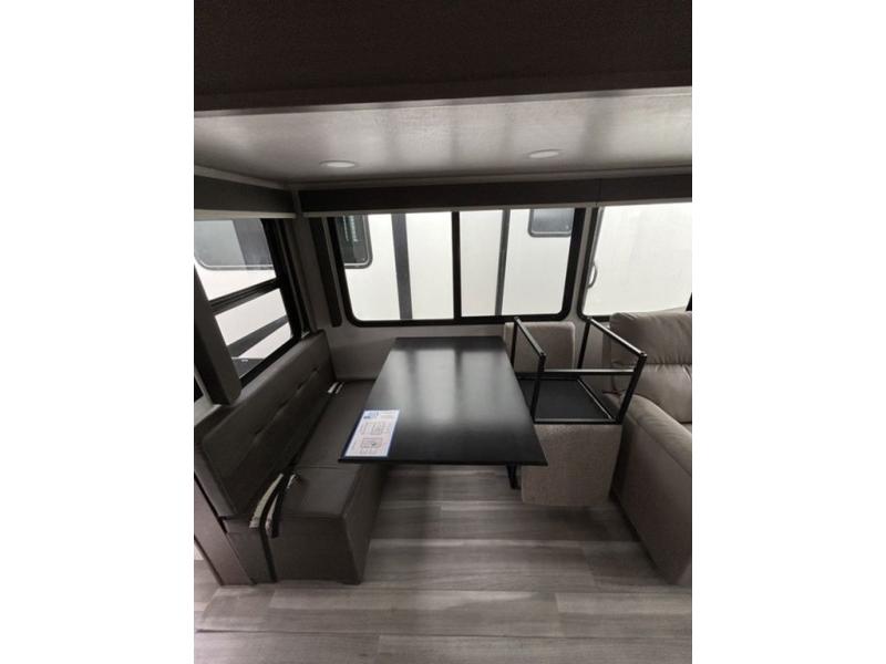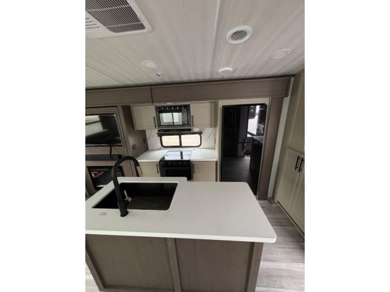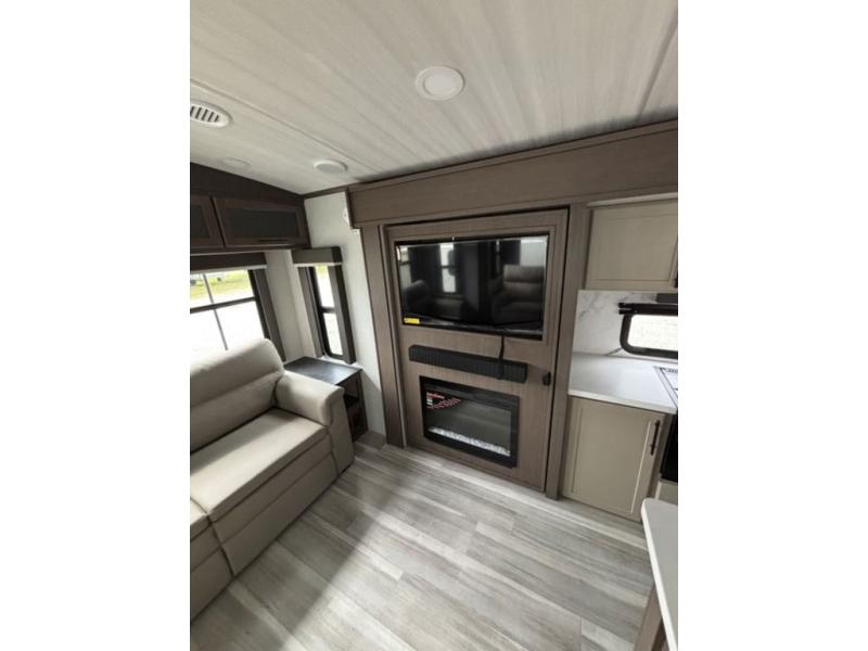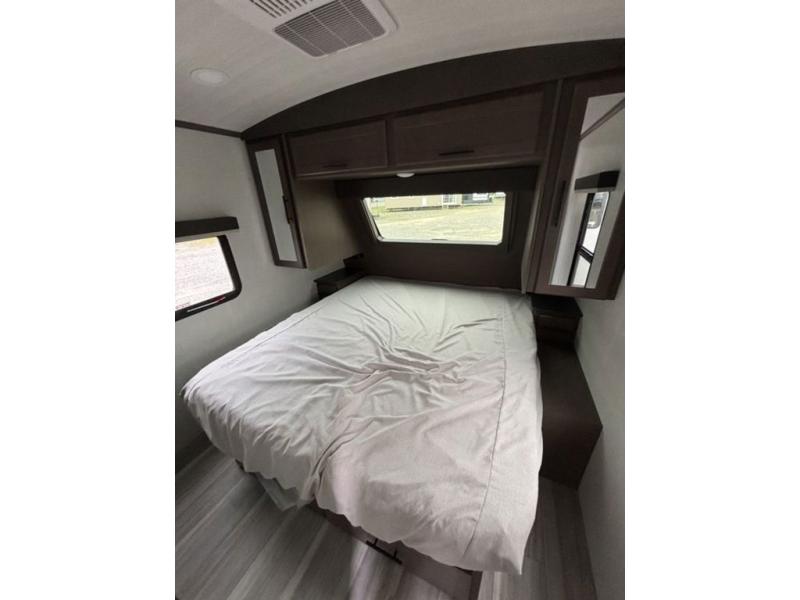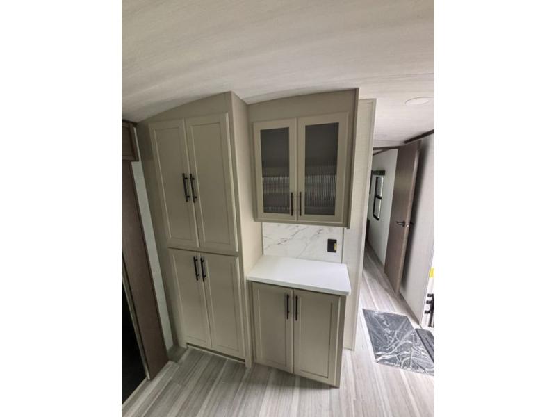 Trips spent in this travel trailer are sure to bring memories! The dual opposing slides in the combined kitchen and living area provide your crew with plenty of space to relax on the theater seating, dine at the dinette table, and prep meals with the kitchen island. There is also a tri-fold sleeper sofa here for guests and a pivoting entertainment center with a hidden pantry to keep snacks stocked. And a second pantry and hutch provides even more storage! You'll love having your own private bedroom up front, complete with a king bed, dual bedside drawers and nightstands and additional storage drawers to keep your space tidy. Outside, you'll find two power awnings, a 2" accessory hitch, and a drop frame pass-thru storage for fishing poles, hiking gear, and more!