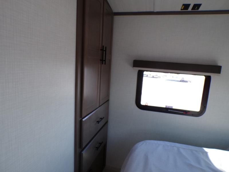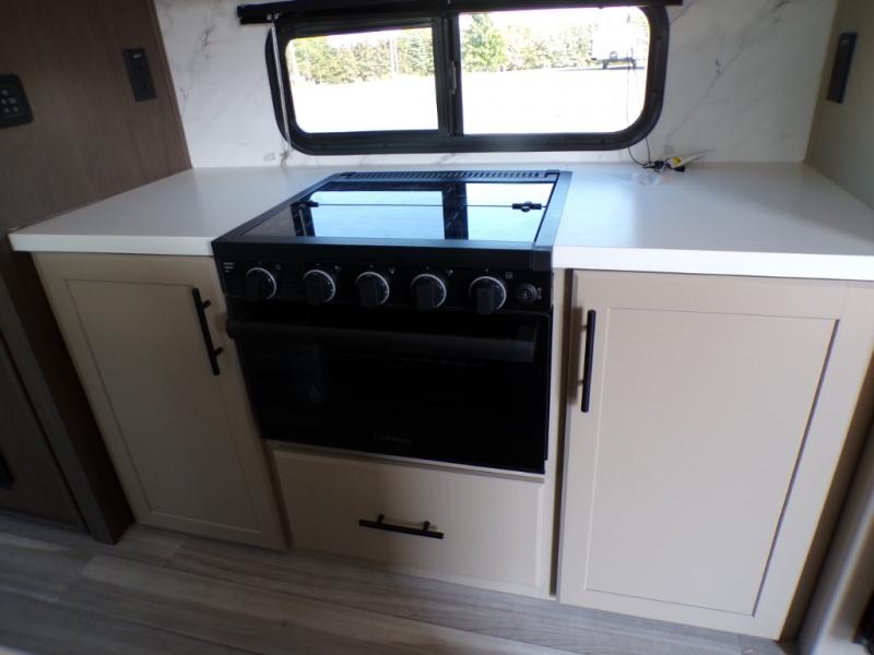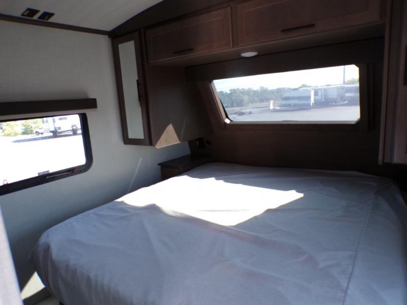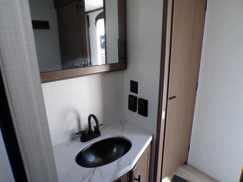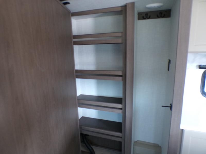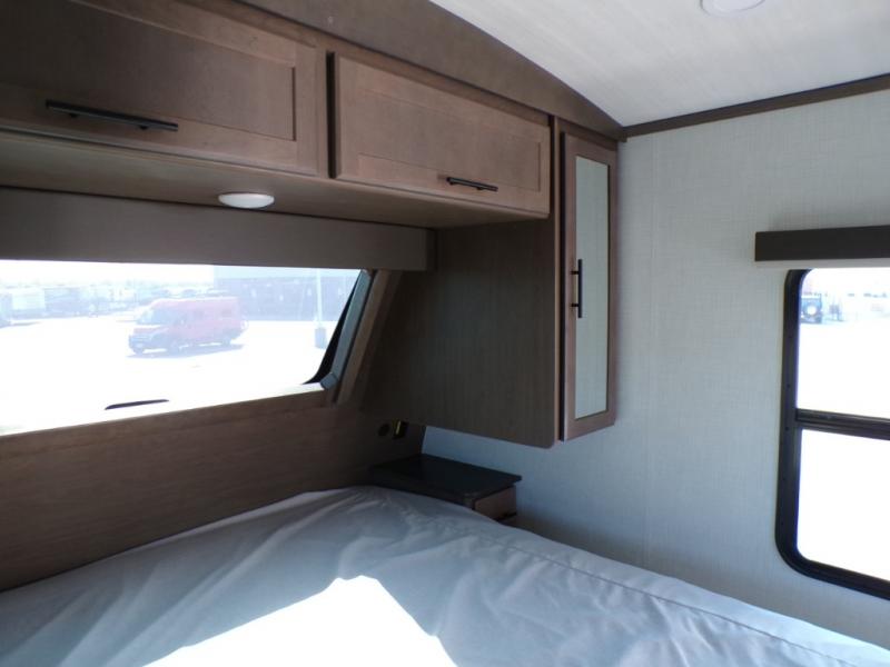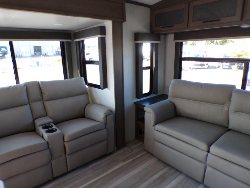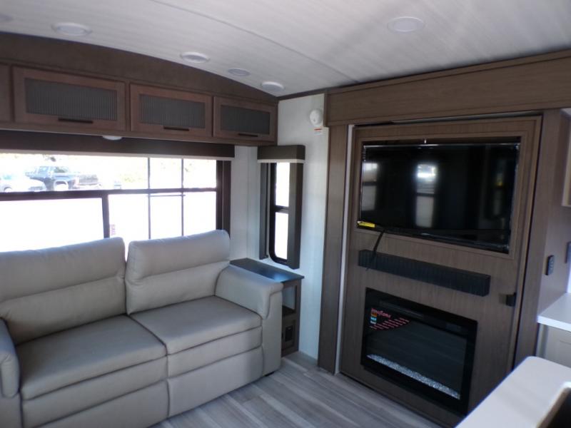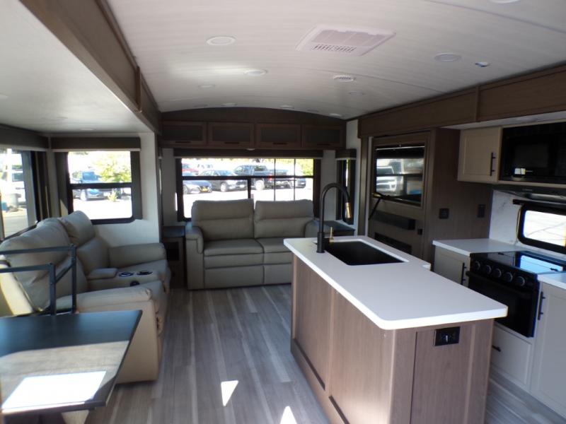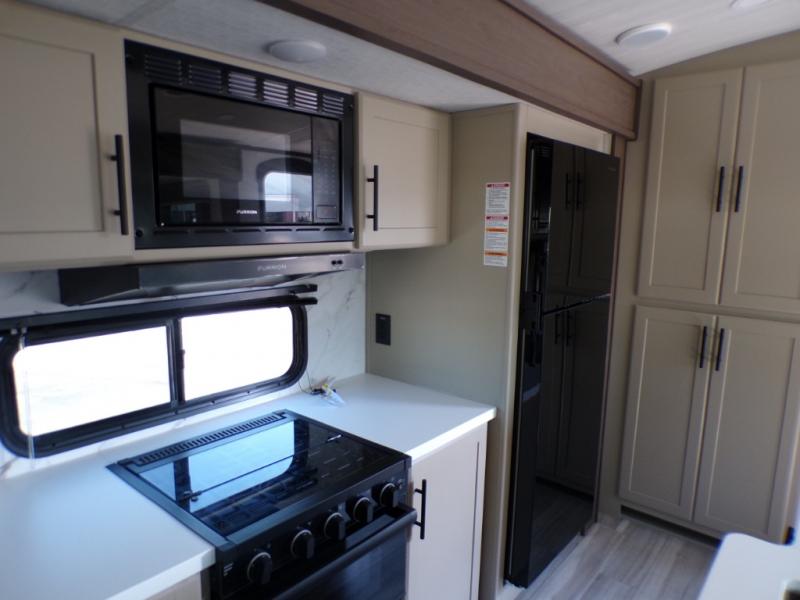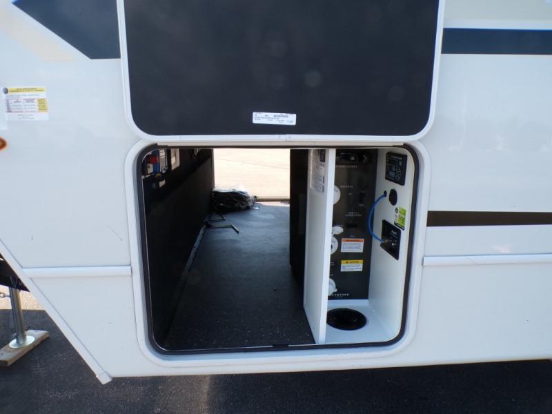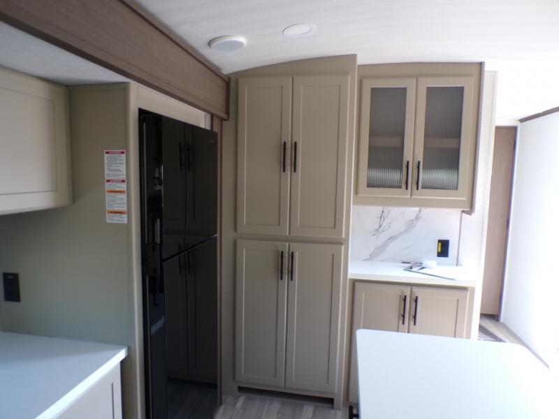 Trips spent in this travel trailer are sure to bring memories! The dual opposing slides in the combined kitchen and living area provide your crew with plenty of space to relax on the theater seating, dine at the dinette table, and prep meals with the kitchen island. There is also a tri-fold sleeper sofa here for guests and a pivoting entertainment center with a hidden pantry to keep snacks stocked. And a second pantry and hutch provides even more storage! You'll love having your own private bedroom up front, complete with a king bed, dual bedside drawers and nightstands and additional storage drawers to keep your space tidy. Outside, you'll find two power awnings, a 2" accessory hitch, and a drop frame pass-thru storage for fishing poles, hiking gear, and more!