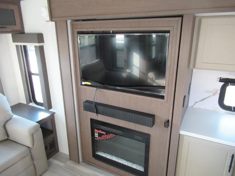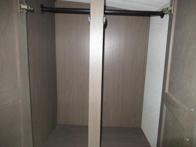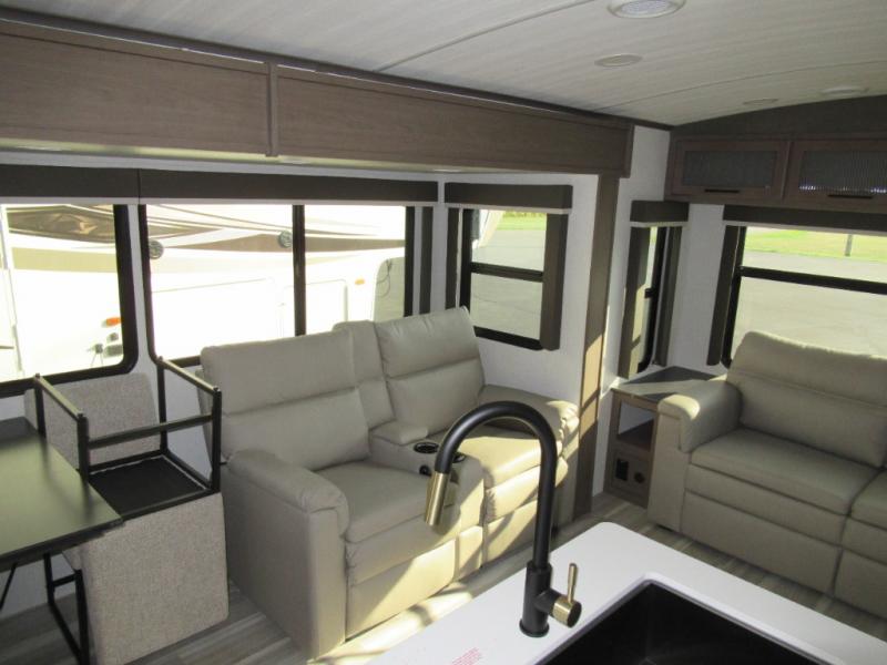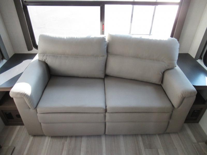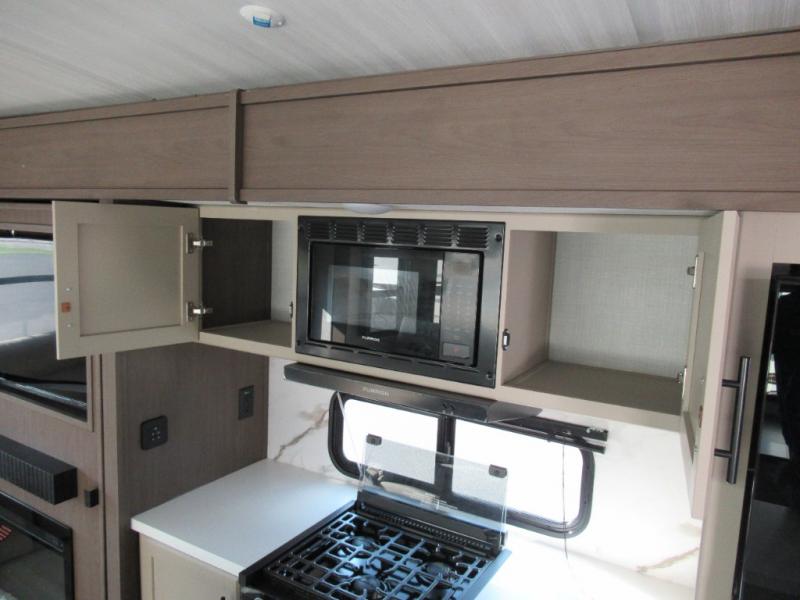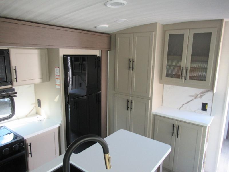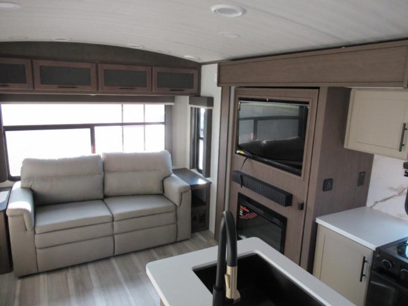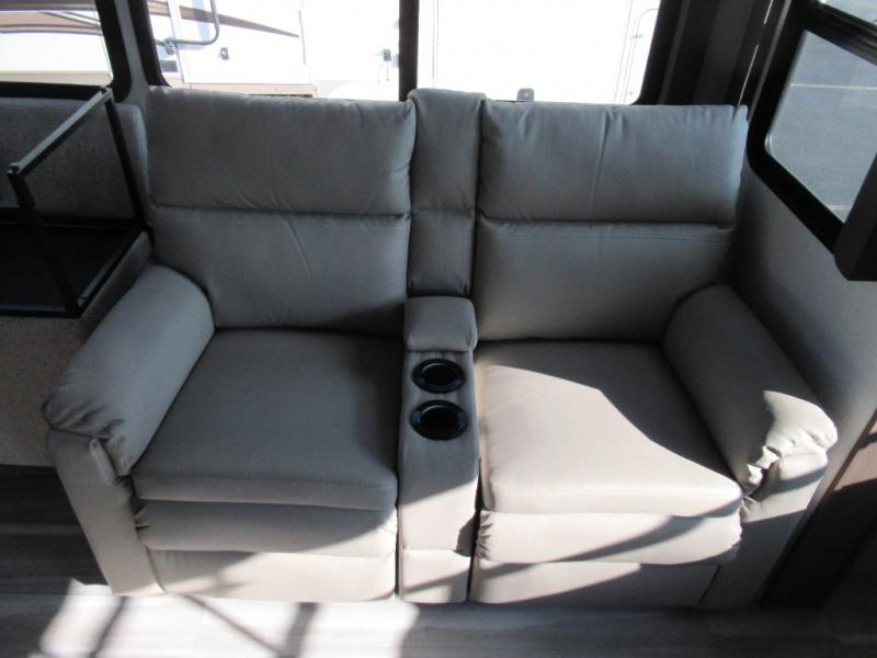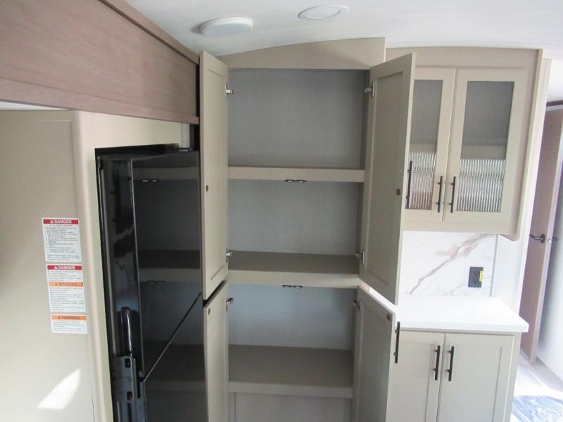 Trips spent in this travel trailer are sure to bring memories! The dual opposing slides in the combined kitchen and living area provide your crew with plenty of space to relax on the theater seating, dine at the dinette table, and prep meals with the kitchen island. There is also a tri-fold sleeper sofa here for guests and a pivoting entertainment center with a hidden pantry to keep snacks stocked. And a second pantry and hutch provides even more storage! You'll love having your own private bedroom up front, complete with a king bed, dual bedside drawers and nightstands and additional storage drawers to keep your space tidy. Outside, you'll find two power awnings, a 2" accessory hitch, and a drop frame pass-thru storage for fishing poles, hiking gear, and more!
