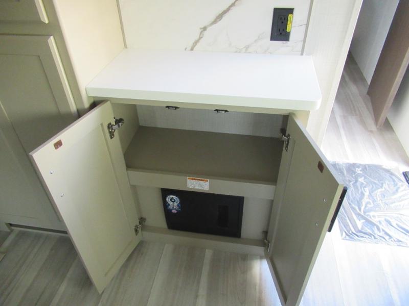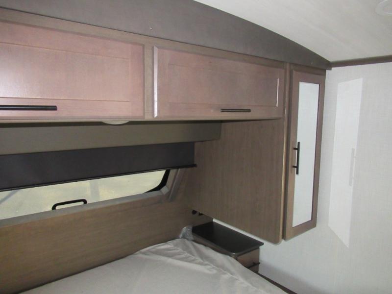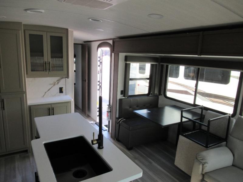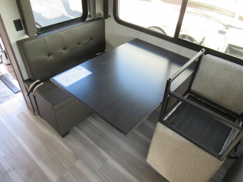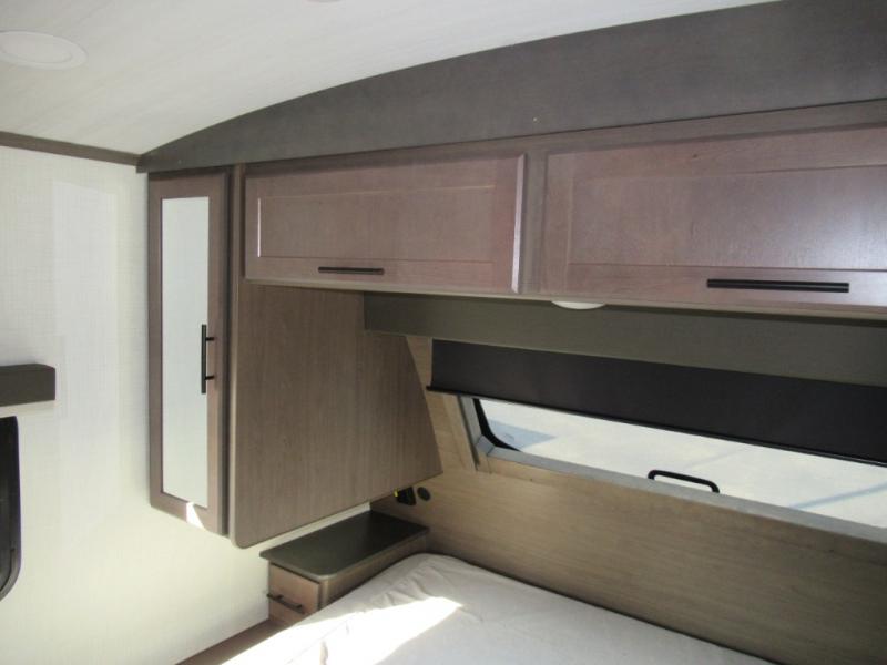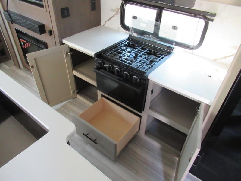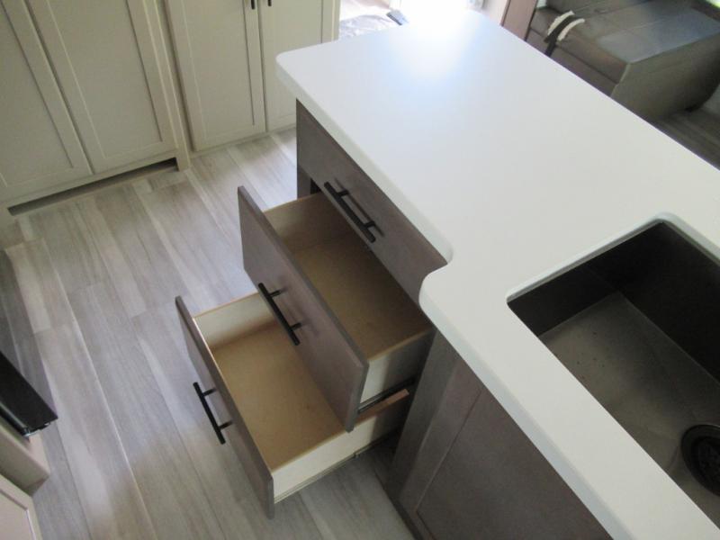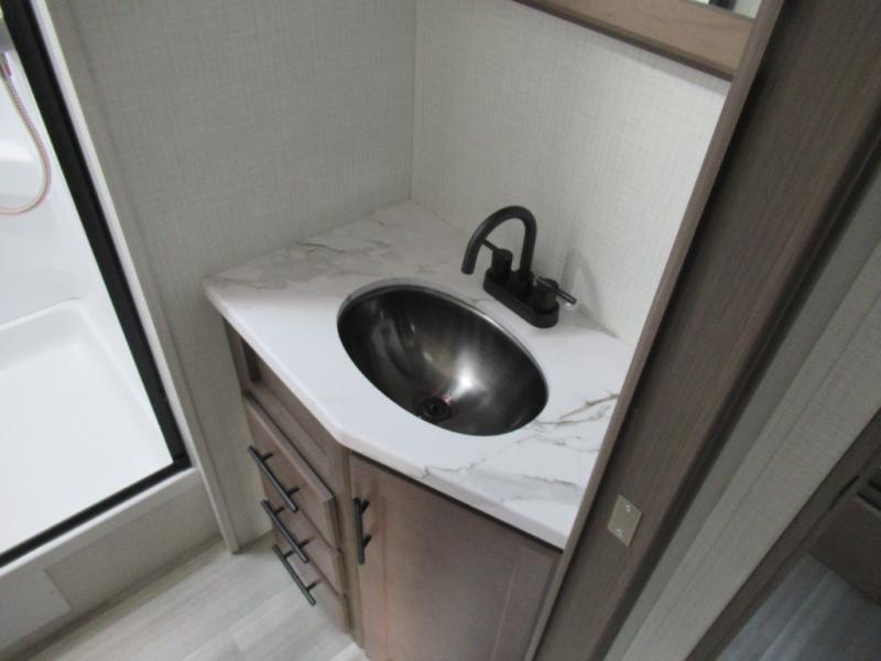 Trips spent in this travel trailer are sure to bring memories! The dual opposing slides in the combined kitchen and living area provide your crew with plenty of space to relax on the theater seating, dine at the dinette table, and prep meals with the kitchen island. There is also a tri-fold sleeper sofa here for guests and a pivoting entertainment center with a hidden pantry to keep snacks stocked. And a second pantry and hutch provides even more storage! You'll love having your own private bedroom up front, complete with a king bed, dual bedside drawers and nightstands and additional storage drawers to keep your space tidy. Outside, you'll find two power awnings, a 2" accessory hitch, and a drop frame pass-thru storage for fishing poles, hiking gear, and more!