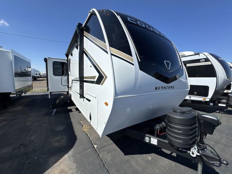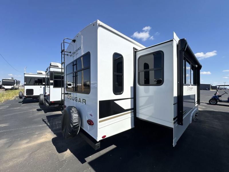 The Keystone Cougar Half-Ton fifth wheel and travel trailers are known as one of America's favorites for a reason! Some of those reasons are the exclusive features that come from Keystone, like the Winegard Air 360+ omni-directional rooftop antenna, the in-floor heating ducts, and the HyperCore composite wall construction with Vixen Fibrogloss high-gloss finish. The Cougar Half-Ton has a Climate Guard protection package with heat-deflecting white sidewalls, two roof attic vents, PEX plumbing and more to enjoy four season camping. Inside, you'll love the dimmable lighting, night roller shades throughout, shower skylight, and bedside USB outlets to keep your electronics charged.