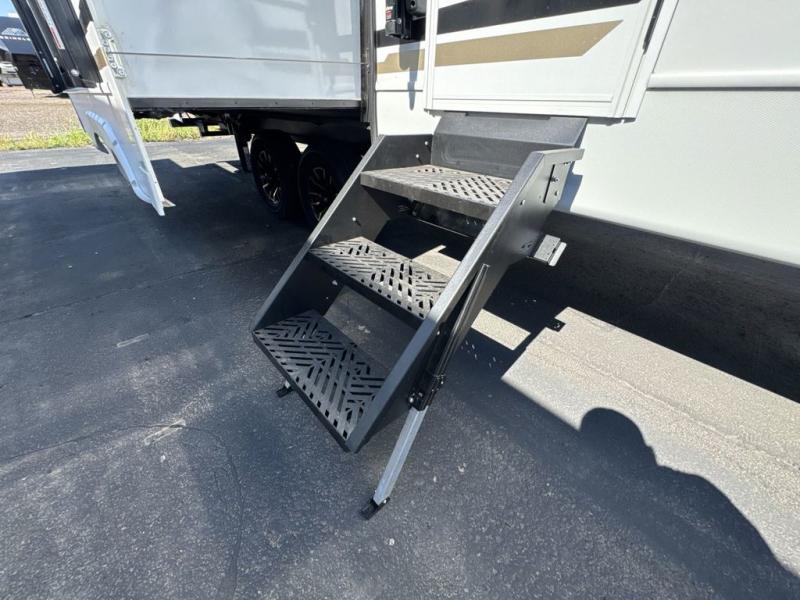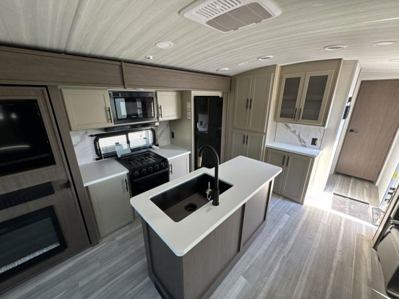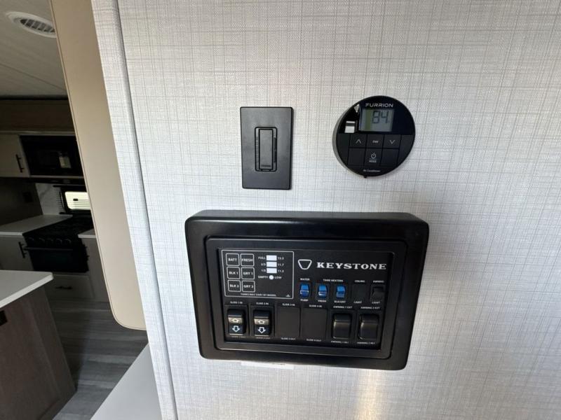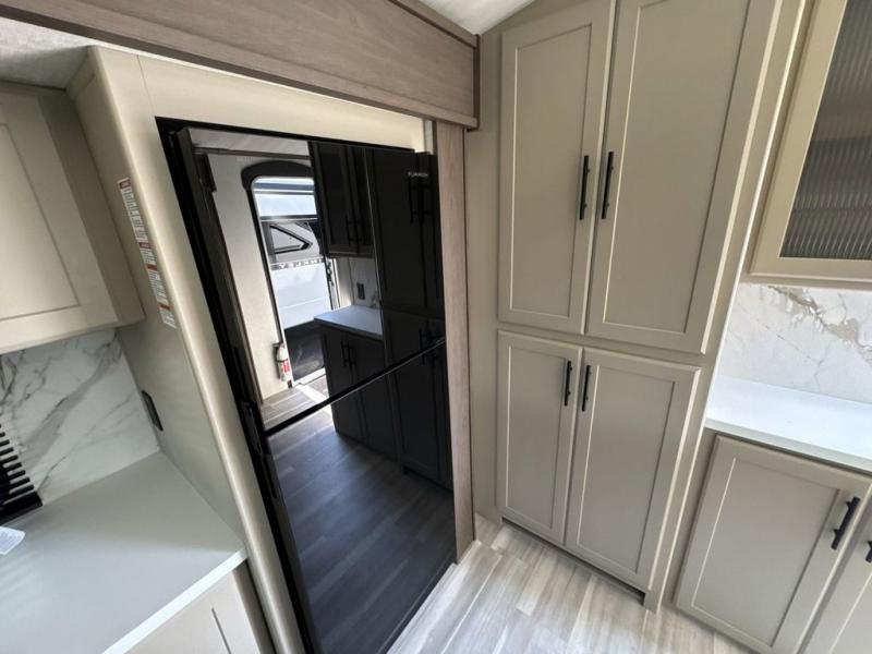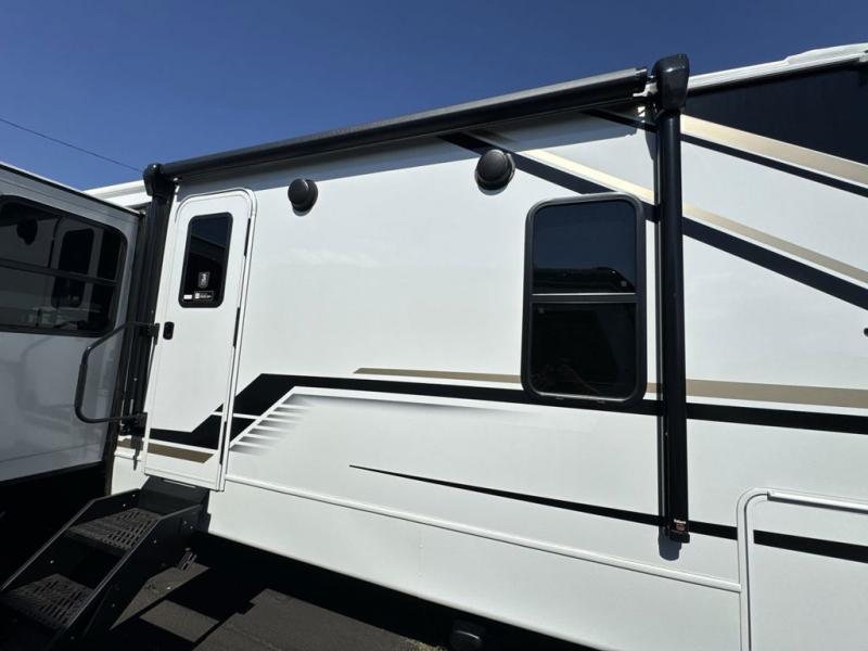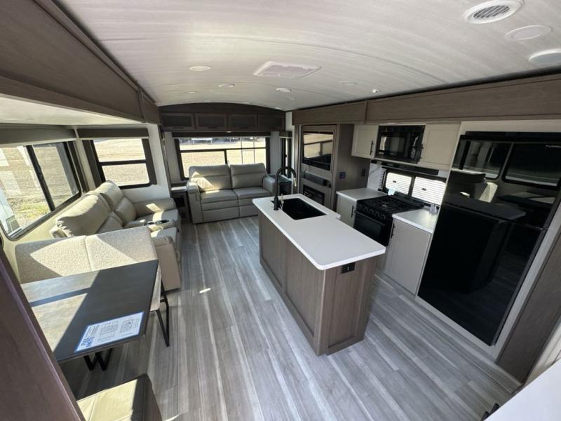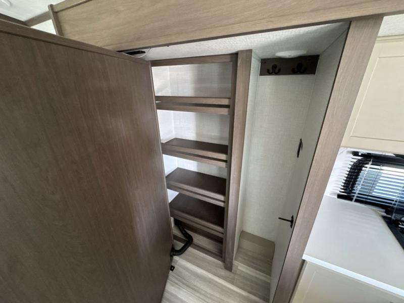 Trips spent in this travel trailer are sure to bring memories! The dual opposing slides in the combined kitchen and living area provide your crew with plenty of space to relax on the theater seating, dine at the dinette table, and prep meals with the kitchen island. There is also a tri-fold sleeper sofa here for guests and a pivoting entertainment center with a hidden pantry to keep snacks stocked. And a second pantry and hutch provides even more storage! You'll love having your own private bedroom up front, complete with a king bed, dual bedside drawers and nightstands and additional storage drawers to keep your space tidy. Outside, you'll find two power awnings, a 2" accessory hitch, and a drop frame pass-thru storage for fishing poles, hiking gear, and more!