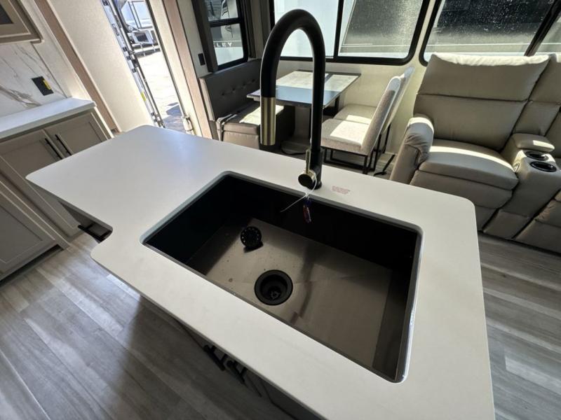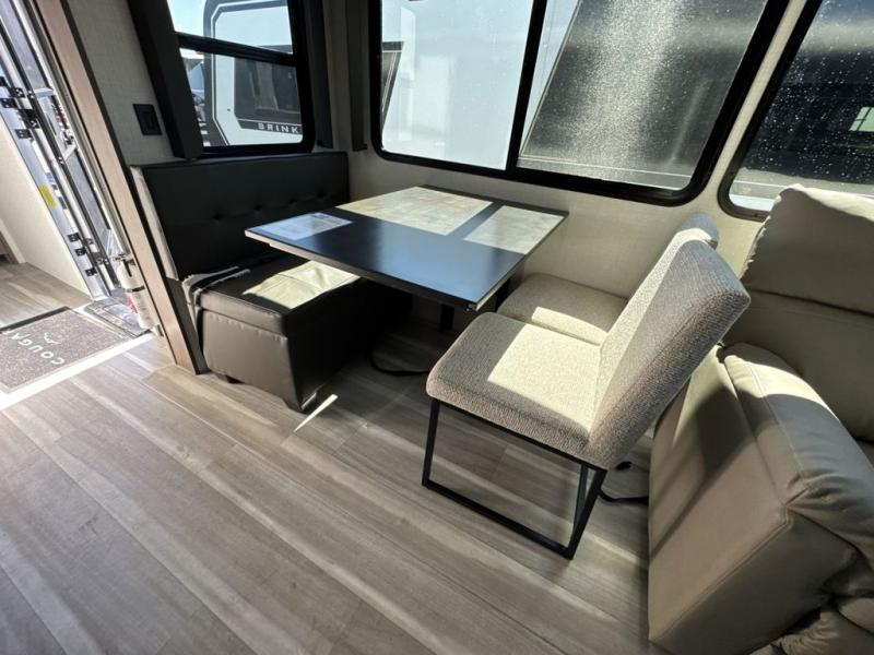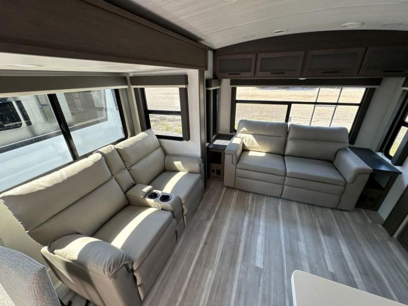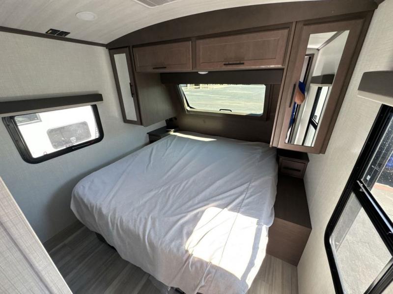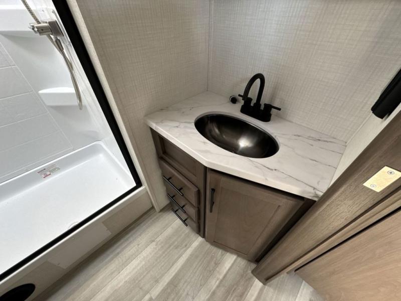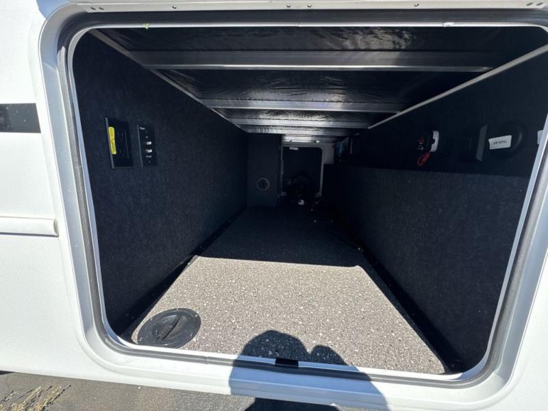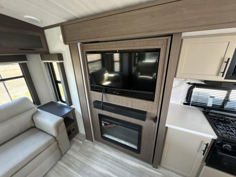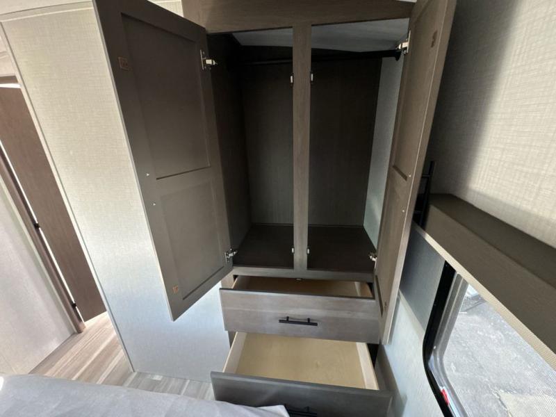 Trips spent in this travel trailer are sure to bring memories! The dual opposing slides in the combined kitchen and living area provide your crew with plenty of space to relax on the theater seating, dine at the dinette table, and prep meals with the kitchen island. There is also a tri-fold sleeper sofa here for guests and a pivoting entertainment center with a hidden pantry to keep snacks stocked. And a second pantry and hutch provides even more storage! You'll love having your own private bedroom up front, complete with a king bed, dual bedside drawers and nightstands and additional storage drawers to keep your space tidy. Outside, you'll find two power awnings, a 2" accessory hitch, and a drop frame pass-thru storage for fishing poles, hiking gear, and more!