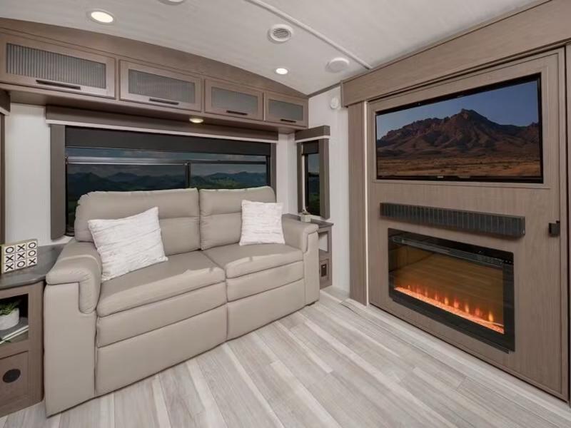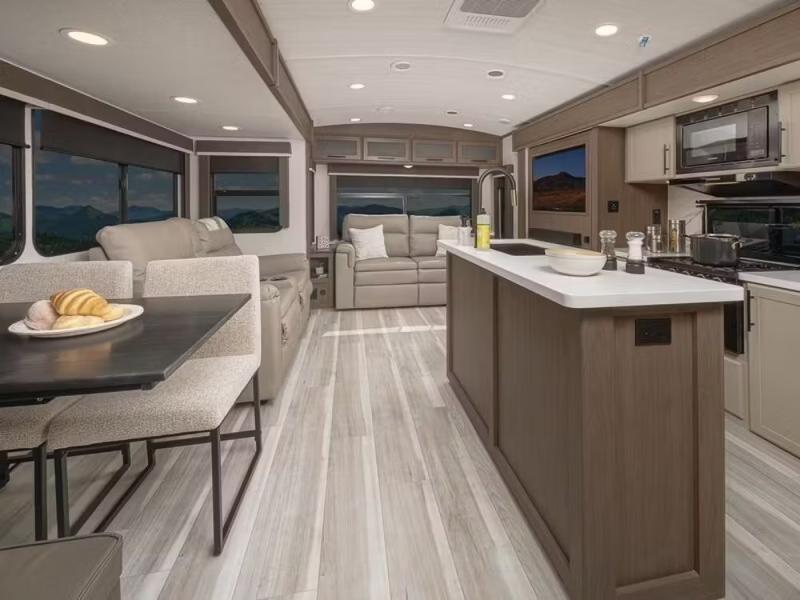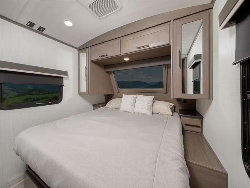 Trips spent in this travel trailer are sure to bring memories! The dual opposing slides in the combined kitchen and living area provide your crew with plenty of space to relax on the theater seating, dine at the dinette table, and prep meals with the kitchen island. There is also a tri-fold sleeper sofa here for guests and a pivoting entertainment center with a hidden pantry to keep snacks stocked. And a second pantry and hutch provides even more storage! You'll love having your own private bedroom up front, complete with a king bed, dual bedside drawers and nightstands and additional storage drawers to keep your space tidy. Outside, you'll find two power awnings, a 2" accessory hitch, and a drop frame pass-thru storage for fishing poles, hiking gear, and more!