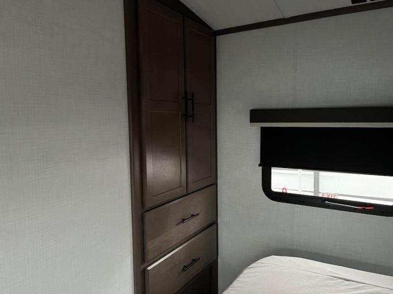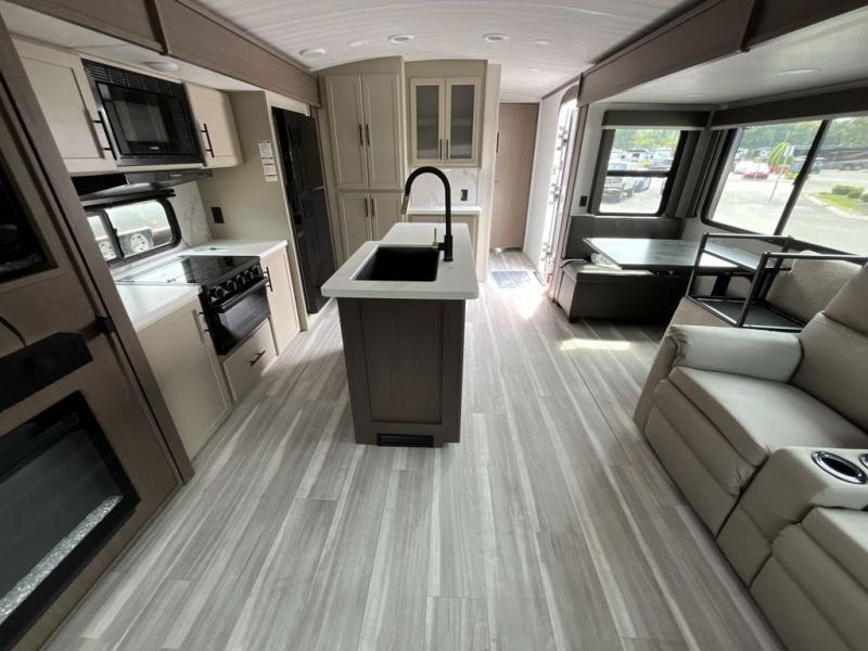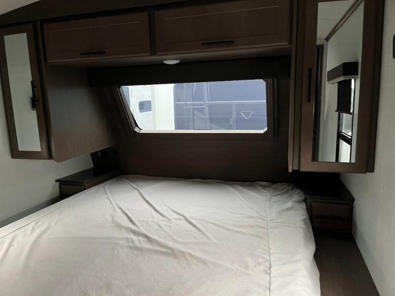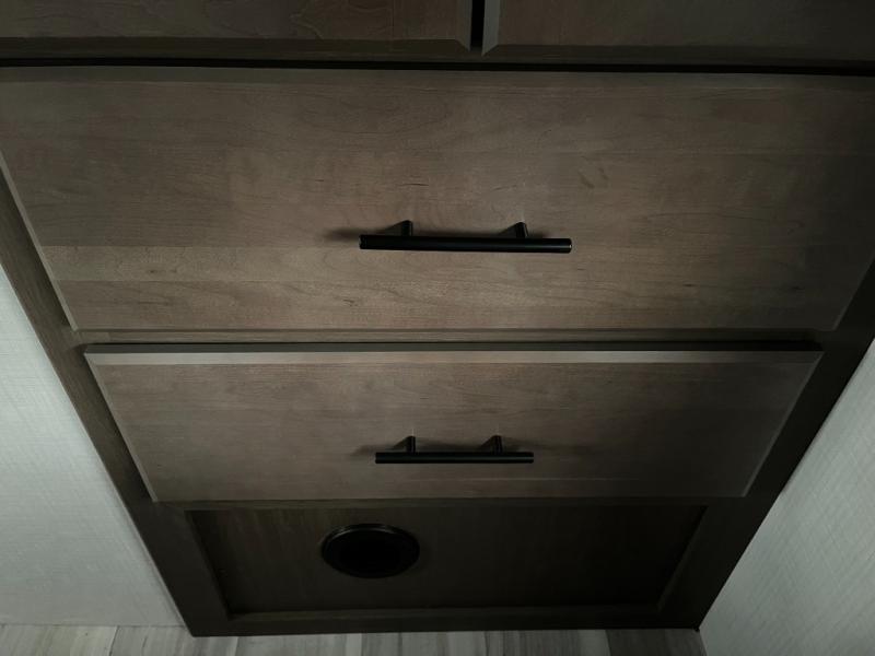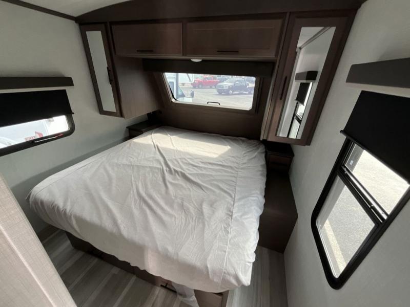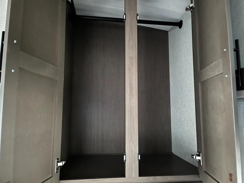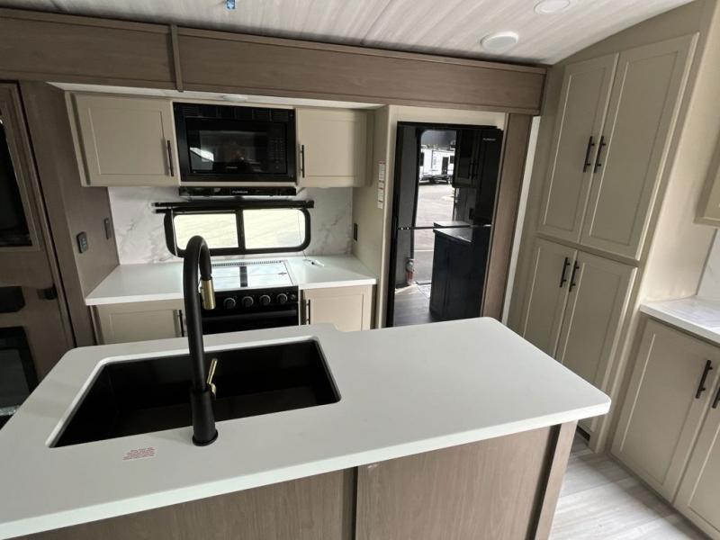 Trips spent in this travel trailer are sure to bring memories! The dual opposing slides in the combined kitchen and living area provide your crew with plenty of space to relax on the theater seating, dine at the dinette table, and prep meals with the kitchen island. There is also a tri-fold sleeper sofa here for guests and a pivoting entertainment center with a hidden pantry to keep snacks stocked. And a second pantry and hutch provides even more storage! You'll love having your own private bedroom up front, complete with a king bed, dual bedside drawers and nightstands and additional storage drawers to keep your space tidy. Outside, you'll find two power awnings, a 2" accessory hitch, and a drop frame pass-thru storage for fishing poles, hiking gear, and more!
