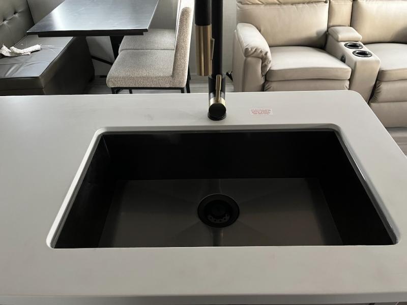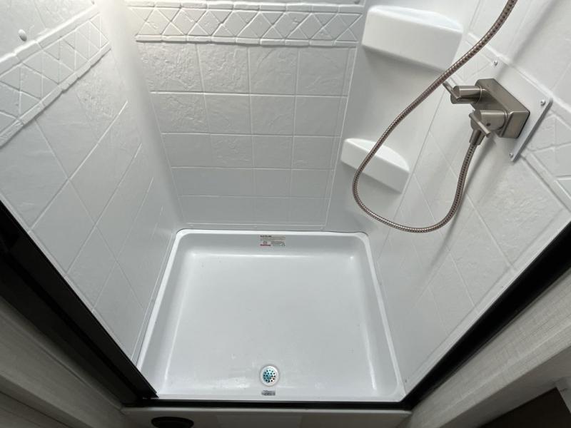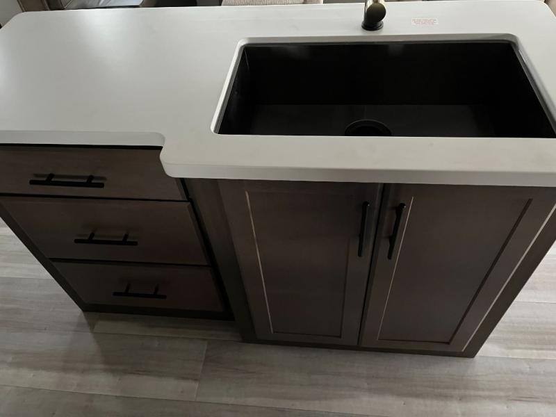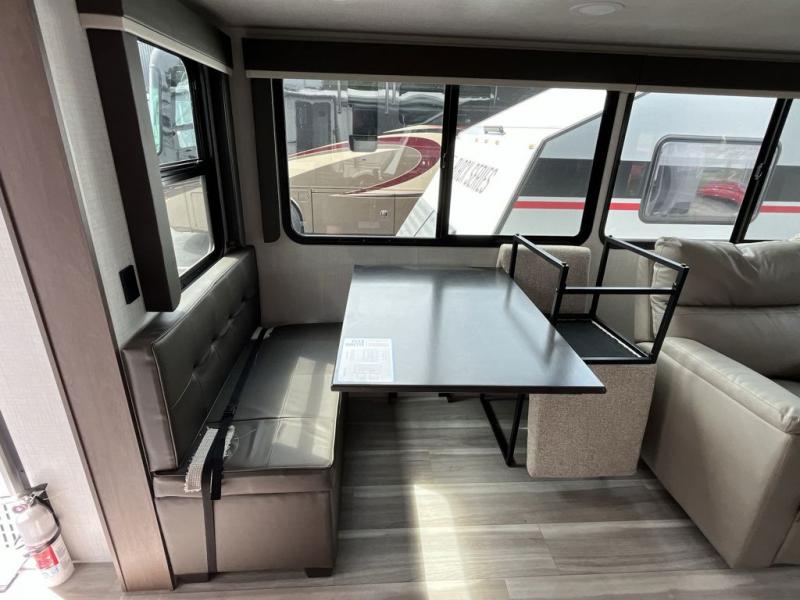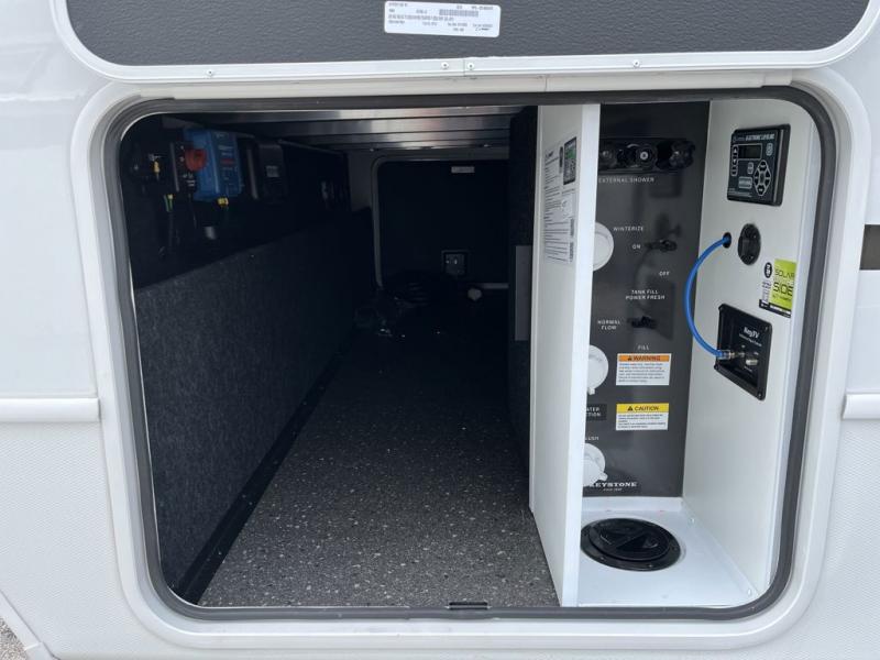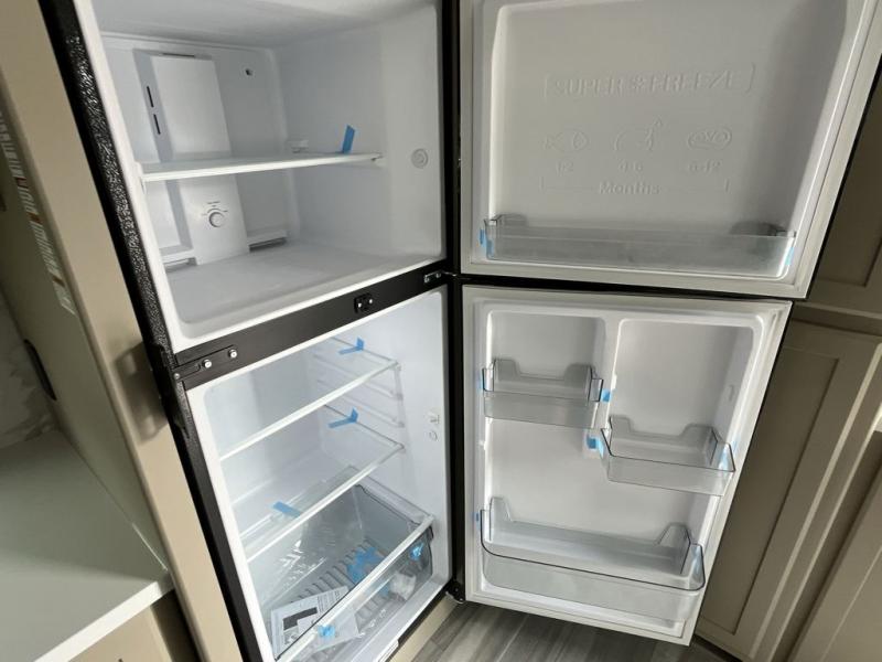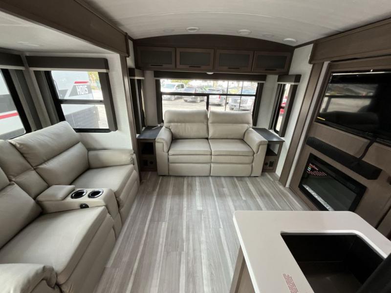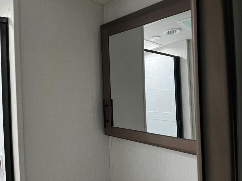 Trips spent in this travel trailer are sure to bring memories! The dual opposing slides in the combined kitchen and living area provide your crew with plenty of space to relax on the theater seating, dine at the dinette table, and prep meals with the kitchen island. There is also a tri-fold sleeper sofa here for guests and a pivoting entertainment center with a hidden pantry to keep snacks stocked. And a second pantry and hutch provides even more storage! You'll love having your own private bedroom up front, complete with a king bed, dual bedside drawers and nightstands and additional storage drawers to keep your space tidy. Outside, you'll find two power awnings, a 2" accessory hitch, and a drop frame pass-thru storage for fishing poles, hiking gear, and more!