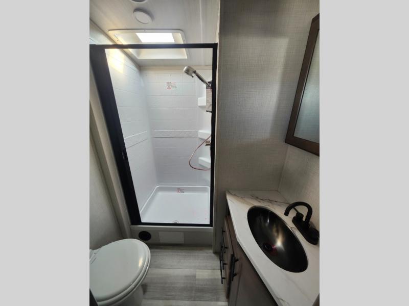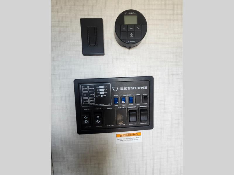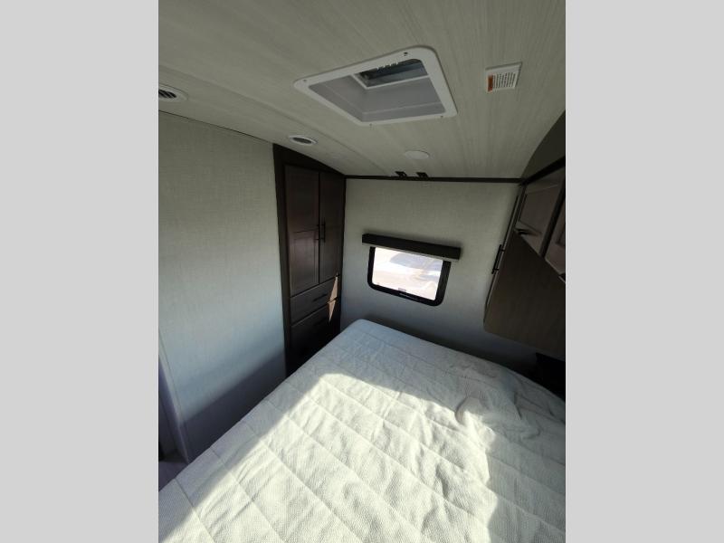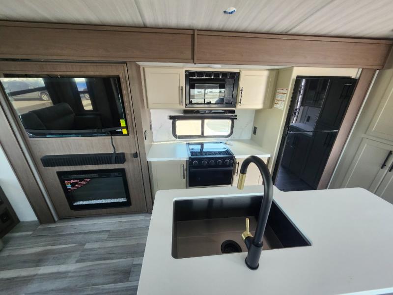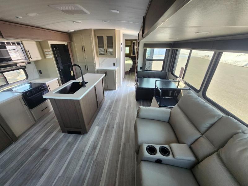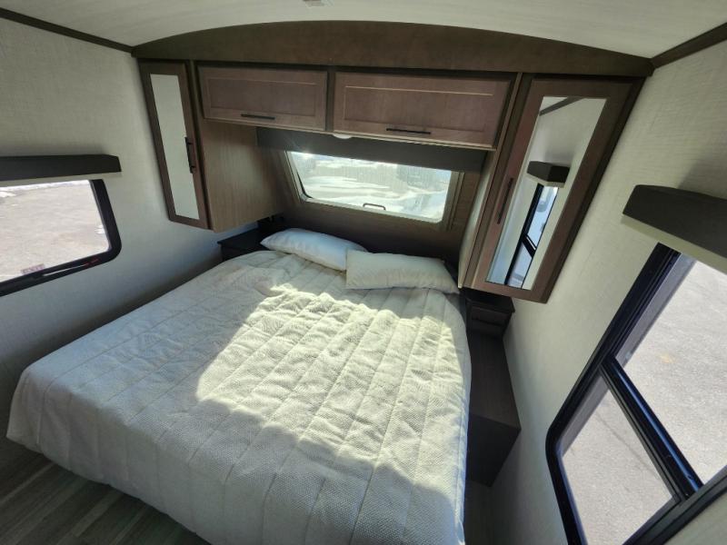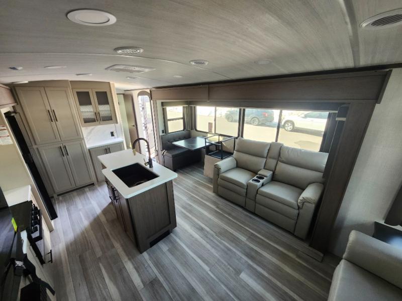 Trips spent in this travel trailer are sure to bring memories! The dual opposing slides in the combined kitchen and living area provide your crew with plenty of space to relax on the theater seating, dine at the dinette table, and prep meals with the kitchen island. There is also a tri-fold sleeper sofa here for guests and a pivoting entertainment center with a hidden pantry to keep snacks stocked. And a second pantry and hutch provides even more storage! You'll love having your own private bedroom up front, complete with a king bed, dual bedside drawers and nightstands and additional storage drawers to keep your space tidy. Outside, you'll find two power awnings, a 2" accessory hitch, and a drop frame pass-thru storage for fishing poles, hiking gear, and more!