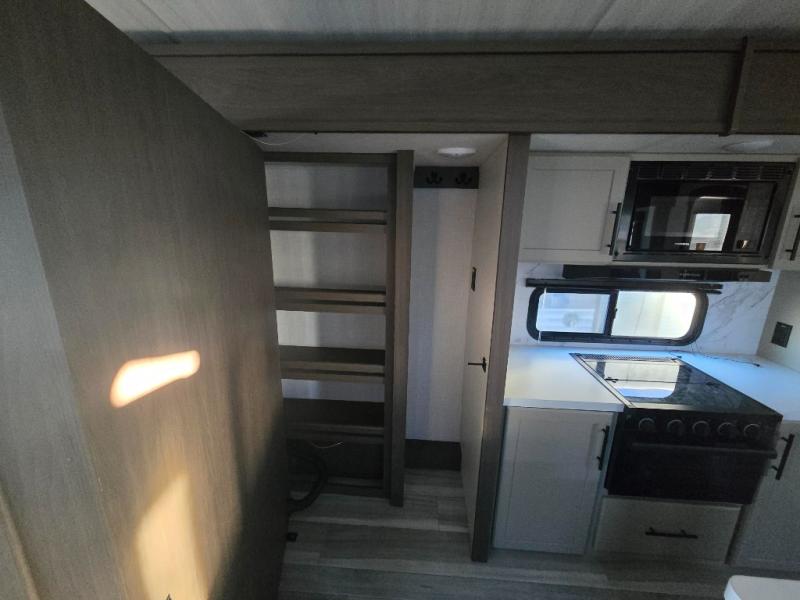 Trips spent in this travel trailer are sure to bring memories! The dual opposing slides in the combined kitchen and living area provide your crew with plenty of space to relax on the theater seating, dine at the dinette table, and prep meals with the kitchen island. There is also a tri-fold sleeper sofa here for guests and a pivoting entertainment center with a hidden pantry to keep snacks stocked. And a second pantry and hutch provides even more storage! You'll love having your own private bedroom up front, complete with a king bed, dual bedside drawers and nightstands and additional storage drawers to keep your space tidy. Outside, you'll find two power awnings, a 2" accessory hitch, and a drop frame pass-thru storage for fishing poles, hiking gear, and more!