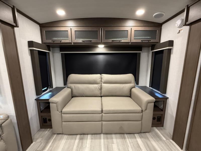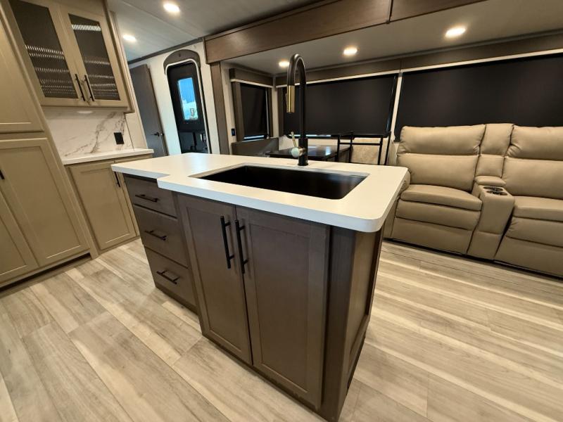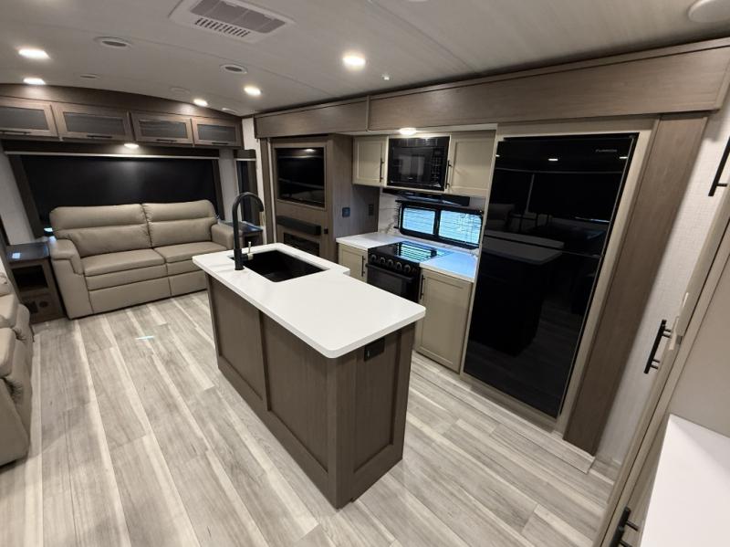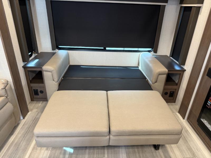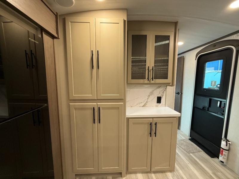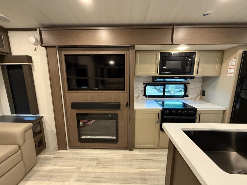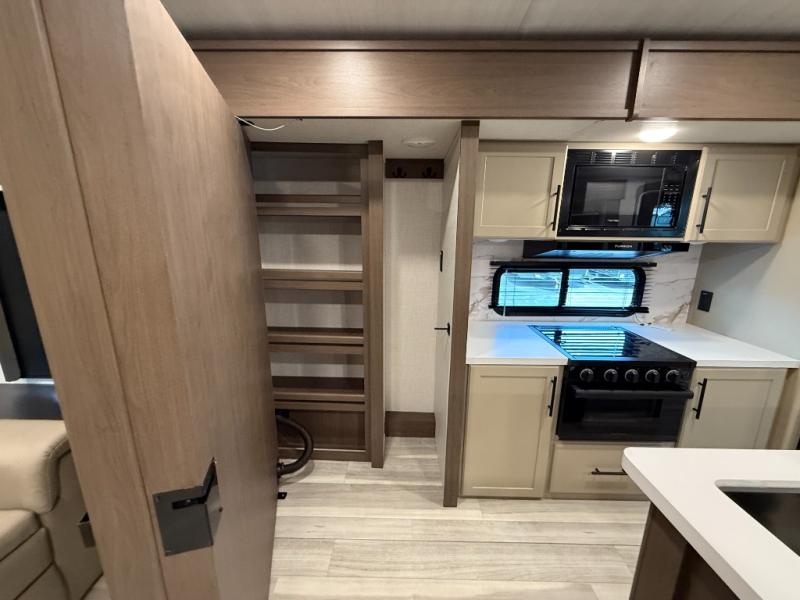 Trips spent in this travel trailer are sure to bring memories! The dual opposing slides in the combined kitchen and living area provide your crew with plenty of space to relax on the theater seating, dine at the dinette table, and prep meals with the kitchen island. There is also a tri-fold sleeper sofa here for guests and a pivoting entertainment center with a hidden pantry to keep snacks stocked. And a second pantry and hutch provides even more storage! You'll love having your own private bedroom up front, complete with a king bed, dual bedside drawers and nightstands and additional storage drawers to keep your space tidy. Outside, you'll find two power awnings, a 2" accessory hitch, and a drop frame pass-thru storage for fishing poles, hiking gear, and more!